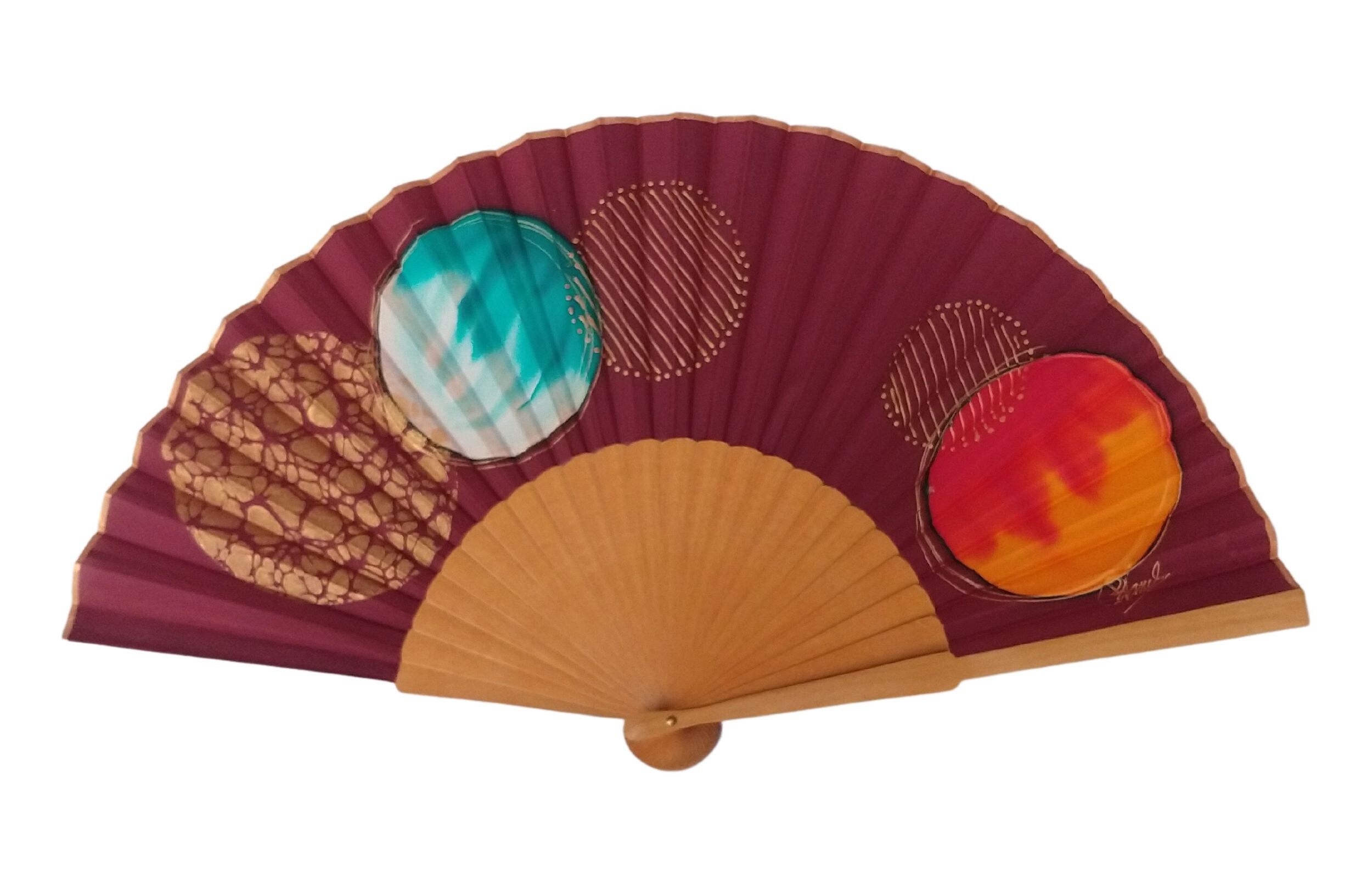 Descubra la fusión perfecta de elegancia y expresión artística con este abanico de seda pintado a mano. El fondo burdeos intenso contrasta maravillosamente con el turquesa intenso, el rojo anaranjado cálido y los detalles dorados, creando una composición abstracta y sofisticada que se siente moderna y atemporal.