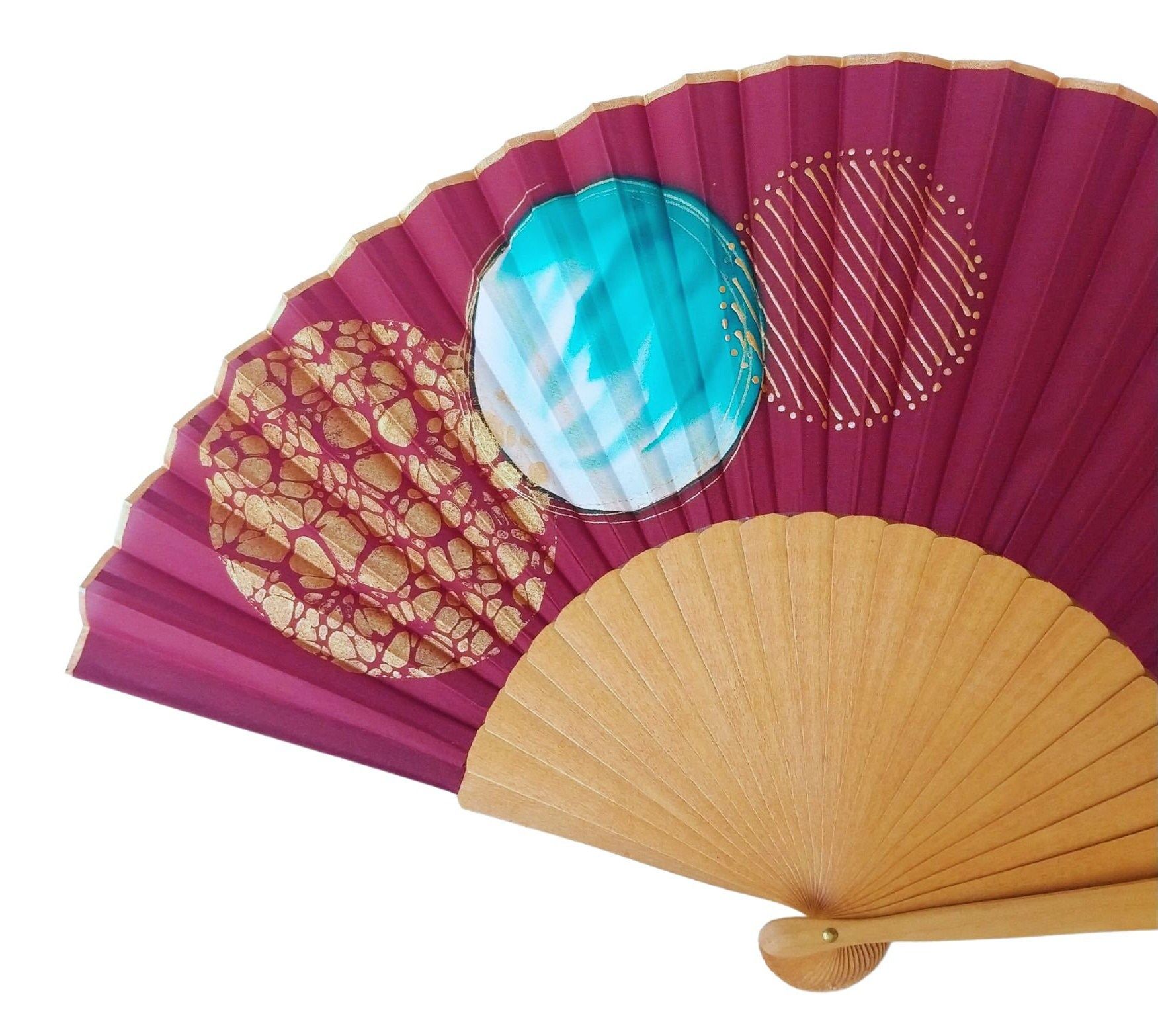 Abanico de seda burdeos de lujo / Abanico plegable abstracto pintado a mano con oro y turquesa / Regalo artístico único