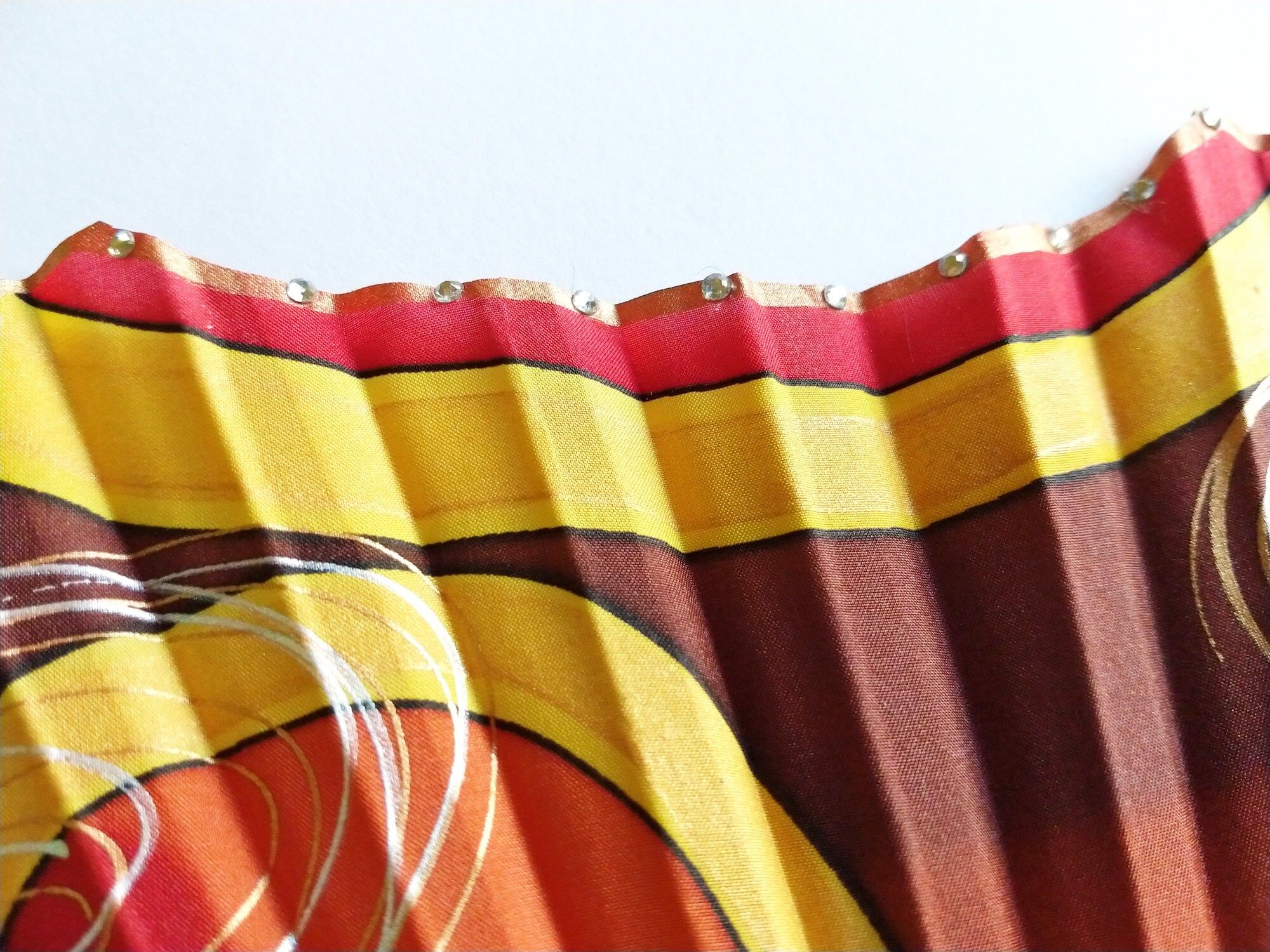 ·Una paleta de colores atrevidos y cálidos con acentos dorados: un abanico que irradia energía y elegancia.
