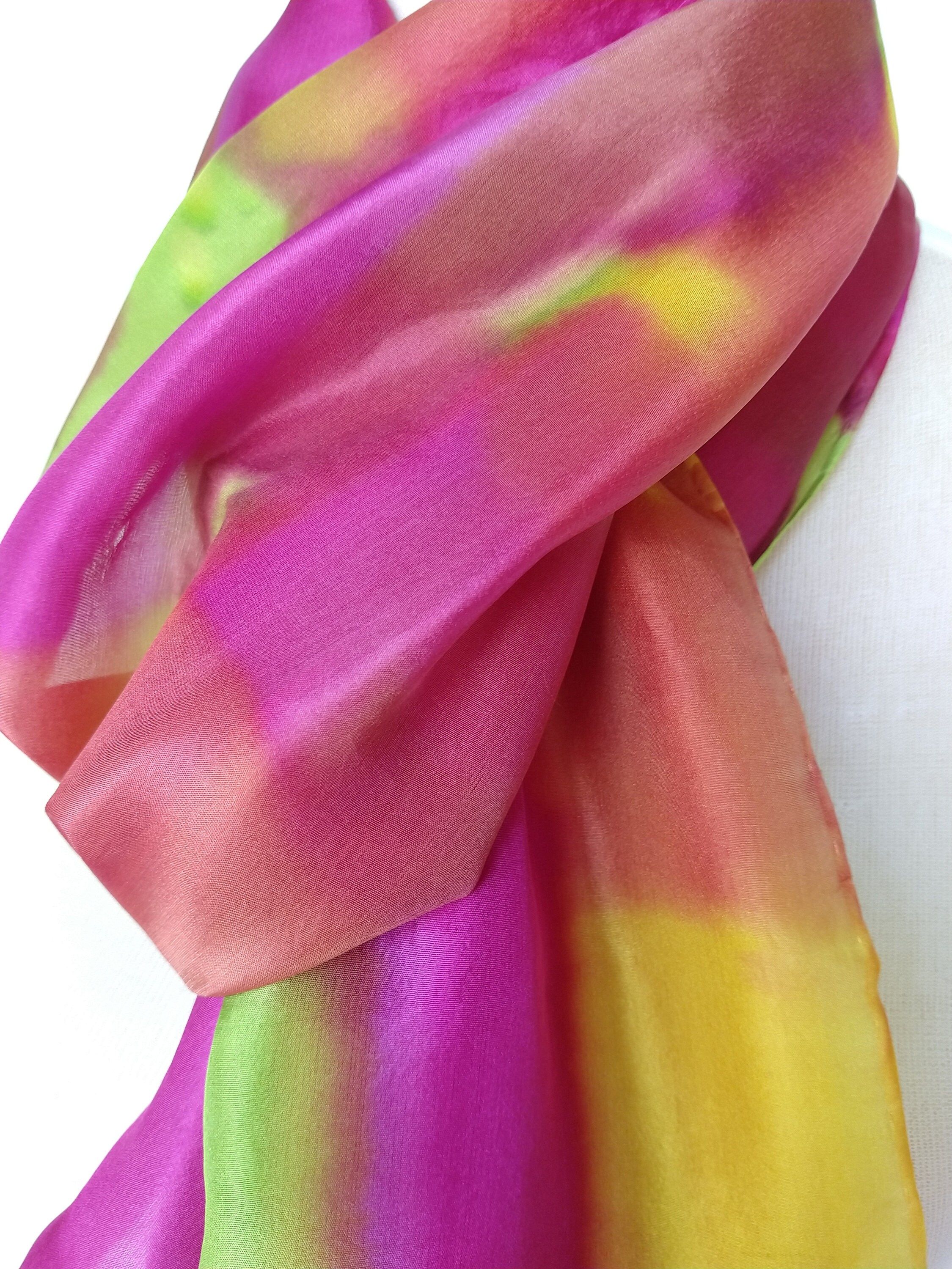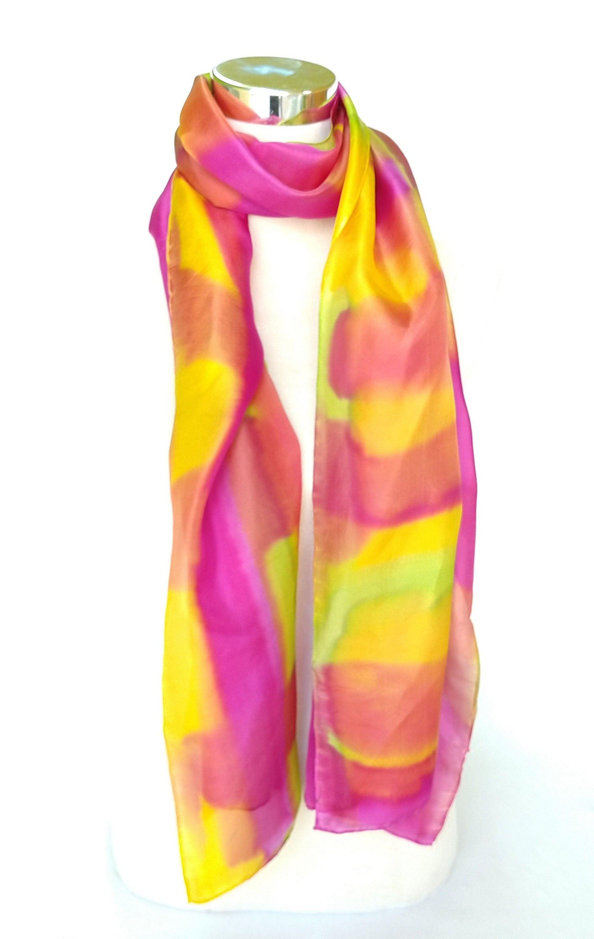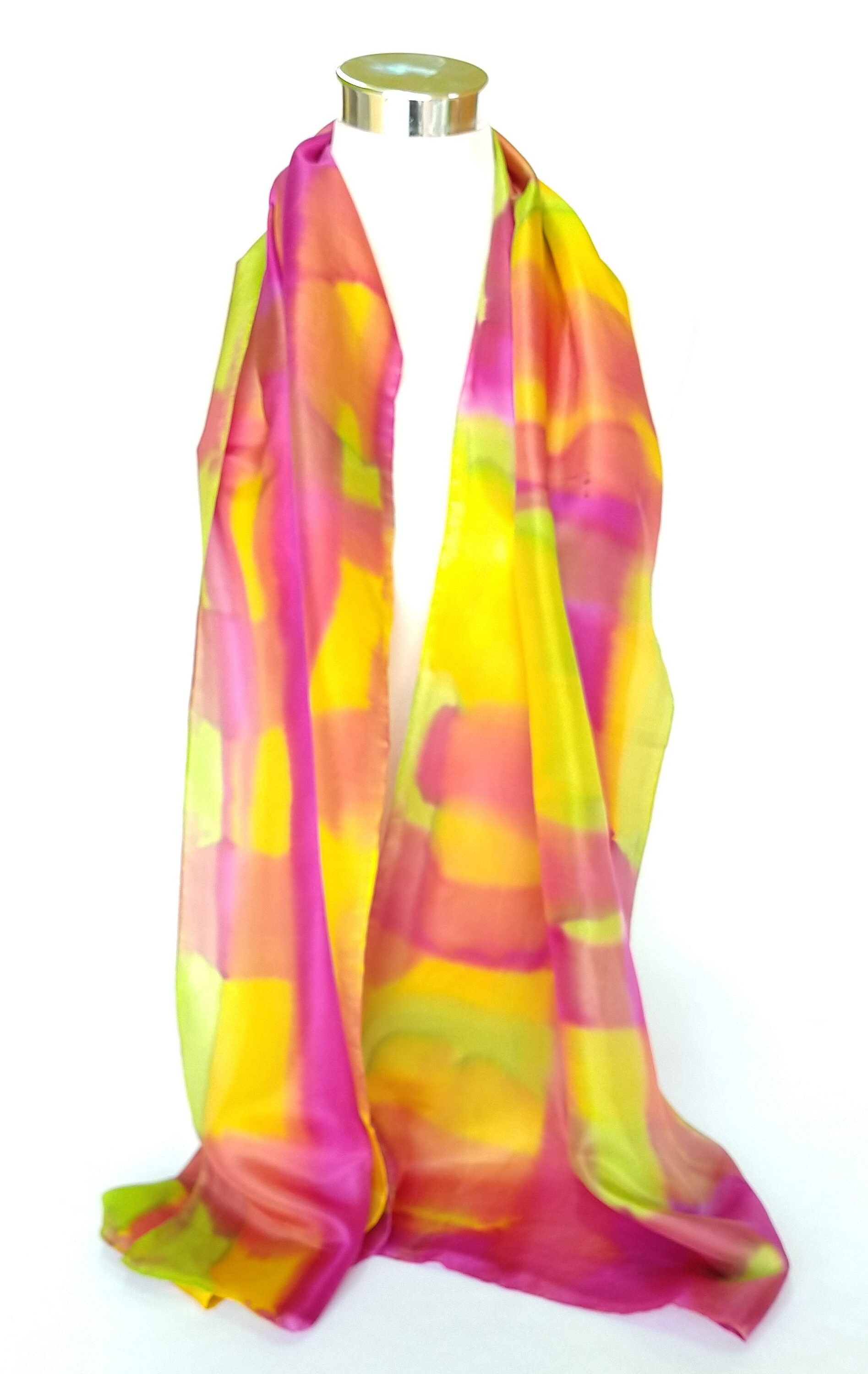 Bufanda de seda colorida con estampados en amarillo y fucsia: arte elegante para llevar puesto - 18 x 72 pulgadas