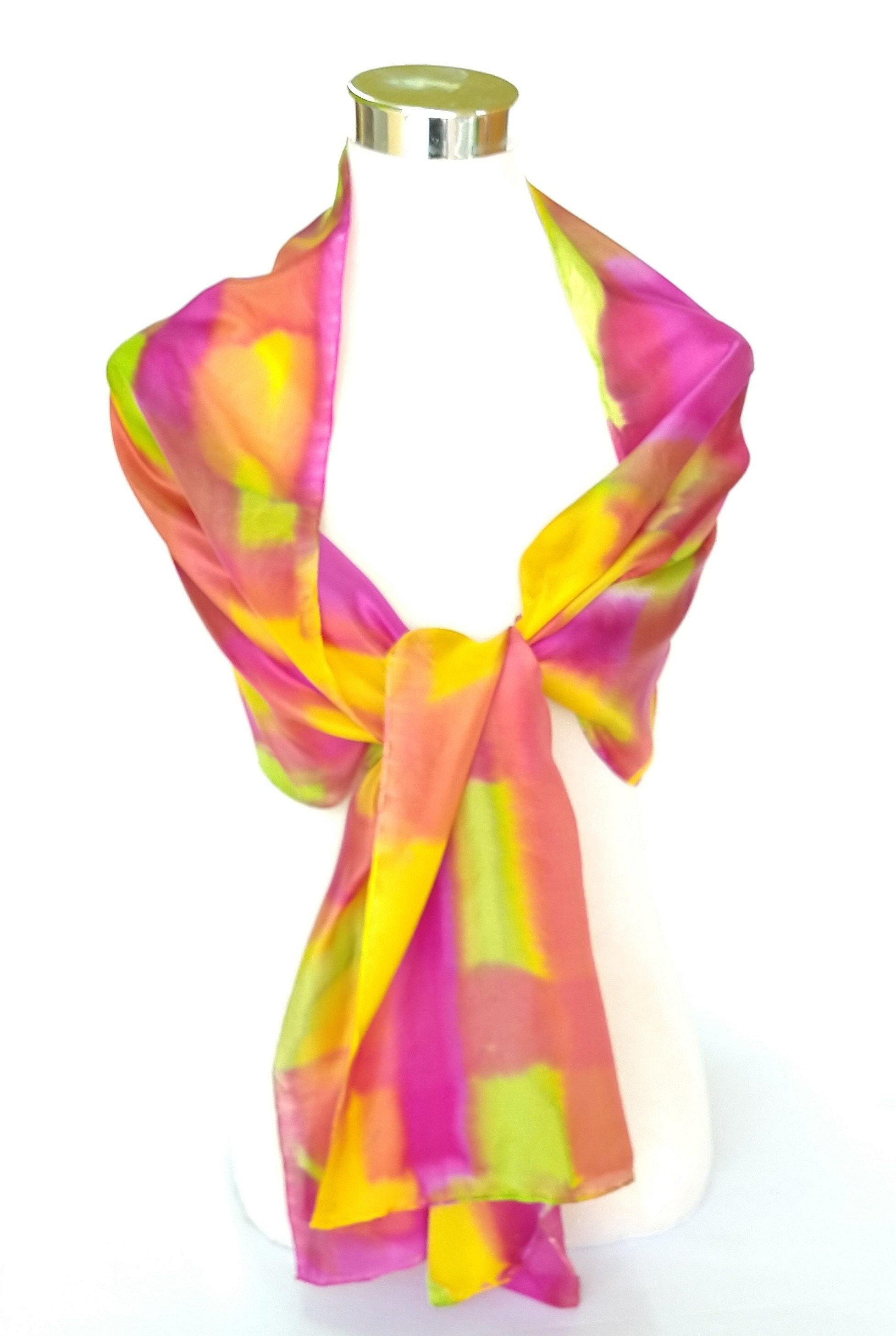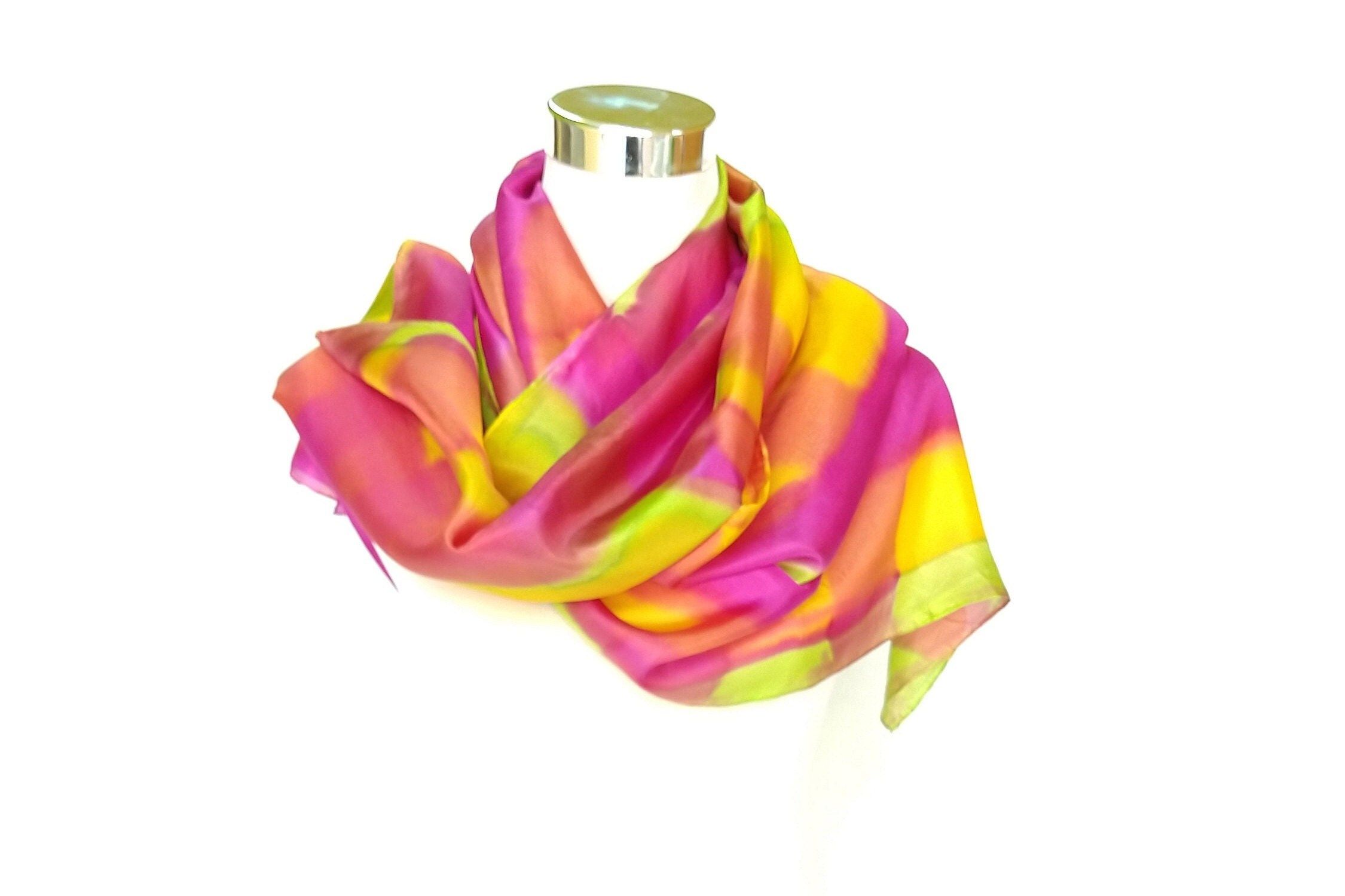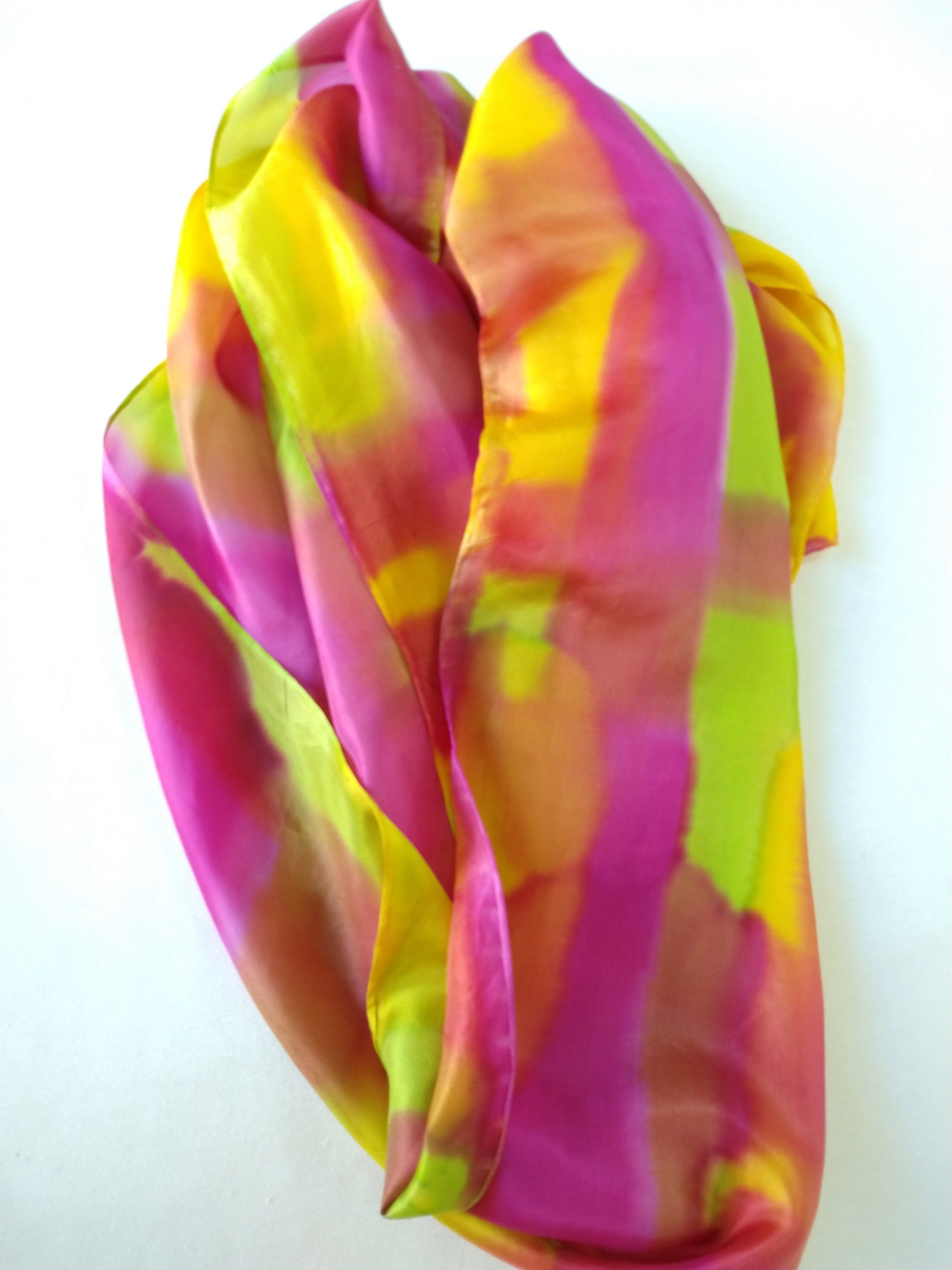 Bufanda de seda colorida con estampados en amarillo y fucsia: arte elegante para llevar puesto - 18 x 72 pulgadas