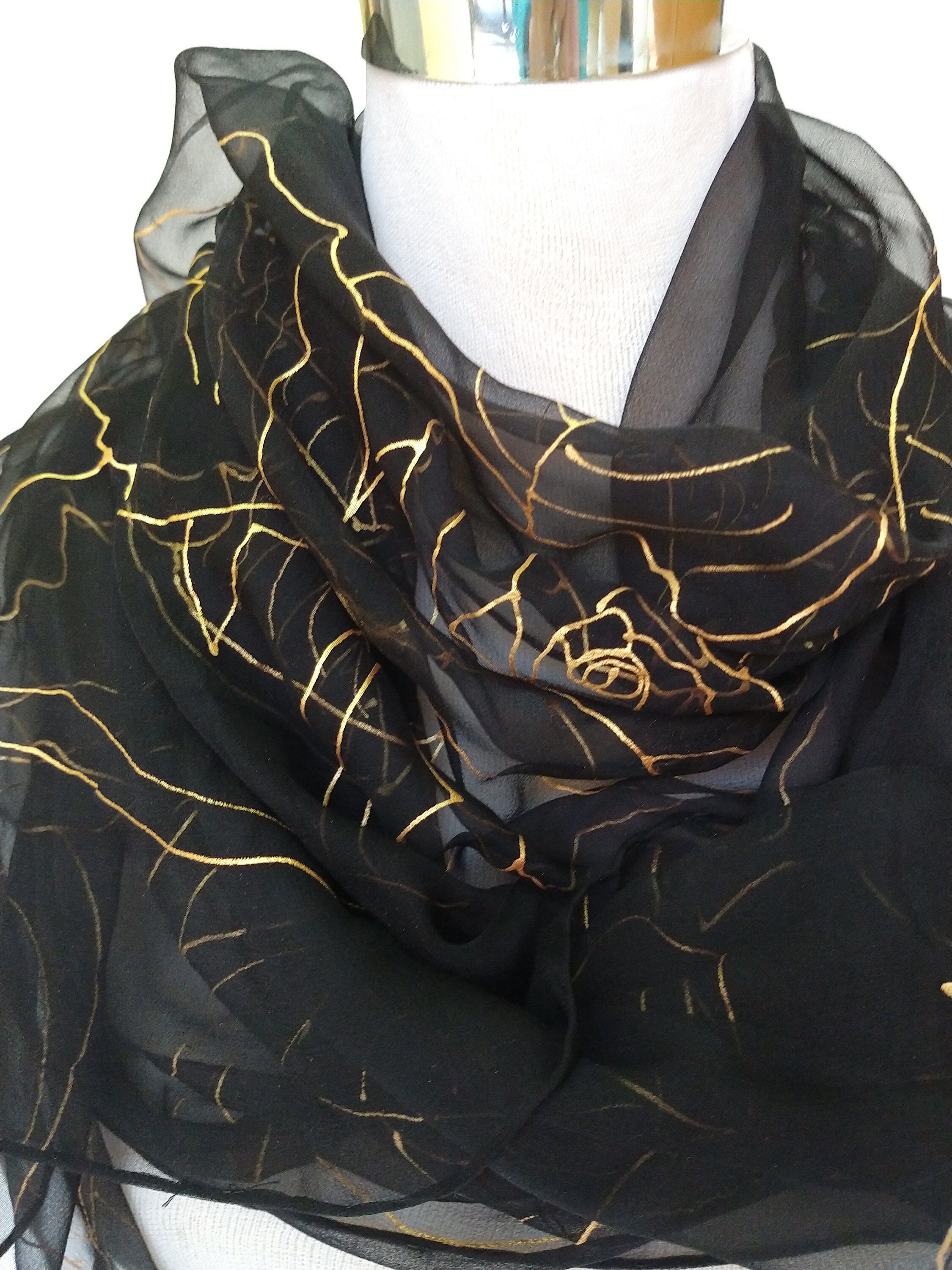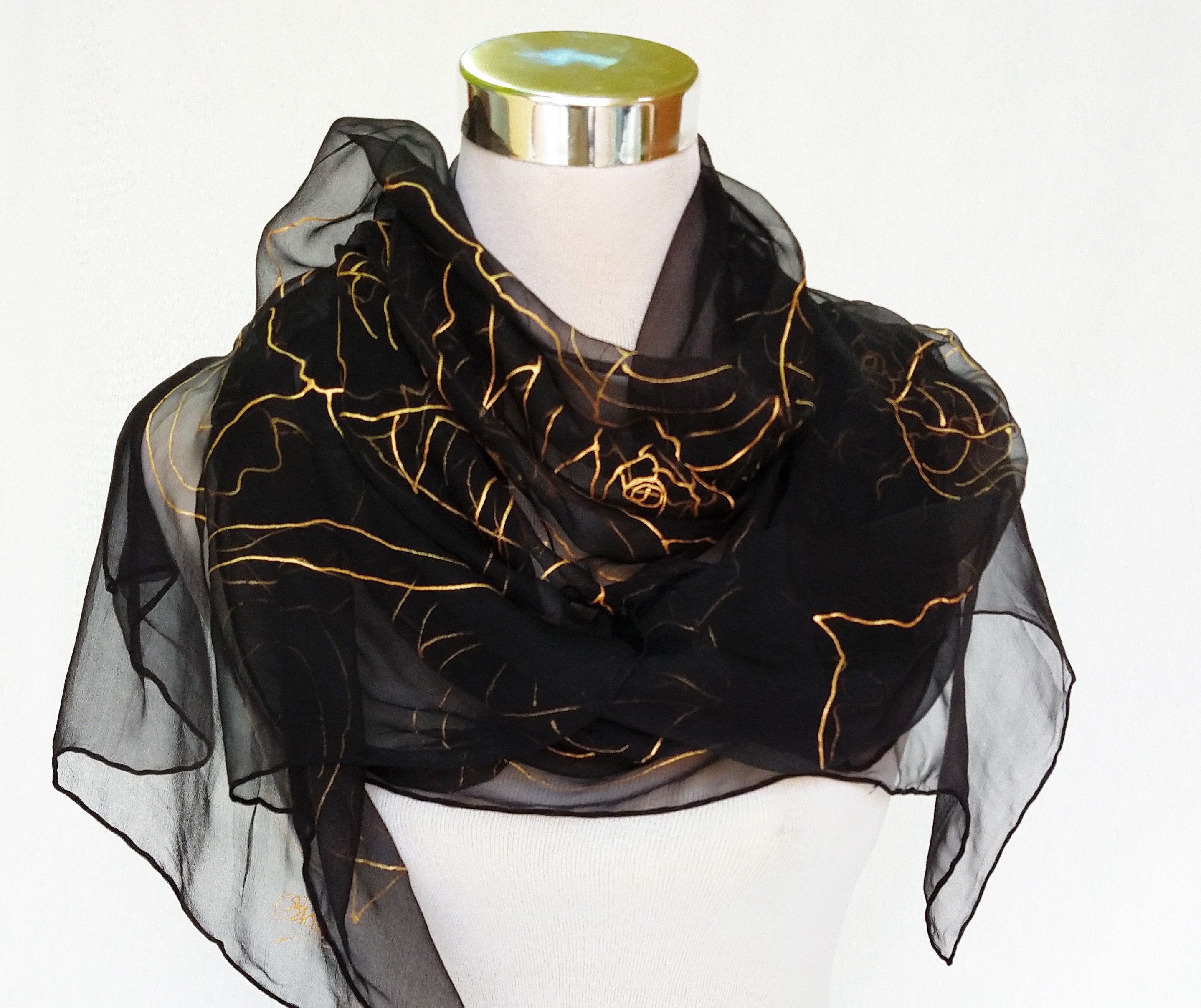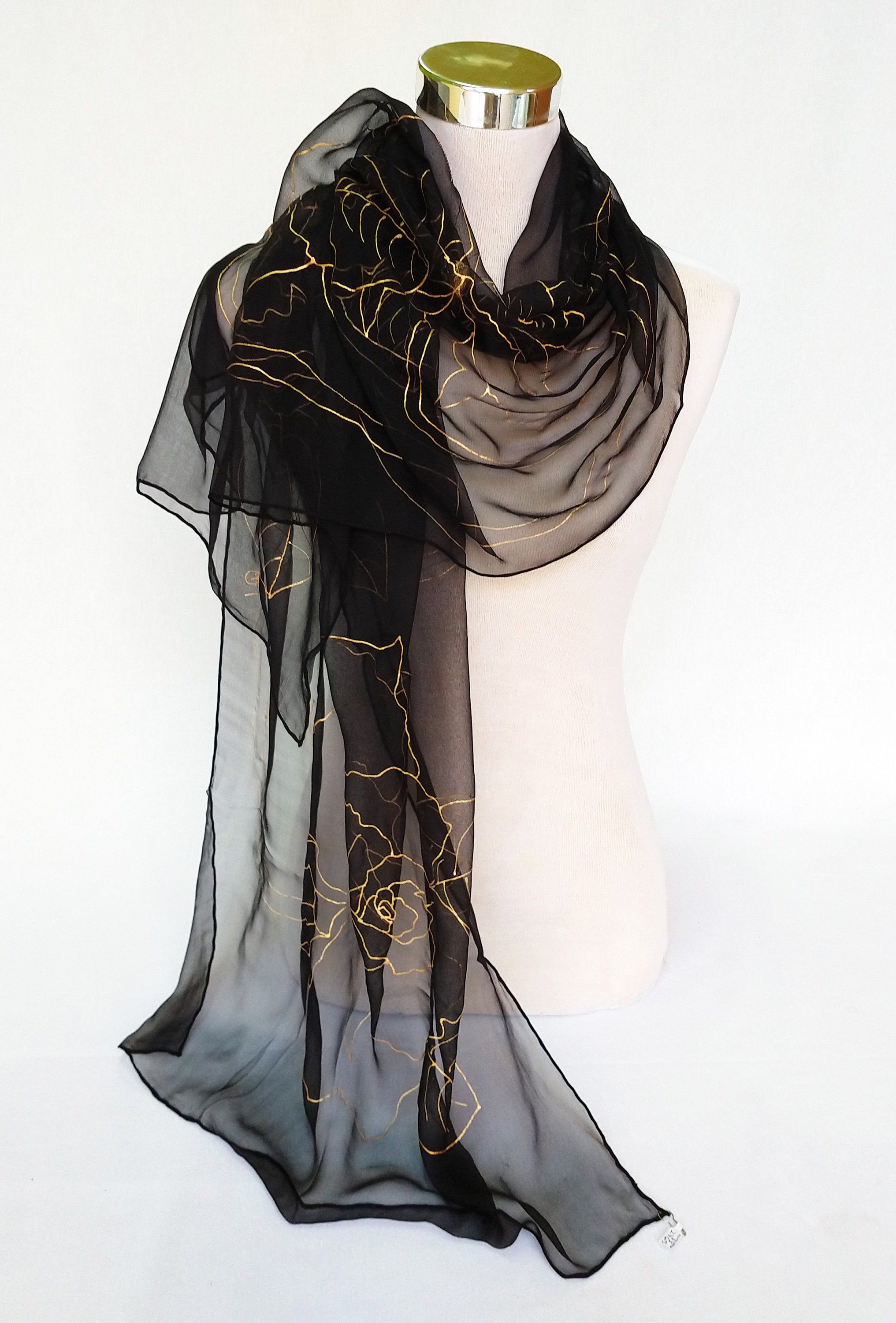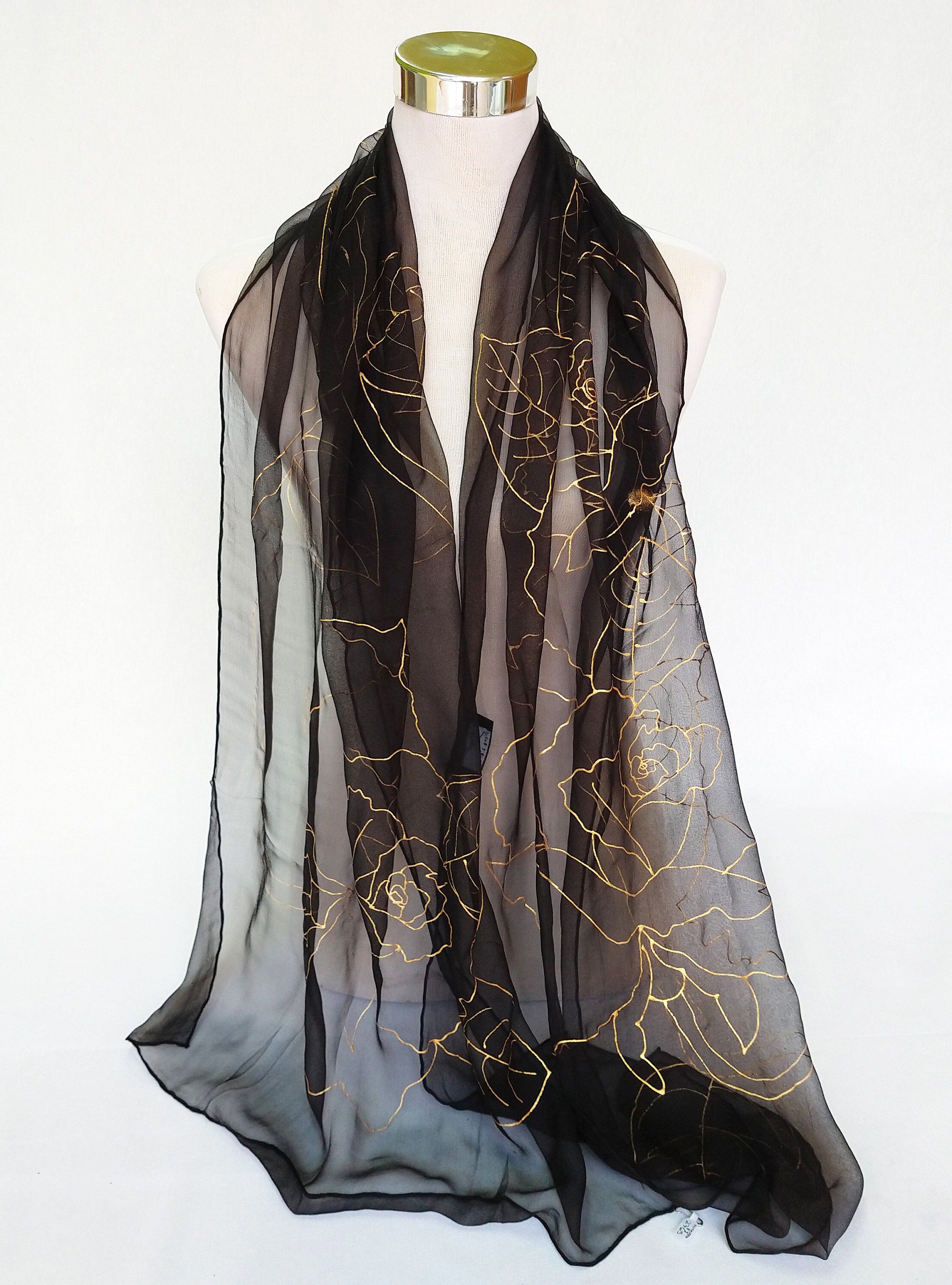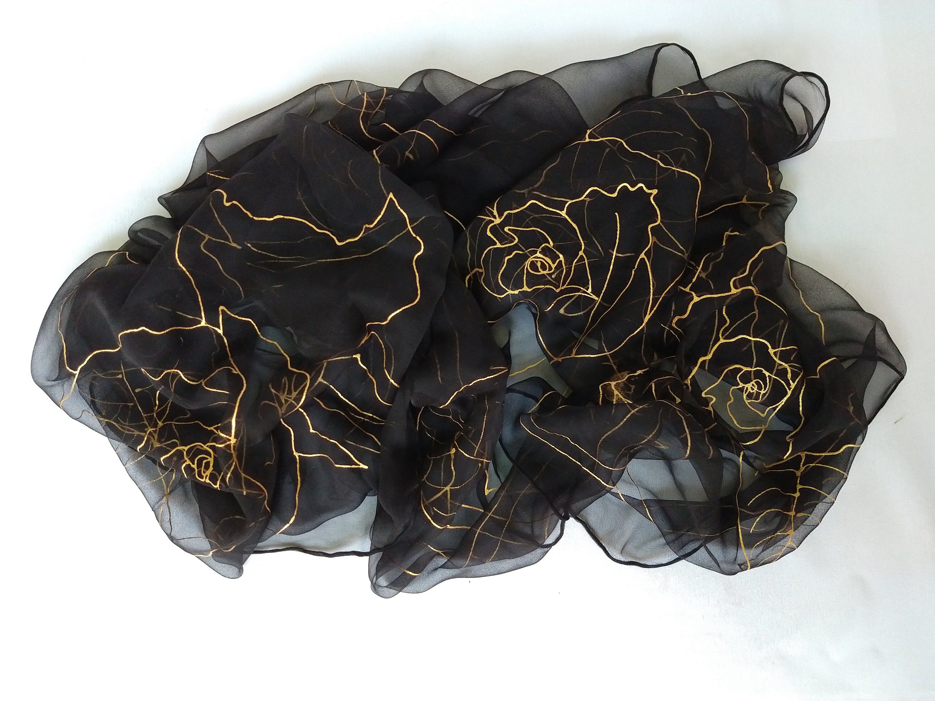 Bufanda de seda floral de lujo, chal pintado a mano negro, bufanda de seda de flores grandes, envoltura de boda de verano, regalo de la madre de la novia
