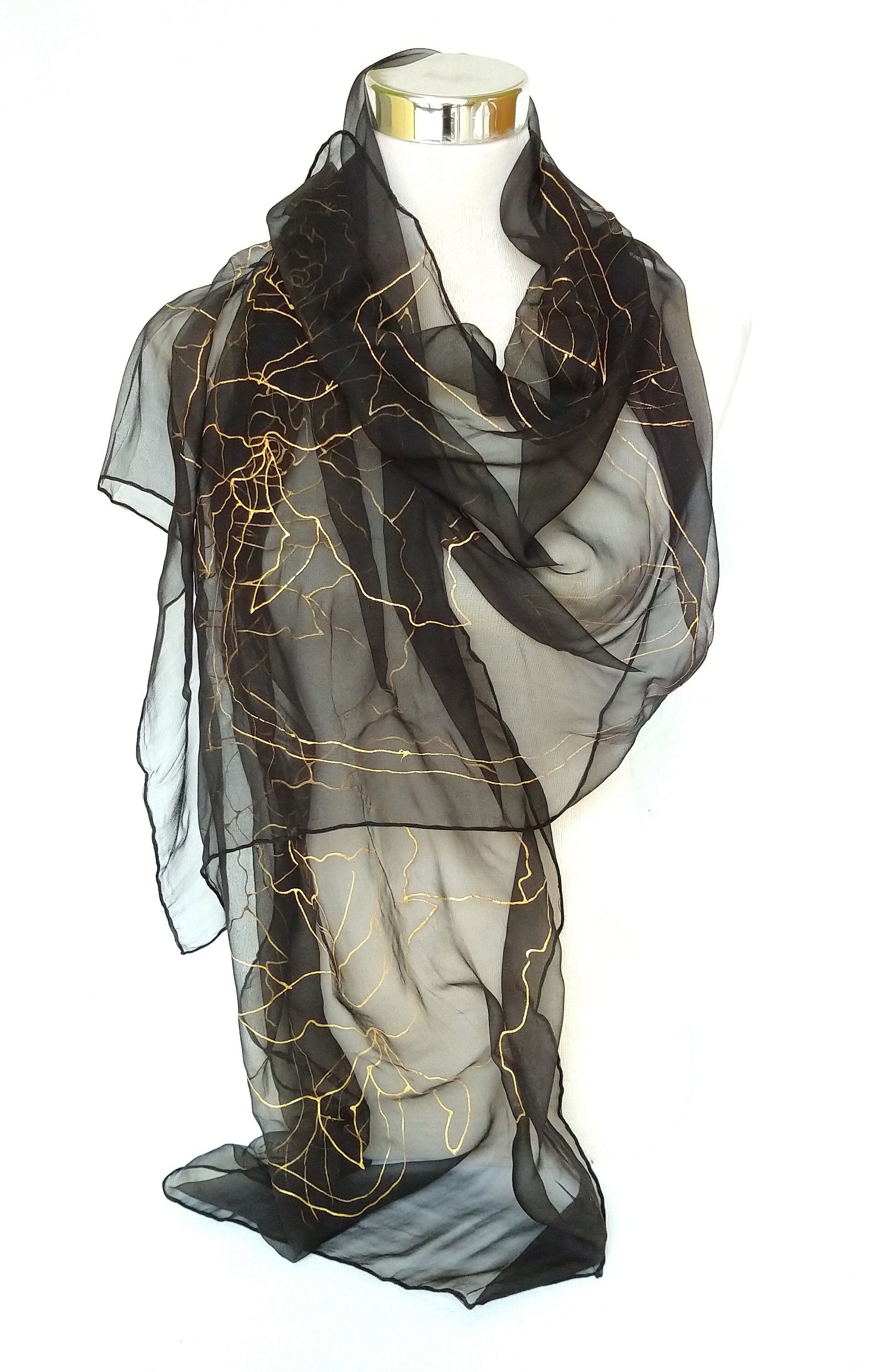 Personalmente pinto a mano cada pañuelo de seda, uno a la vez, en mi estudio ubicado en la hermosa ciudad de Barcelona en Europa y nunca uso plantillas. Las sedas que creo son únicas en este planeta.