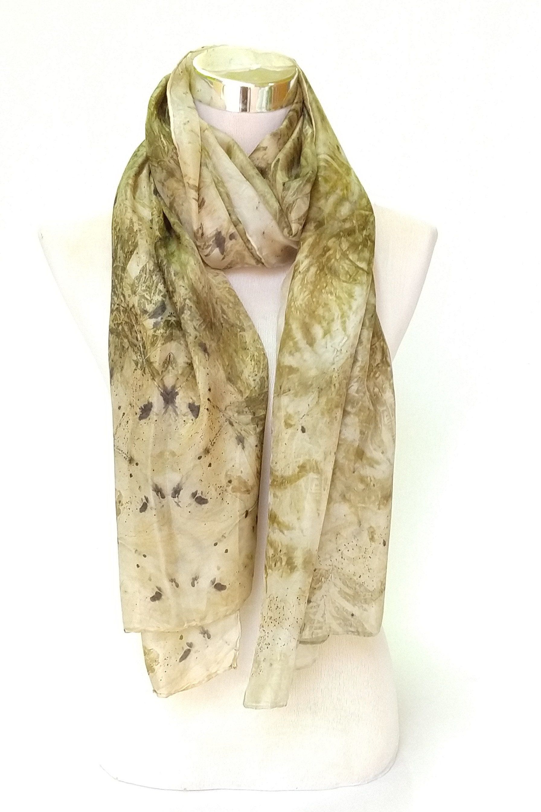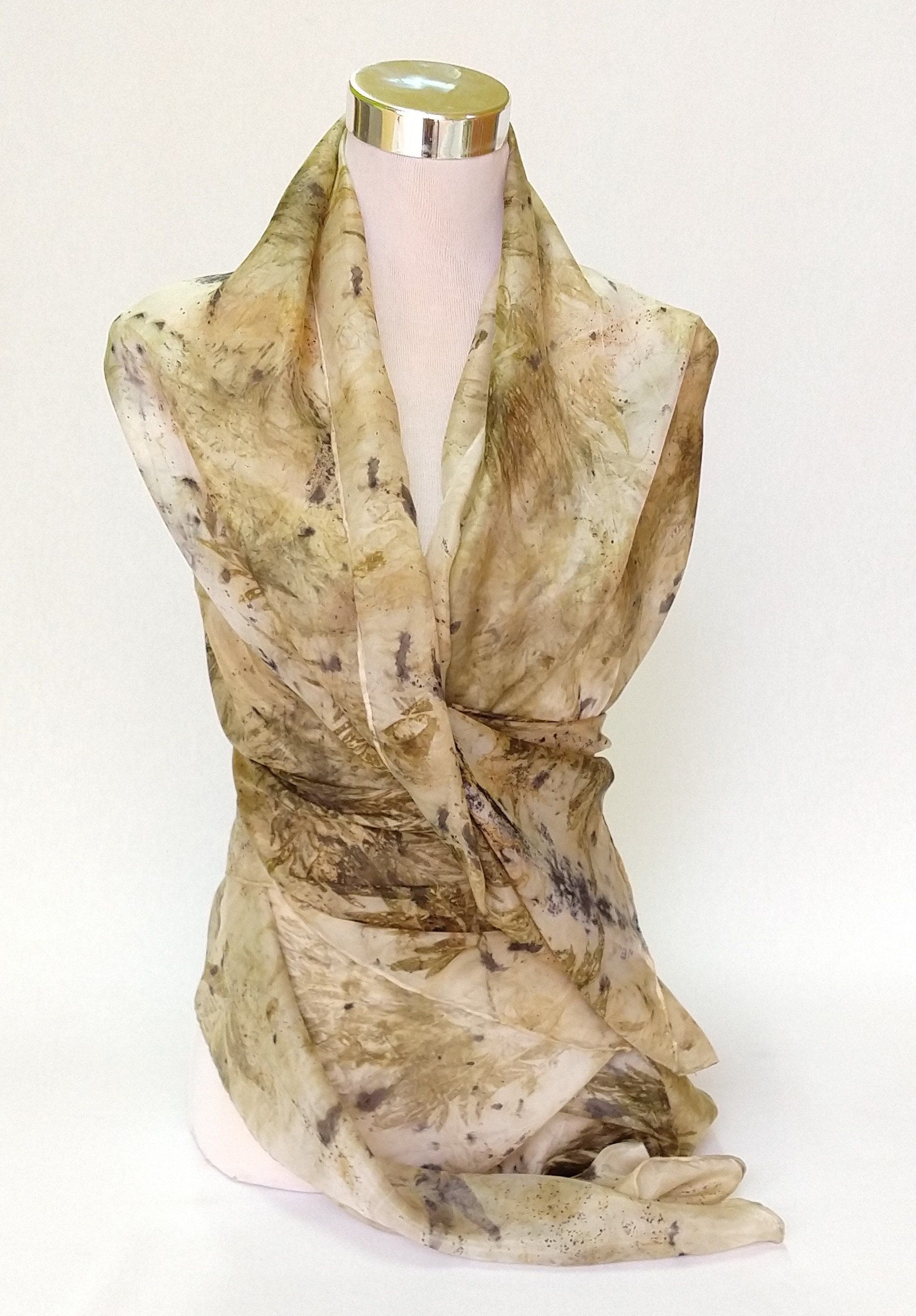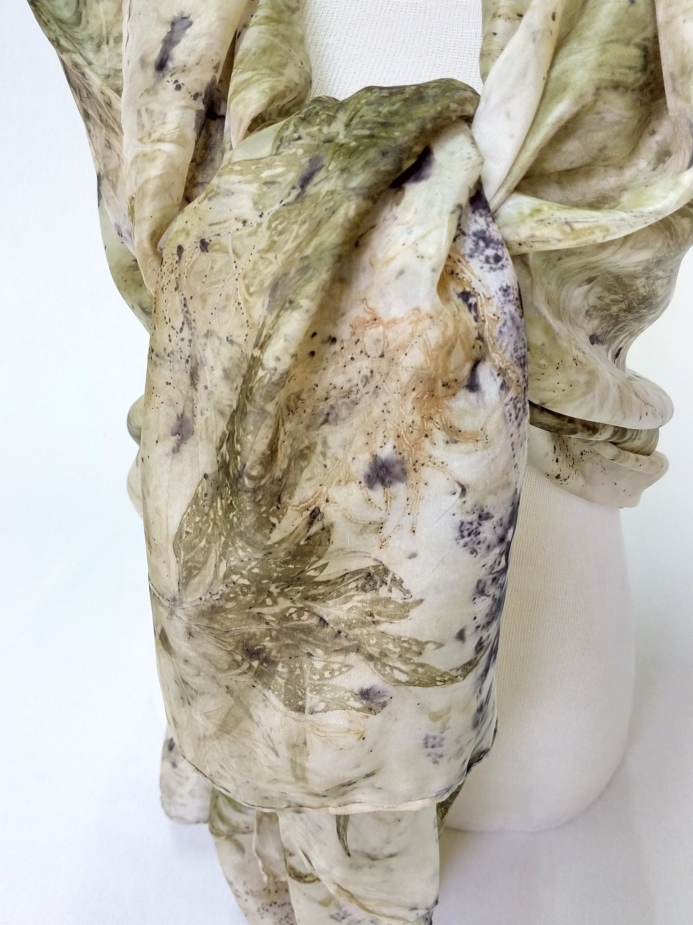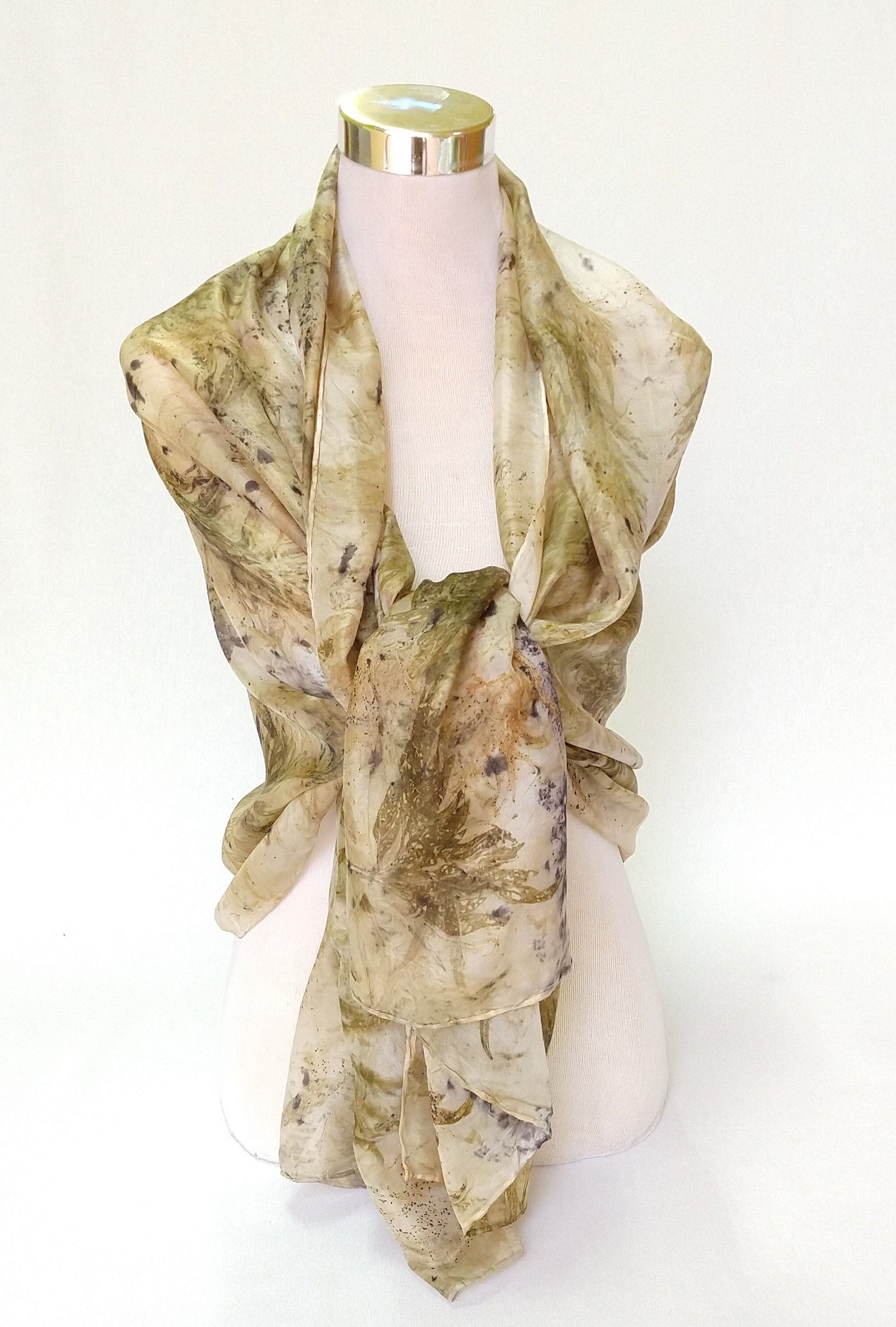 Bufanda de seda floral hecha a mano, chal de seda grande hecho con hojas de árboles, regalo para mujeres amantes de la botánica y la naturaleza, 72x36 pulgadas