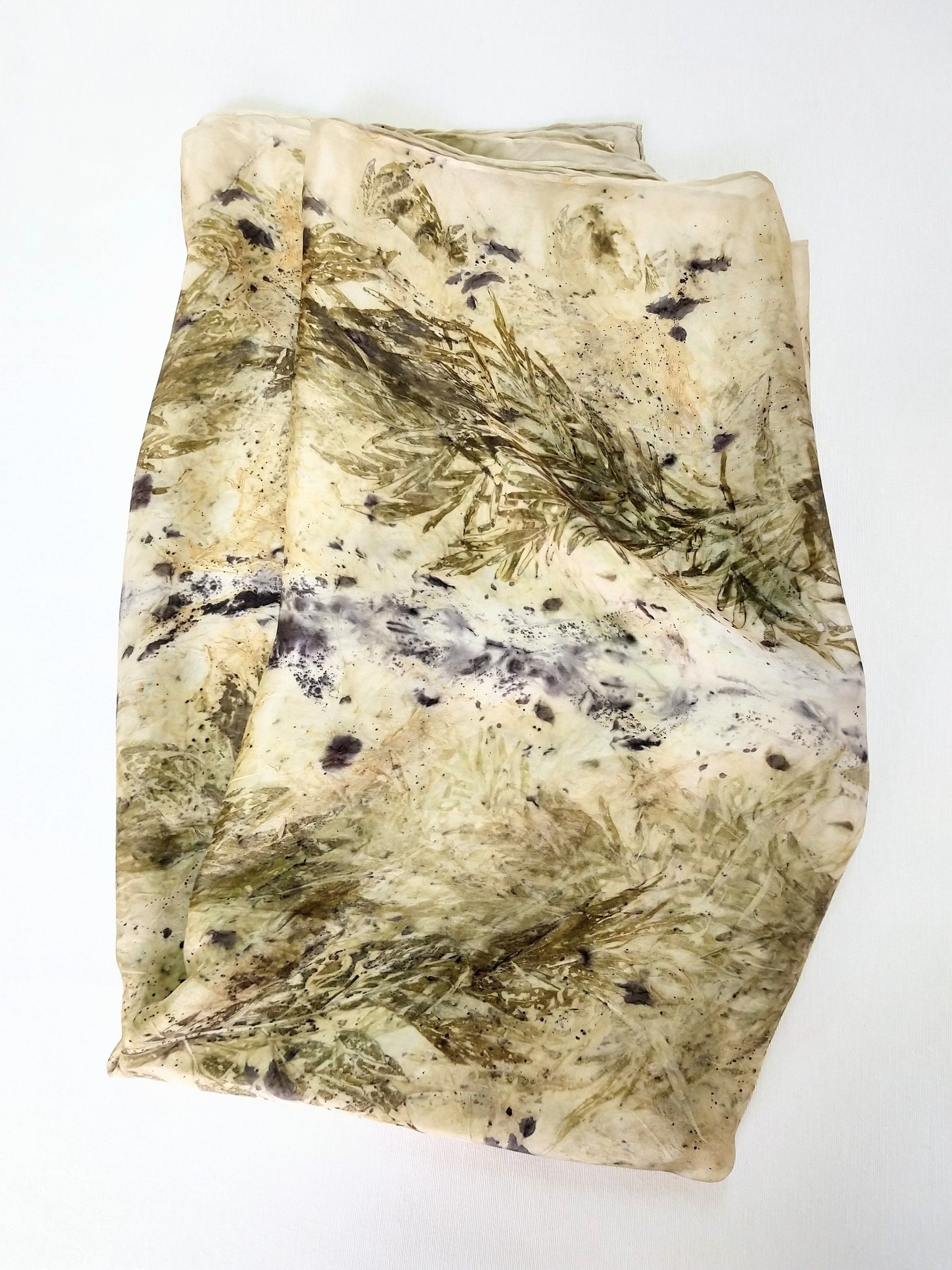 Esta pieza está realizada a mano, con mucho cariño y cuidado, mediante un método llamado ecoimpresión. Hago y tiño a mano hilos naturales, con los colores de la naturaleza: pétalos y hojas de flores, vegetales, especias y tintes naturales. La ecoimpresión se realiza colocando los materiales de tinte a mano y luego teñiendo en paquetes, y cada uno tarda un mínimo de 5 horas, a lo largo de dos días, en completarse.