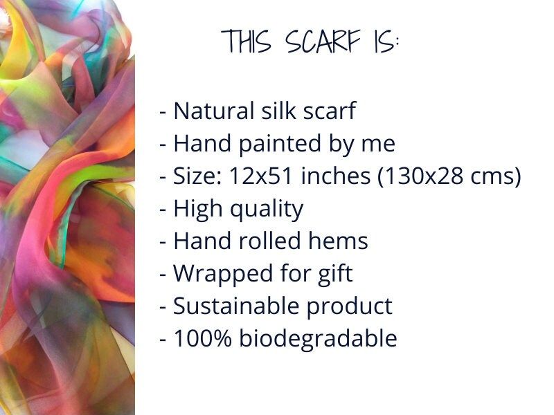 Más que una bufanda, es un arte para llevar puesto o “arte para llevar” y se refiere a piezas diseñadas individualmente hechas a mano y generalmente únicas. Hice a mano esta hermosa bufanda de seda con mucho cuidado y dedicación. Mis bufandas hechas a mano con amor no son productos producidos en masa. Si una bufanda tiene una ligera imperfección, recuerde disfrutar de la mano de un artista.