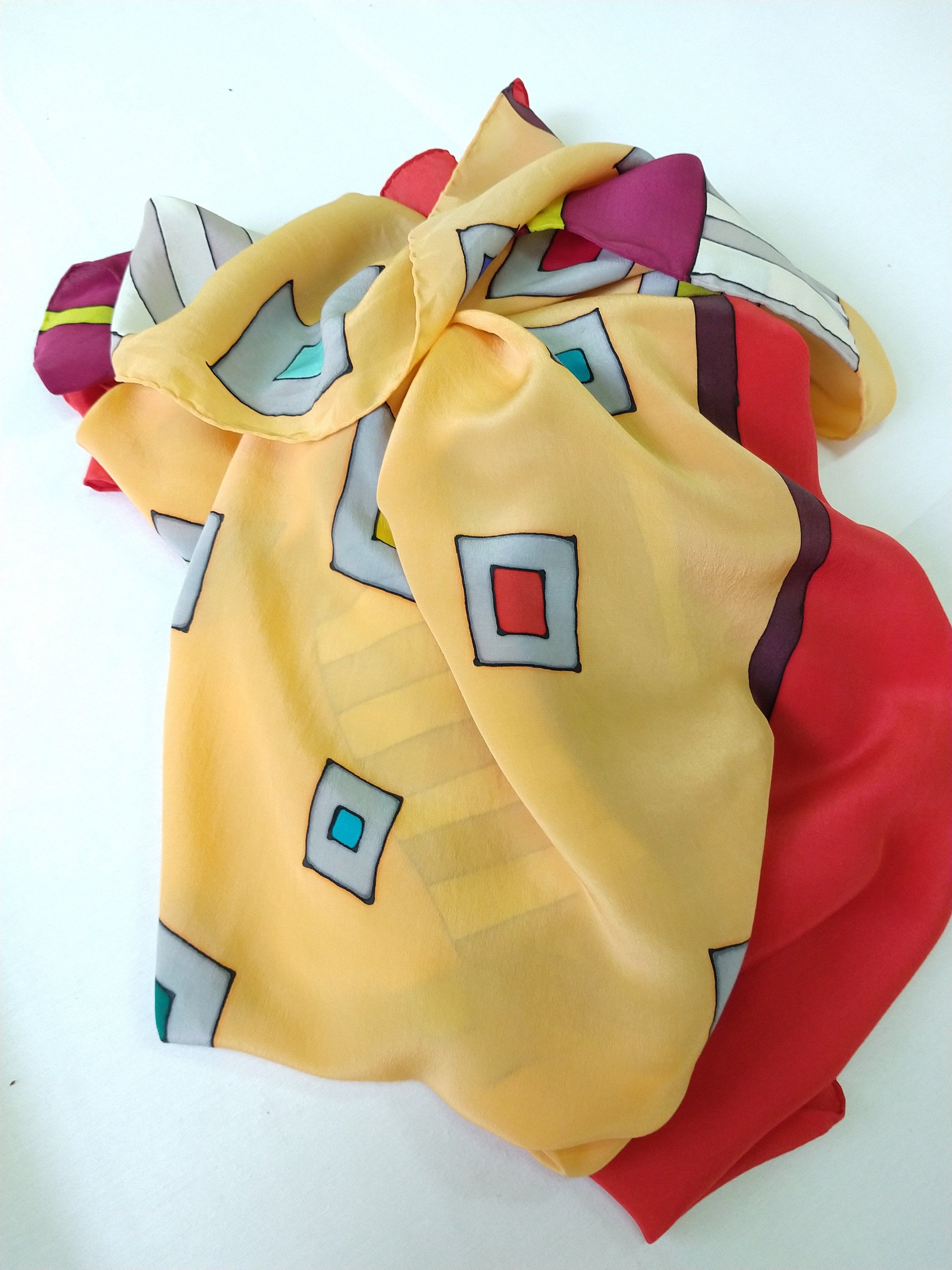 Pinto personalmente a mano cada pañuelo de seda, uno a la vez, en mi estudio ubicado en la hermosa ciudad de Barcelona, en Europa, y nunca uso plantillas. Las sedas que creo son únicas en este planeta.