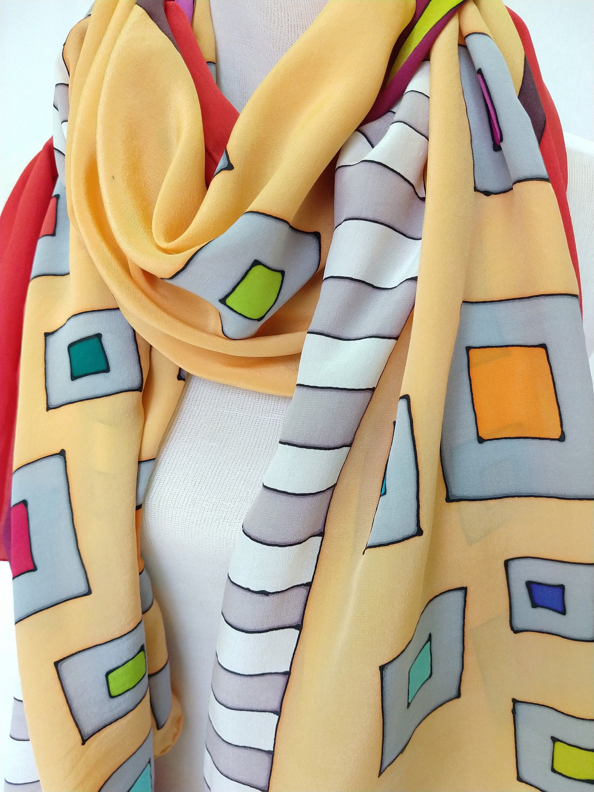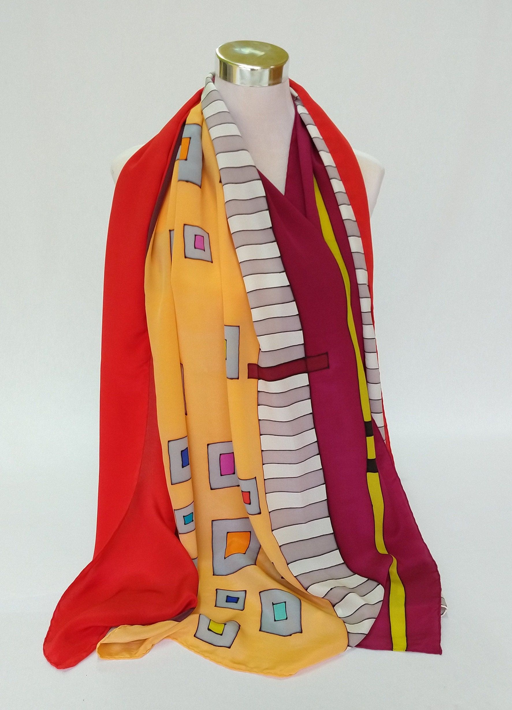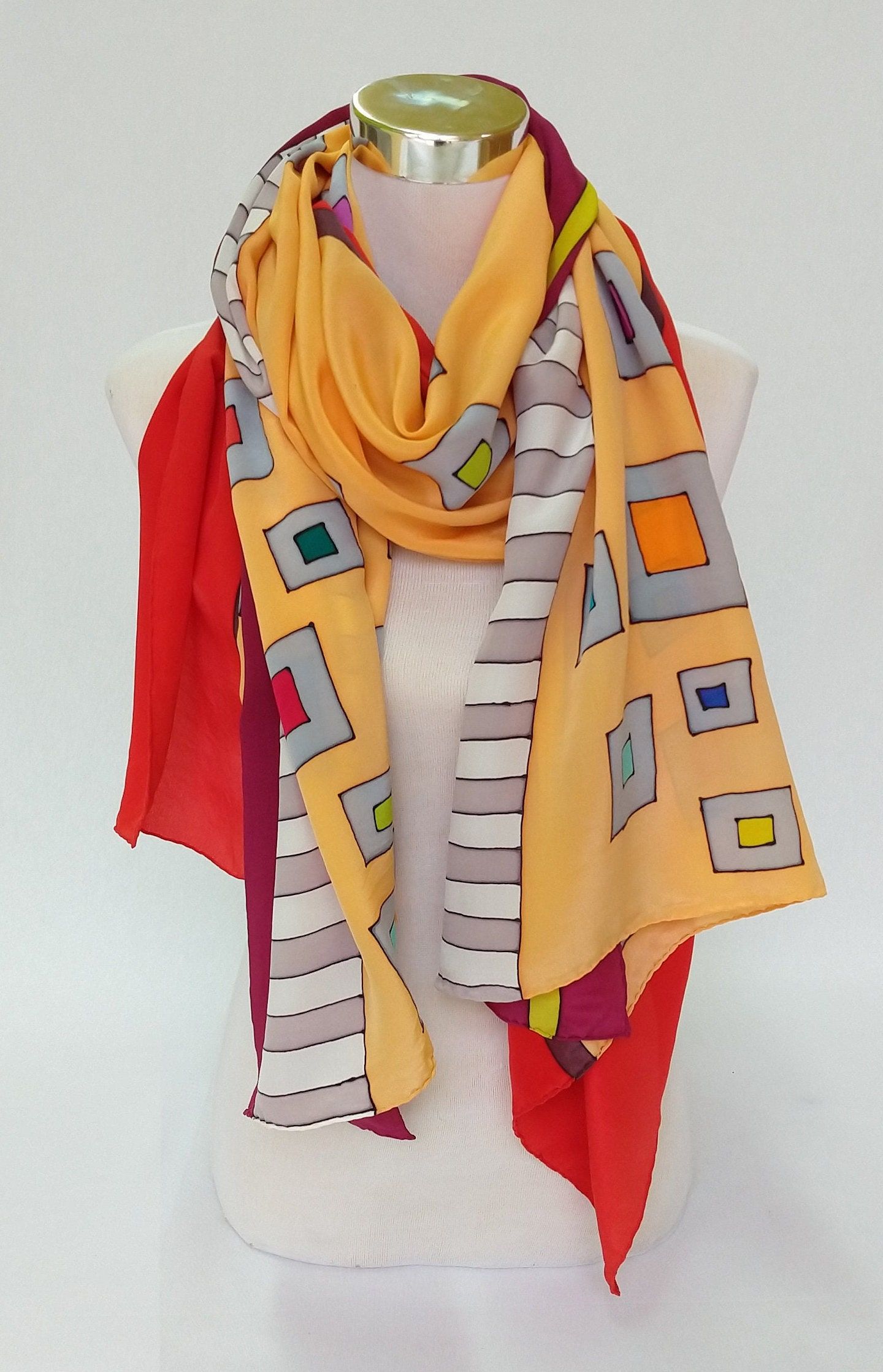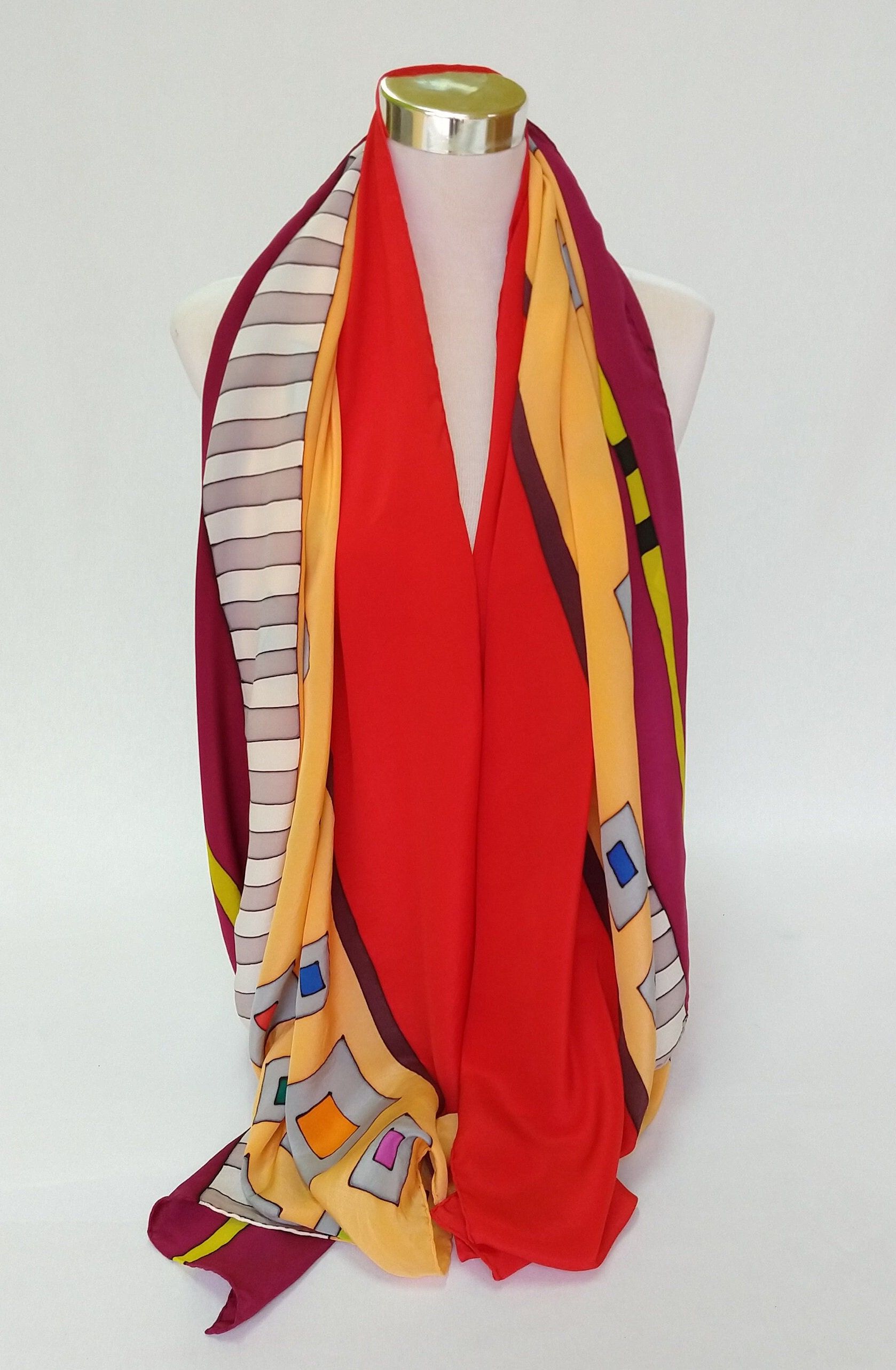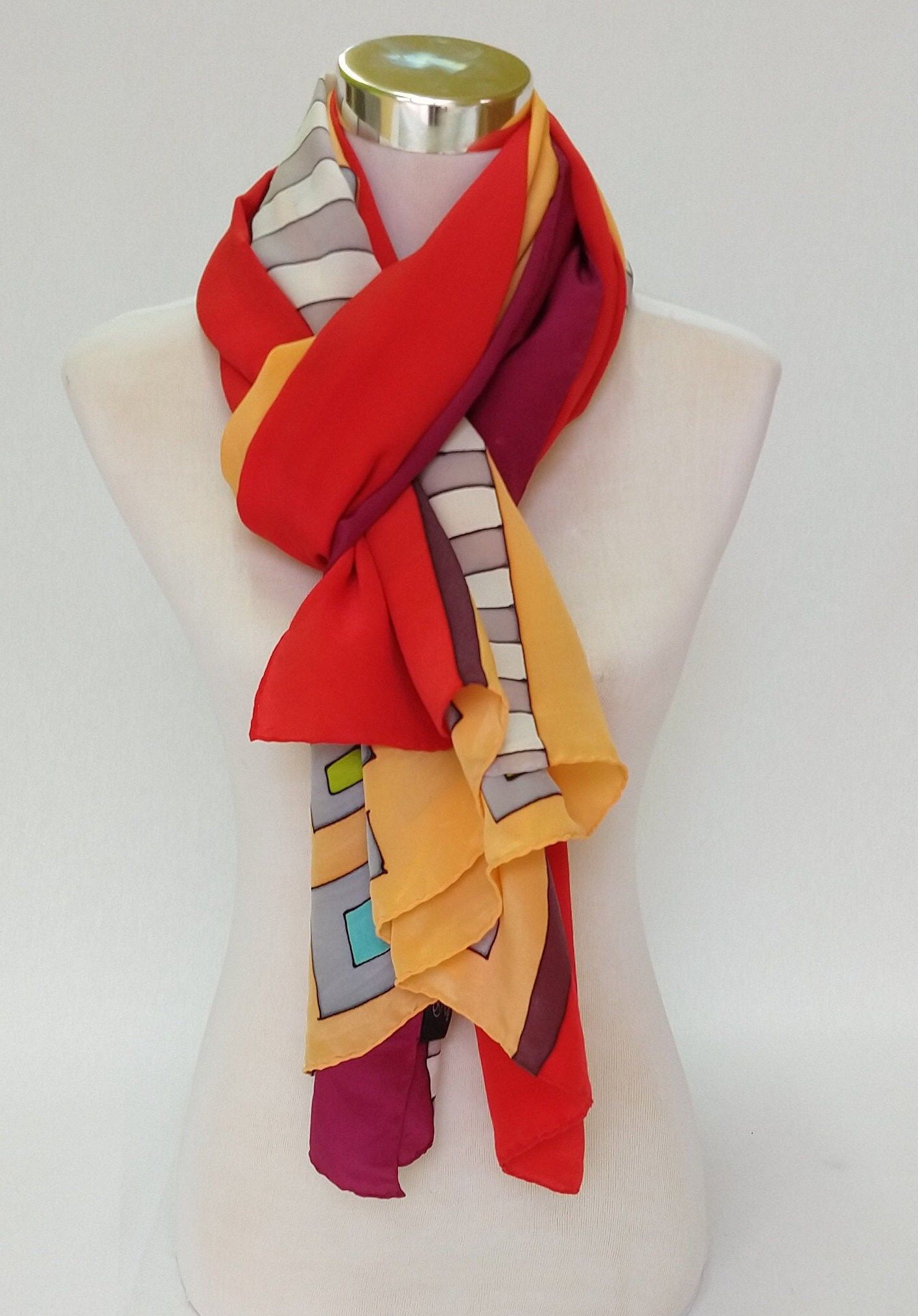 Bufanda de seda pintada a mano, regalo para mujer, bufanda de seda grande, chal de seda geométrico para ella, bufanda de boda de verano, 36 x 72 pulgadas