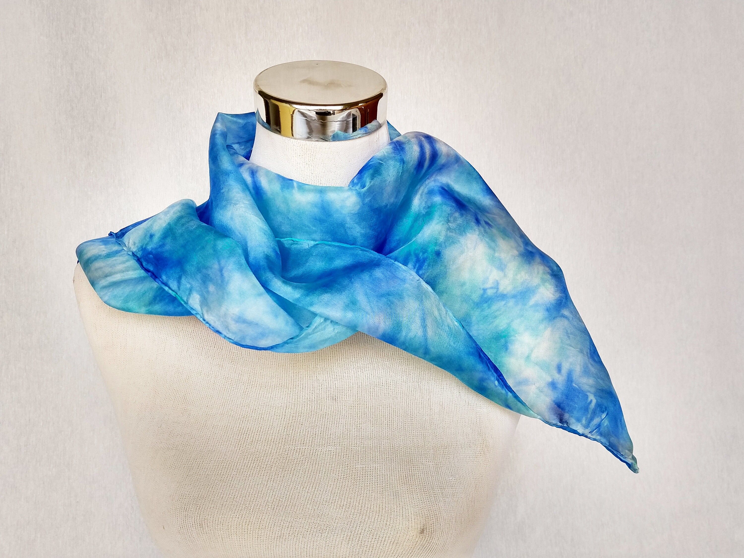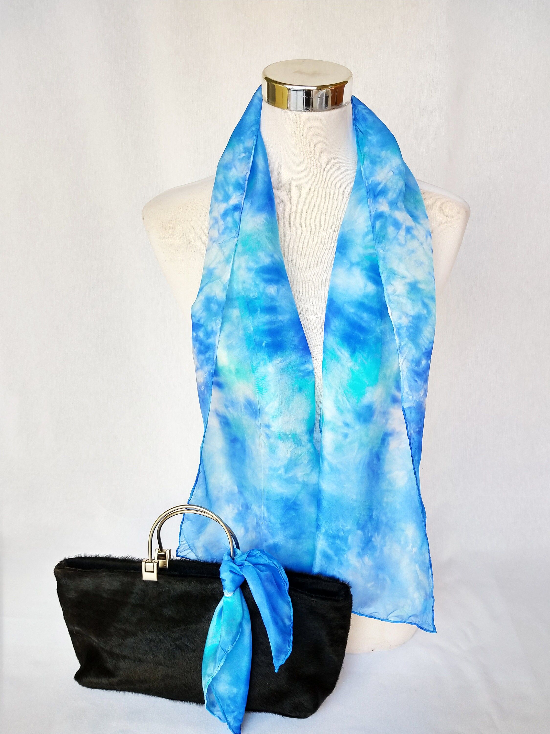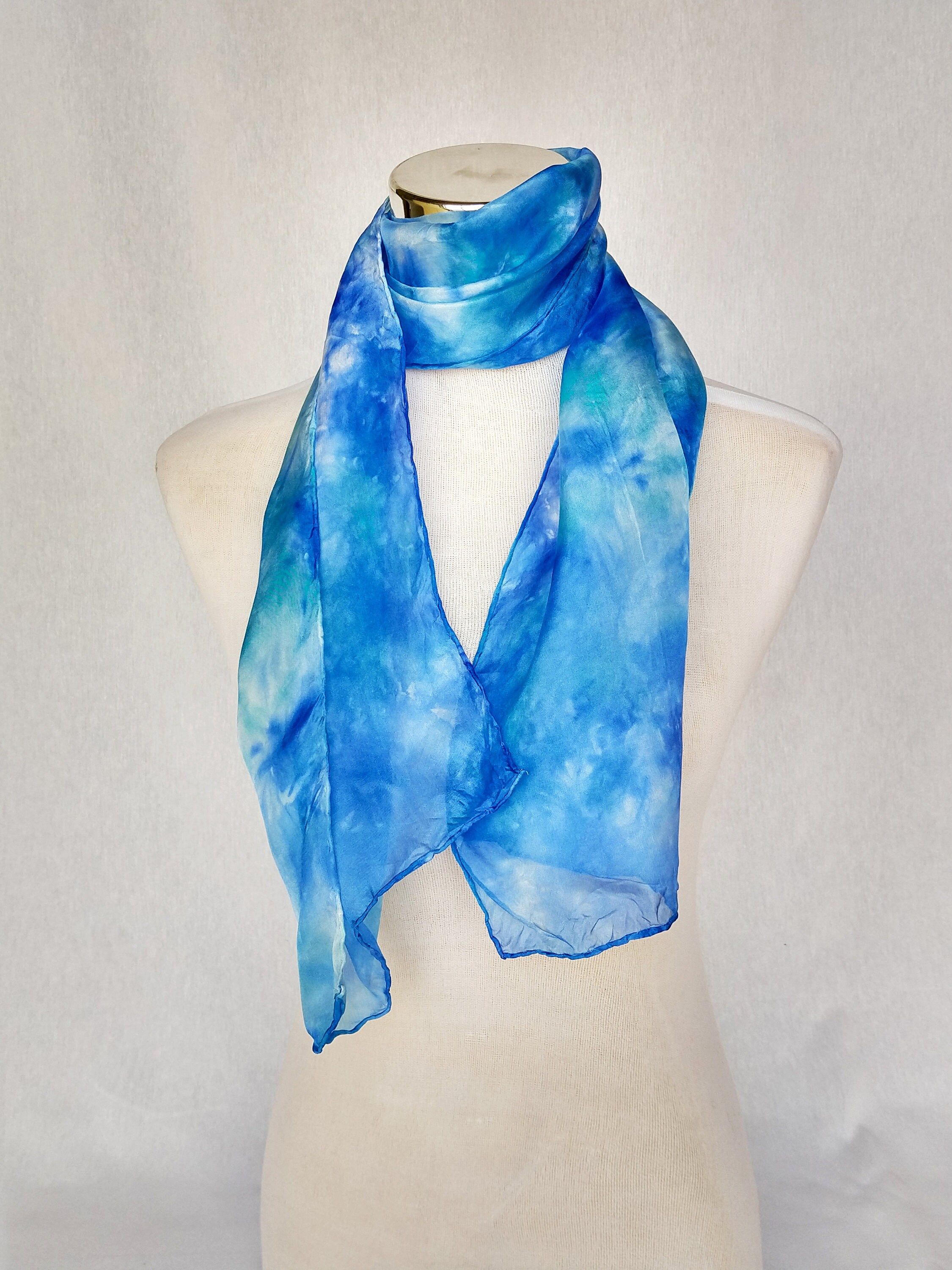 Bufanda de seda turquesa pintada a mano, bufanda de cuello azul, bufanda de cuello de seda, 11 x 51 pulgadas, regalo de cumpleaños para cuñada
