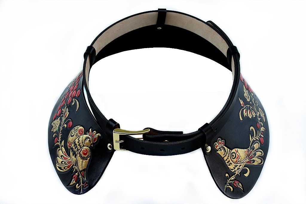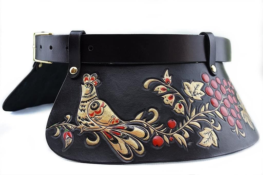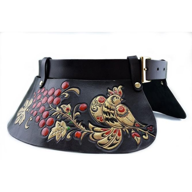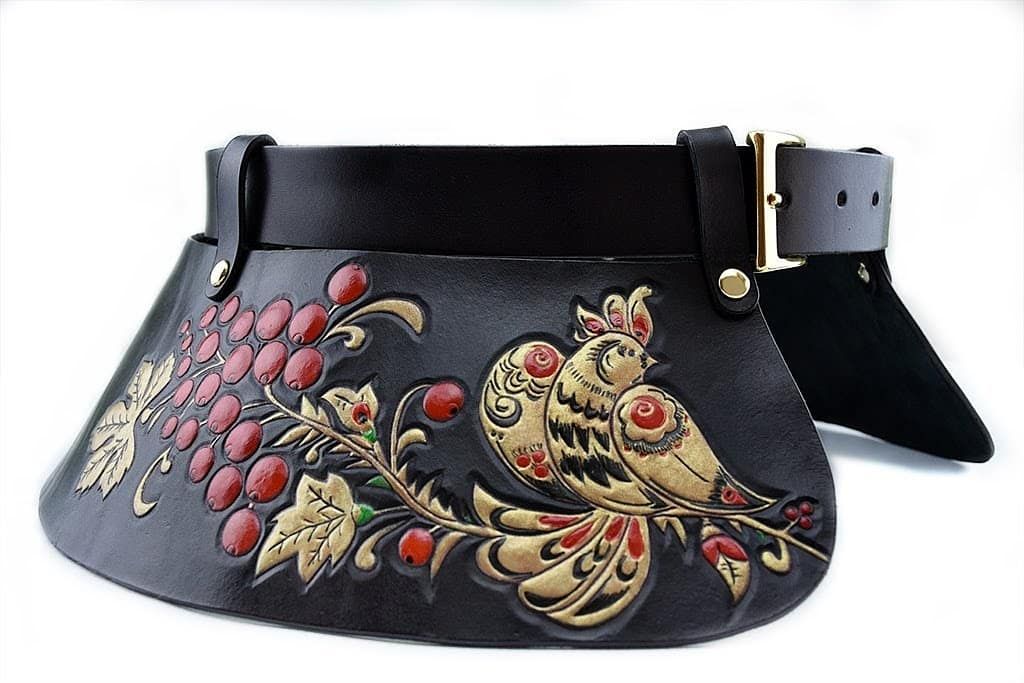 Vaska – es el llamado volante ancho, cosido en la linea de cintura al vestido o cualquier otra prenda. Vaska era un elemento tradicional de los trajes de los vascos. Repujado y policromado a mano, las aves del cuento de hadas posadas sobre los ramilletes de serbal rojo. Pieza exclusiva e única, destinada a las verdaderas amantes del arte.