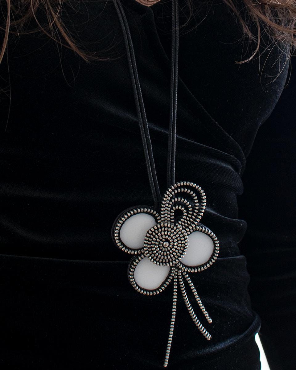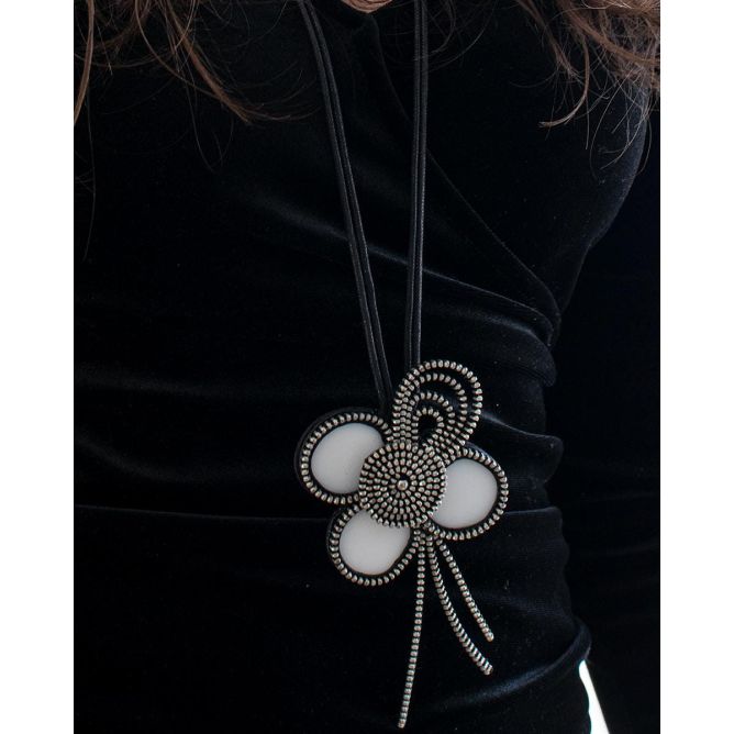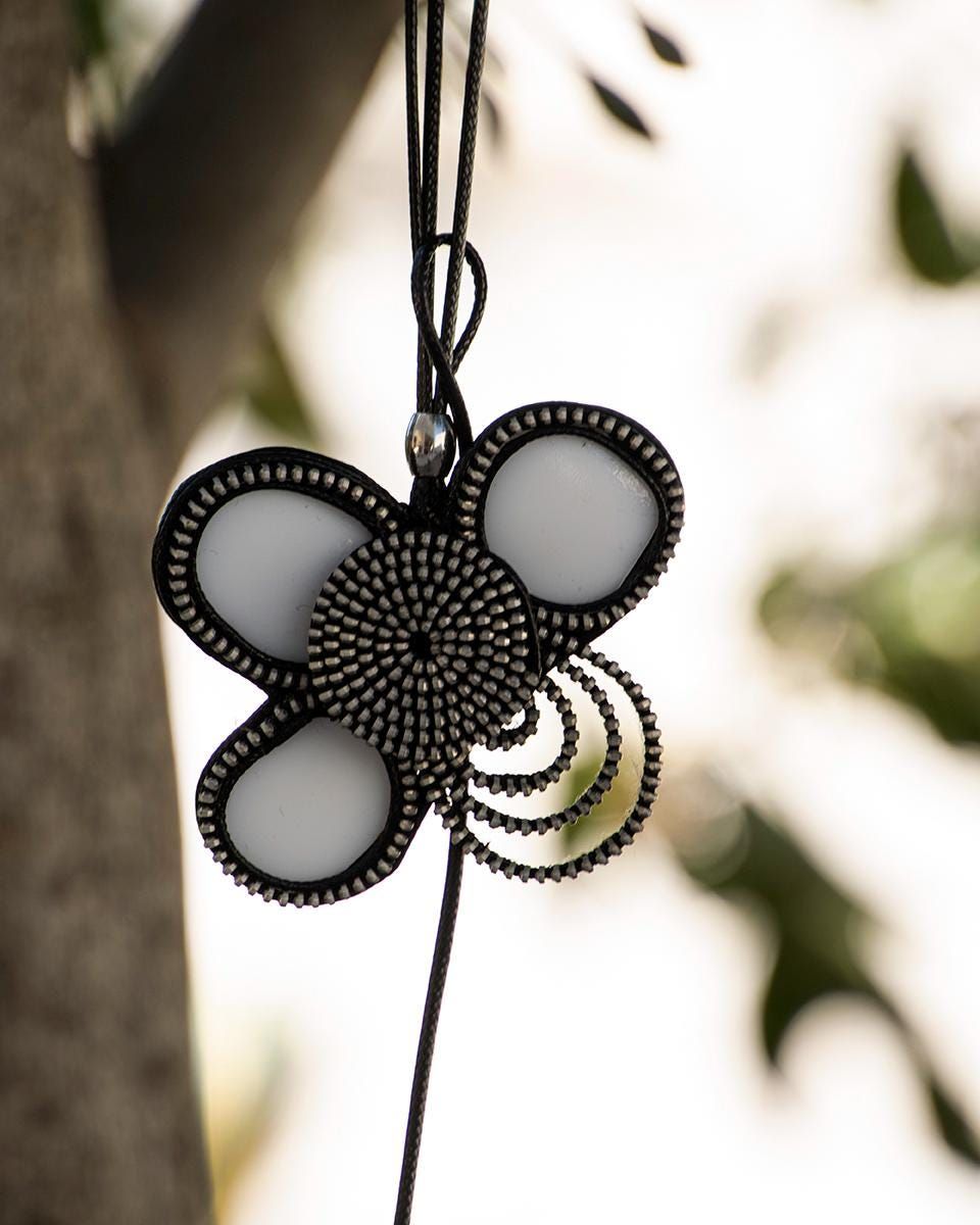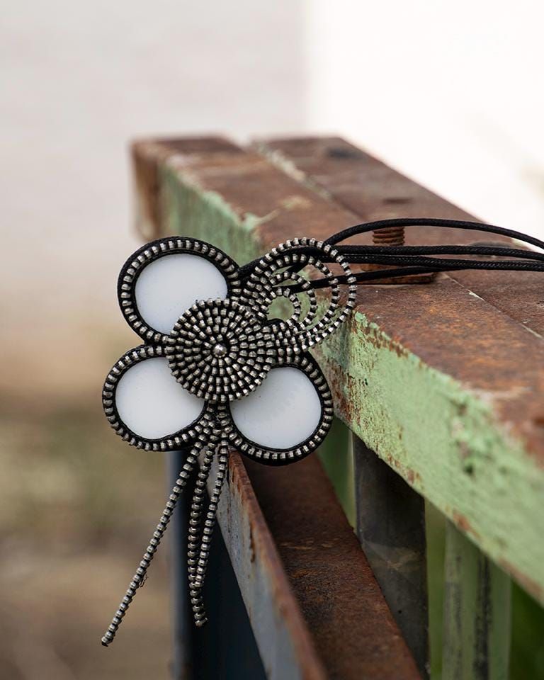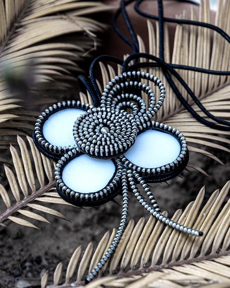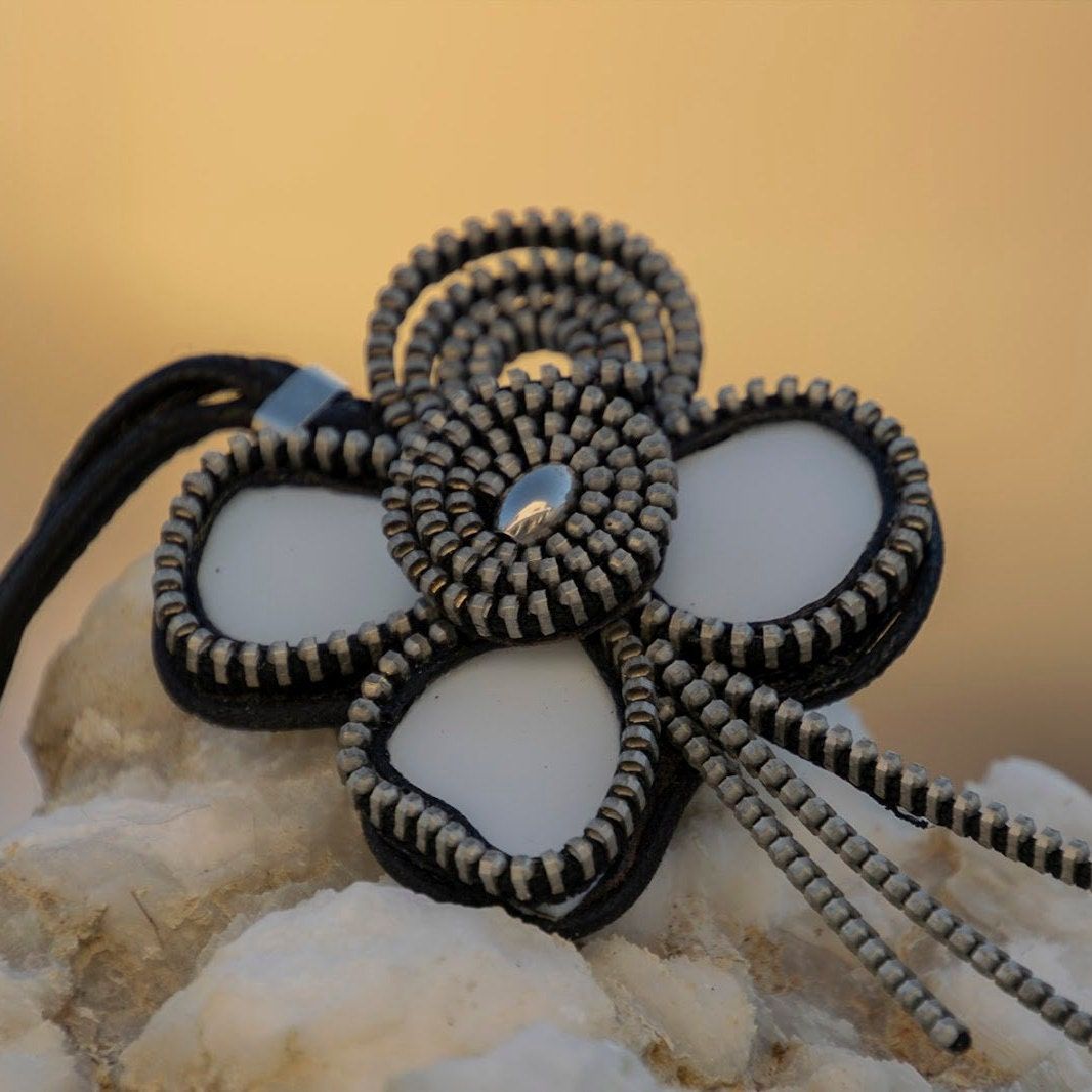 collar elaboraqdo con ceramica reciclada con forma de flor y una de las hojas realizada con cremallera
