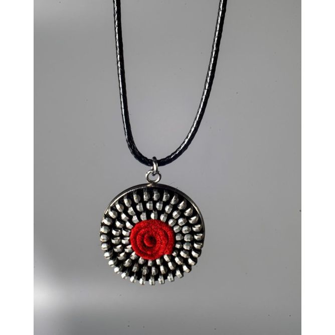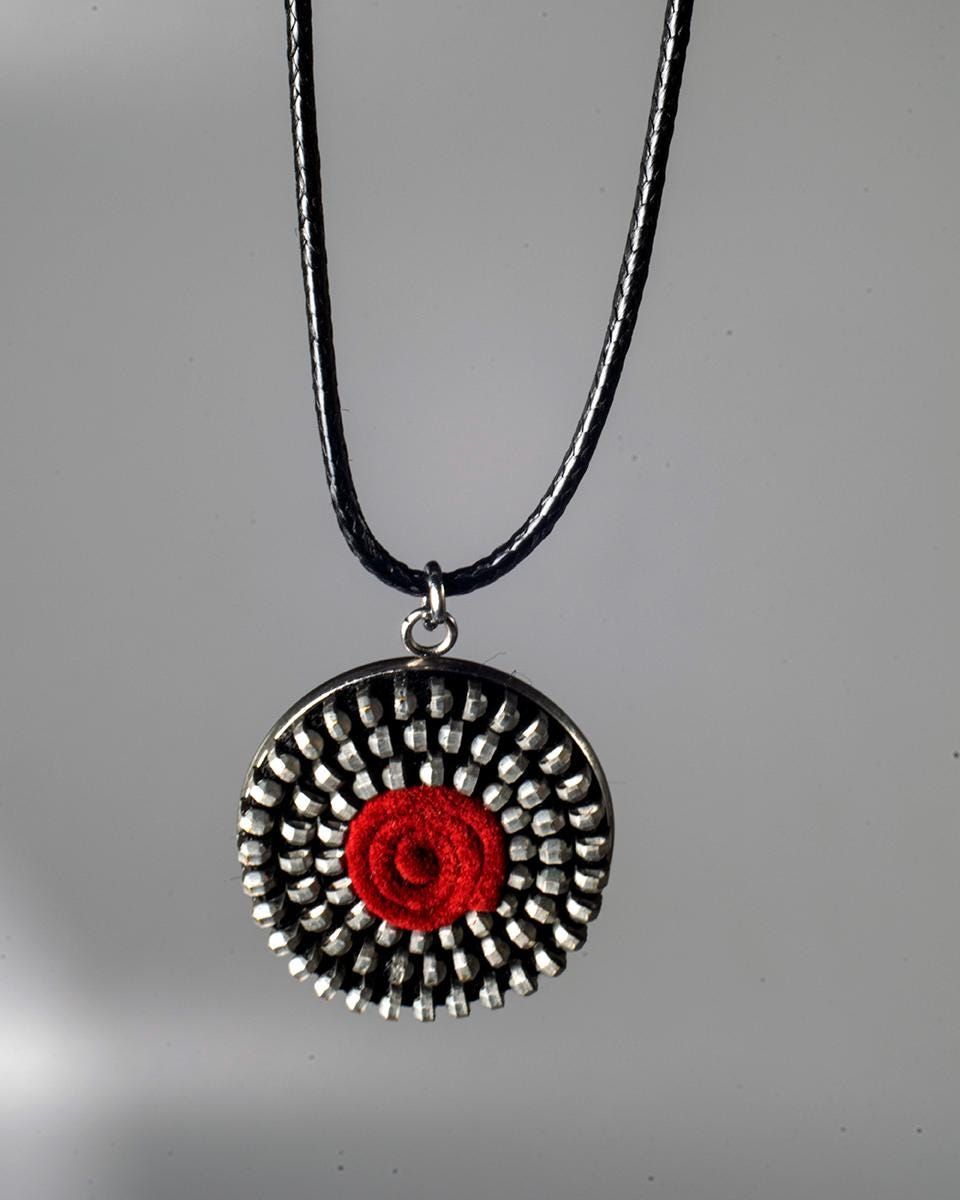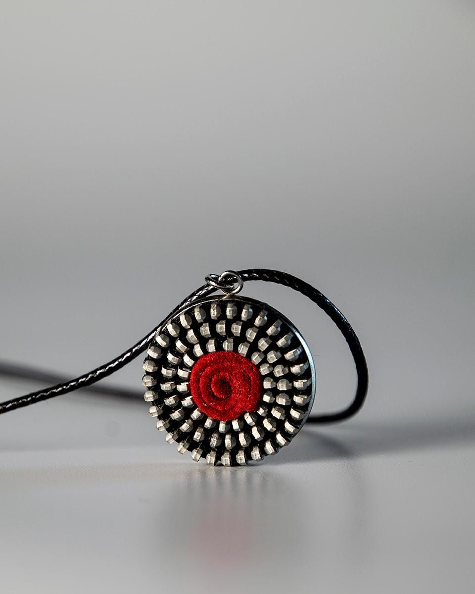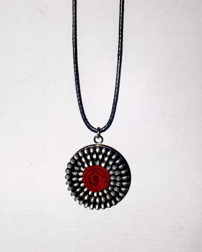 collar con 3 vueltas de cremallera forma circular combinado con serraje reciclado de color rojo
