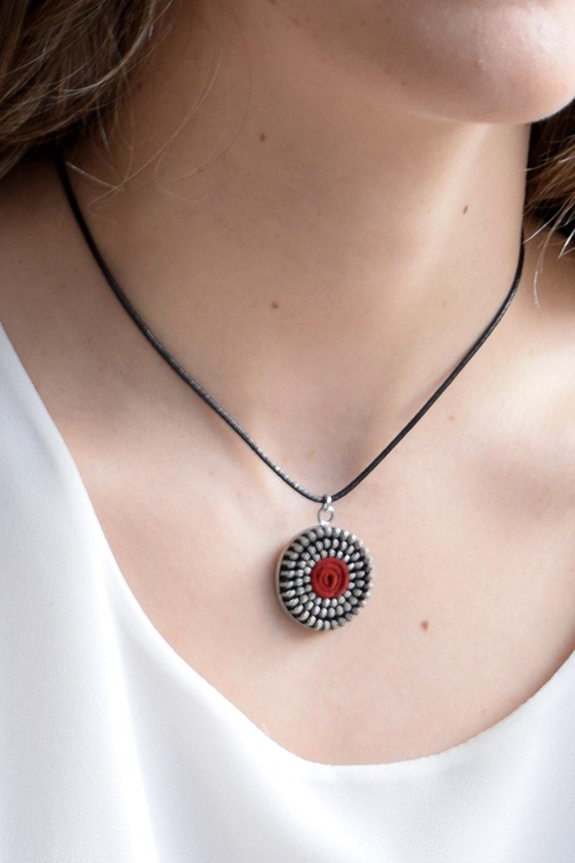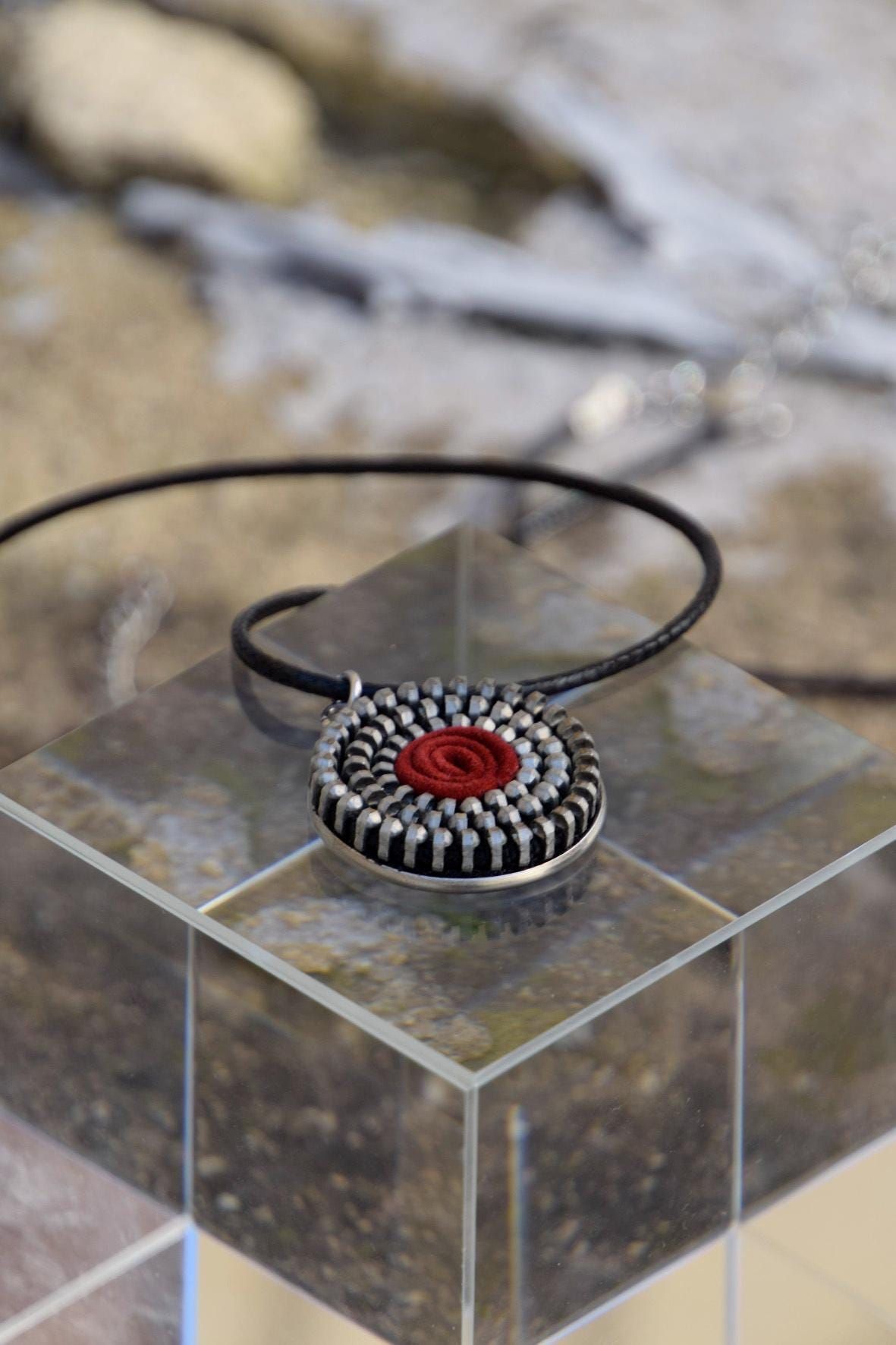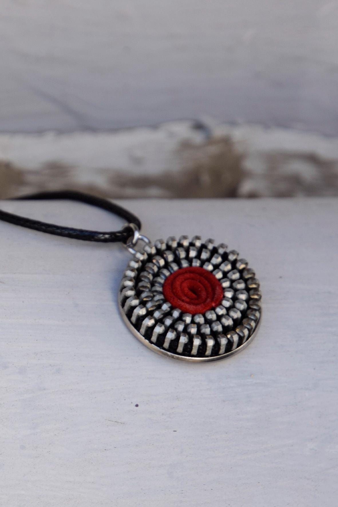 collar con 3 vueltas de cremallera forma circular combinado con serraje reciclado de color rojo