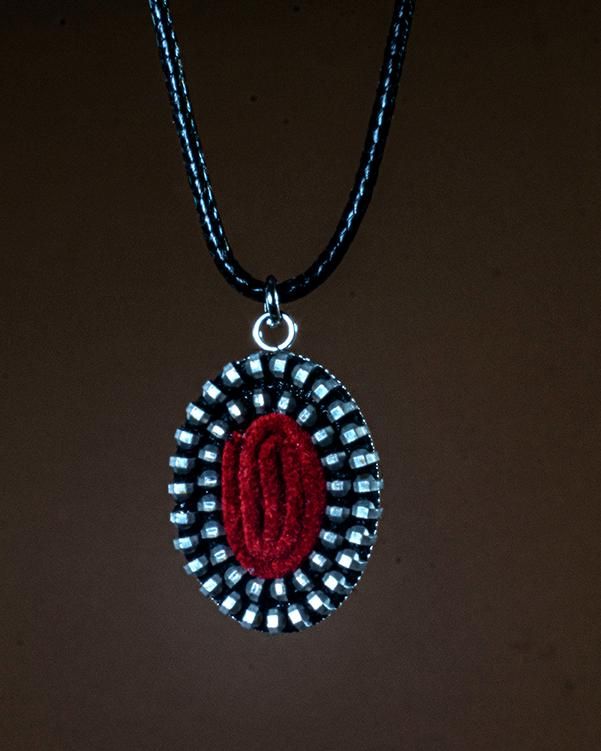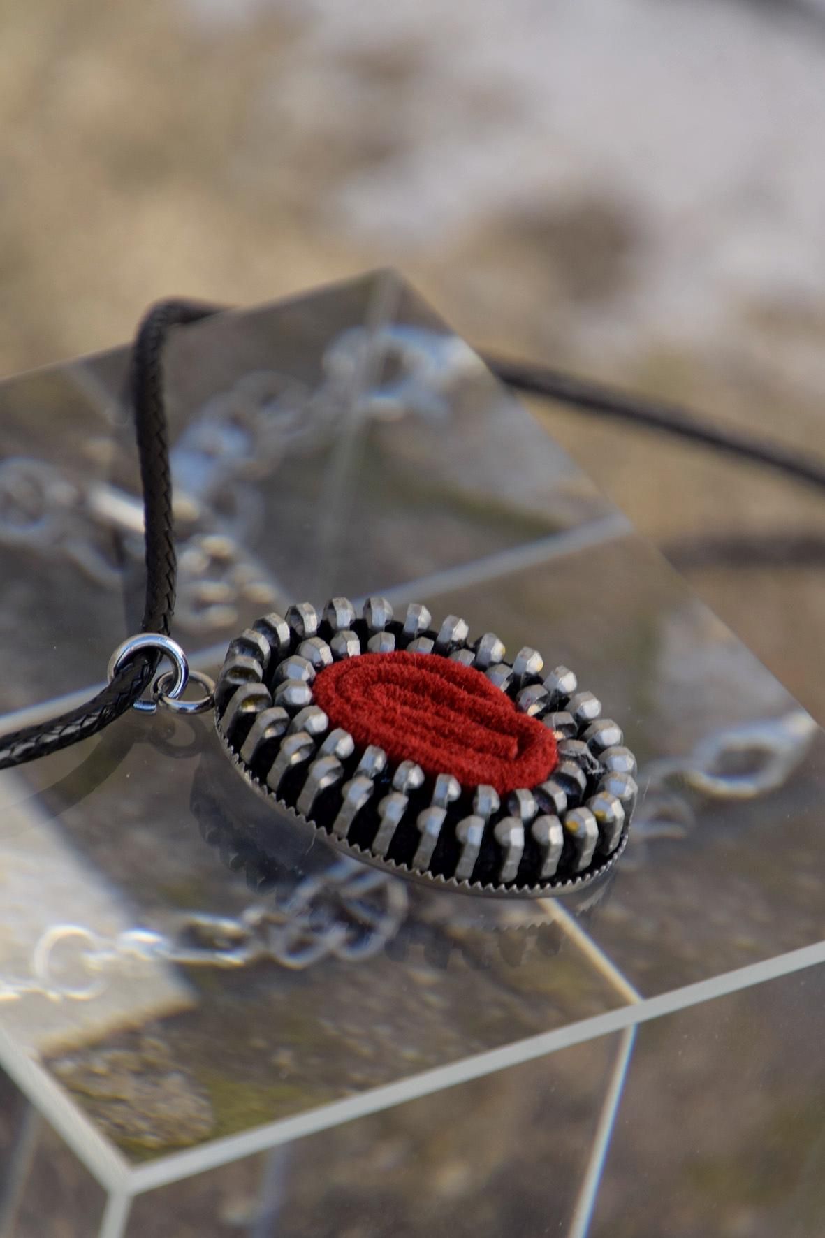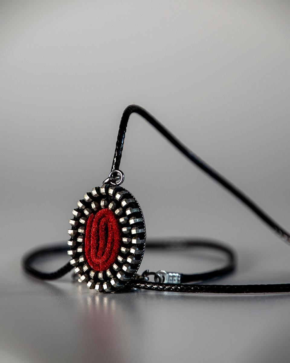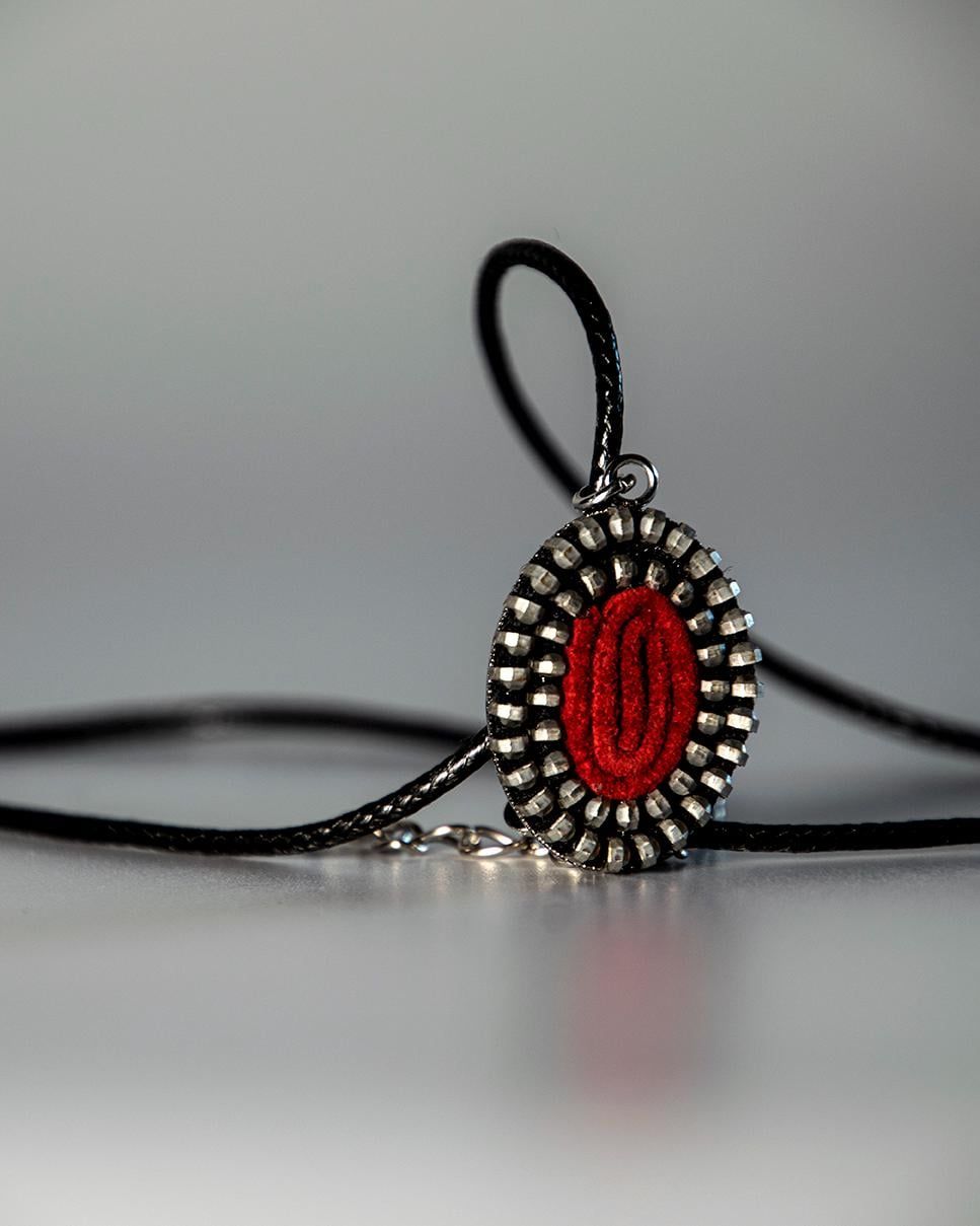 collar de forma oval pequeño hecho con dos vueltas de cremallera y una pieza central de serraje reciclado en color rojo.