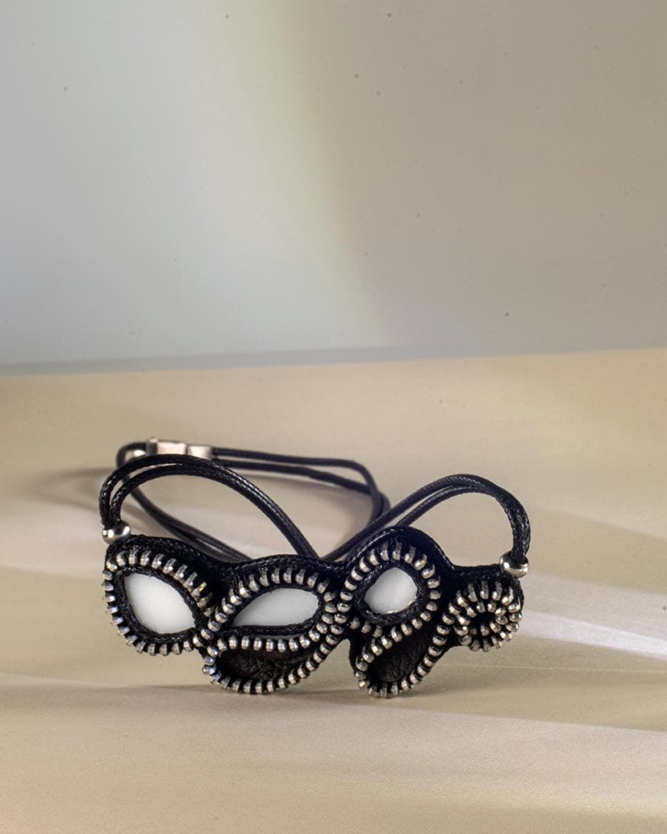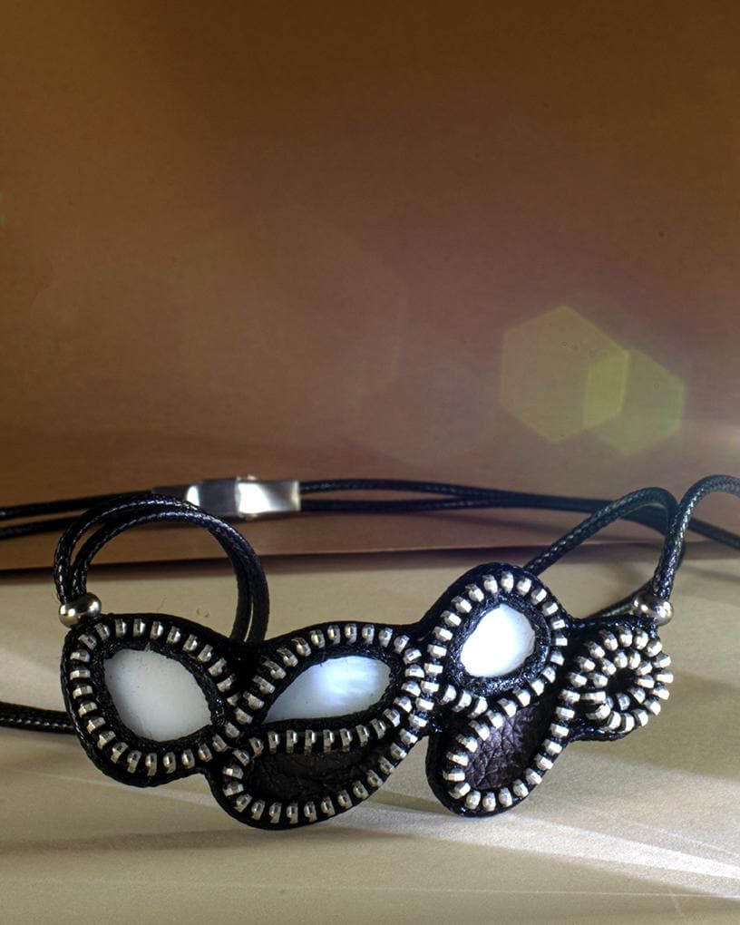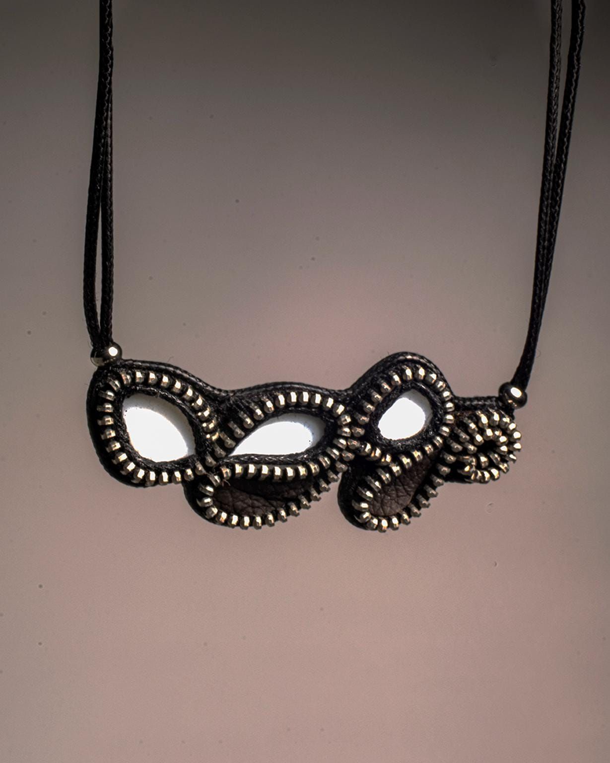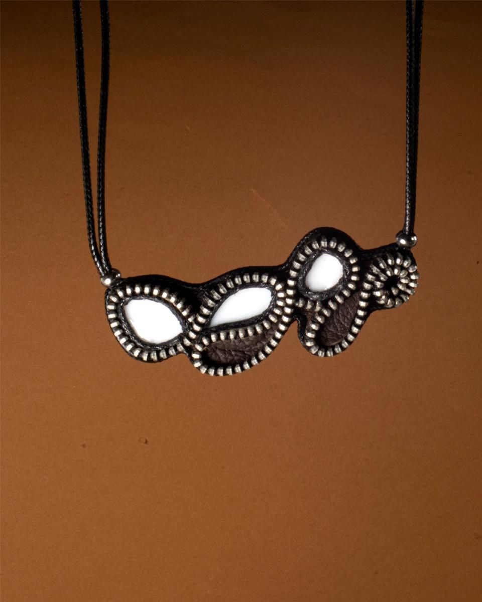 Collar blanco de ceramica reciclada, con cremallera montado en piel.