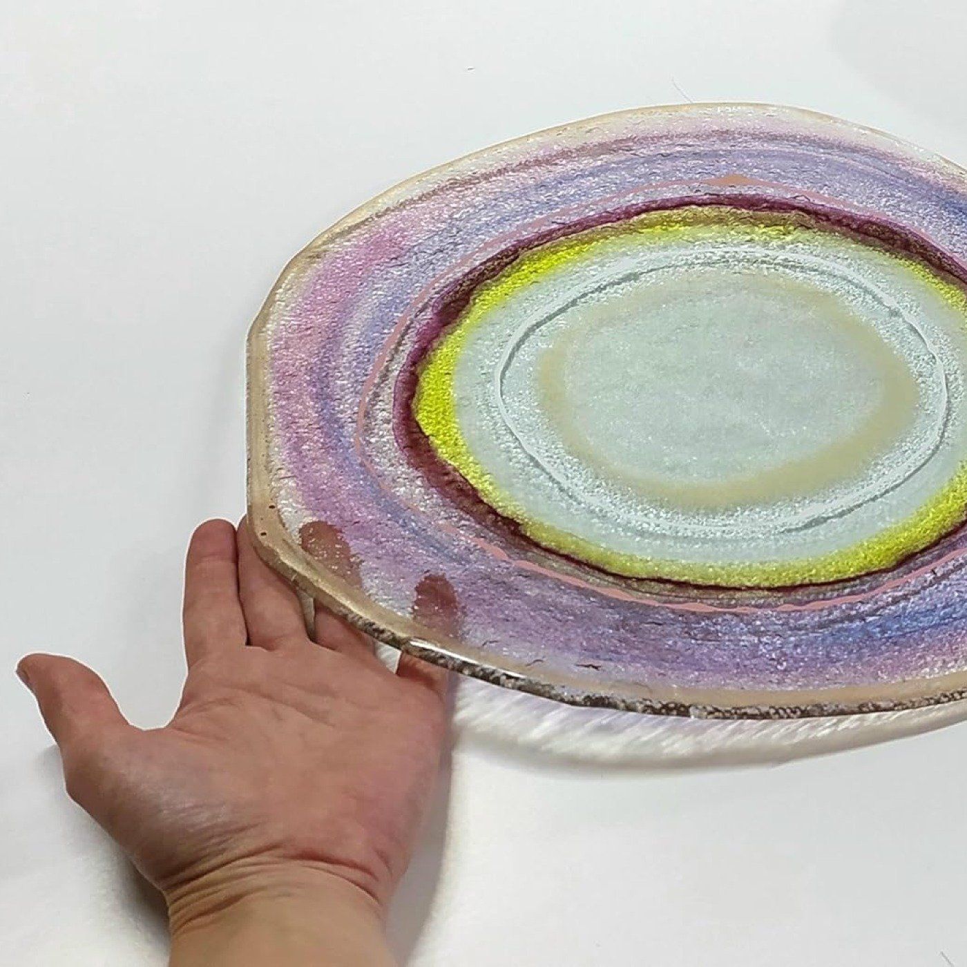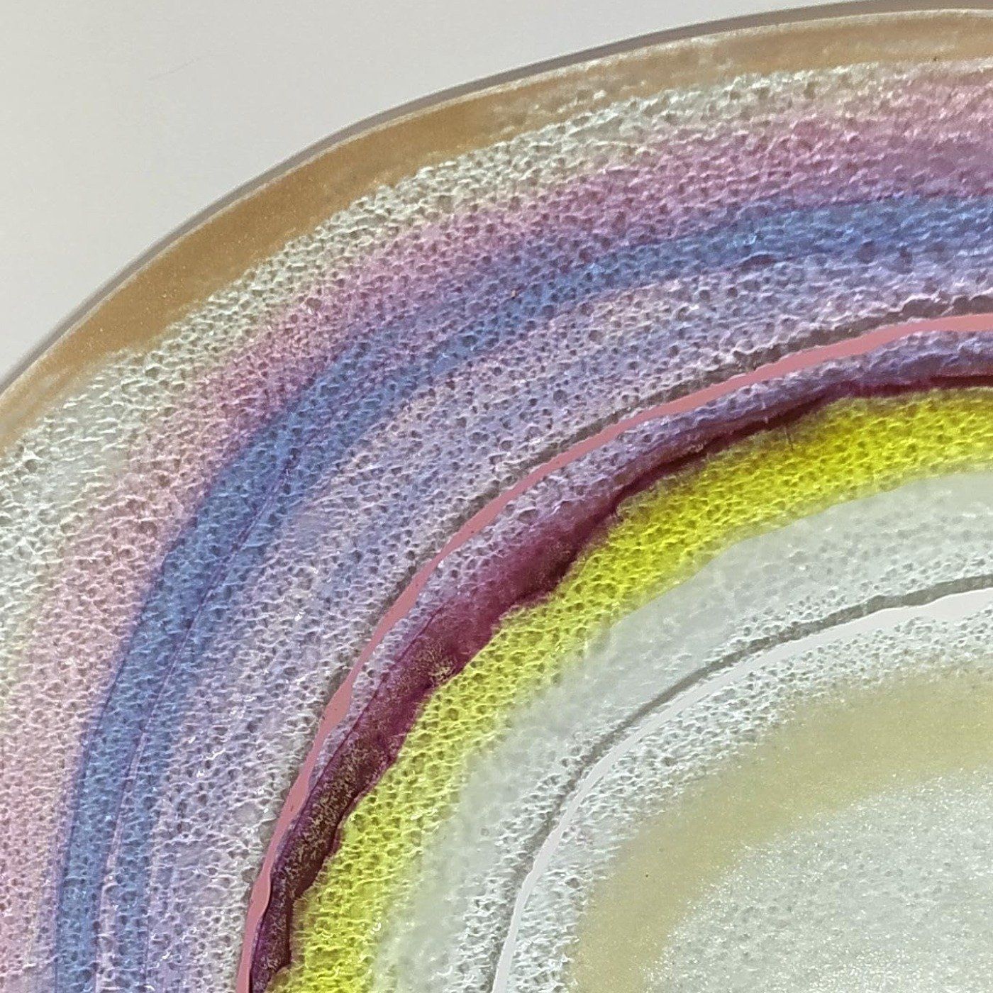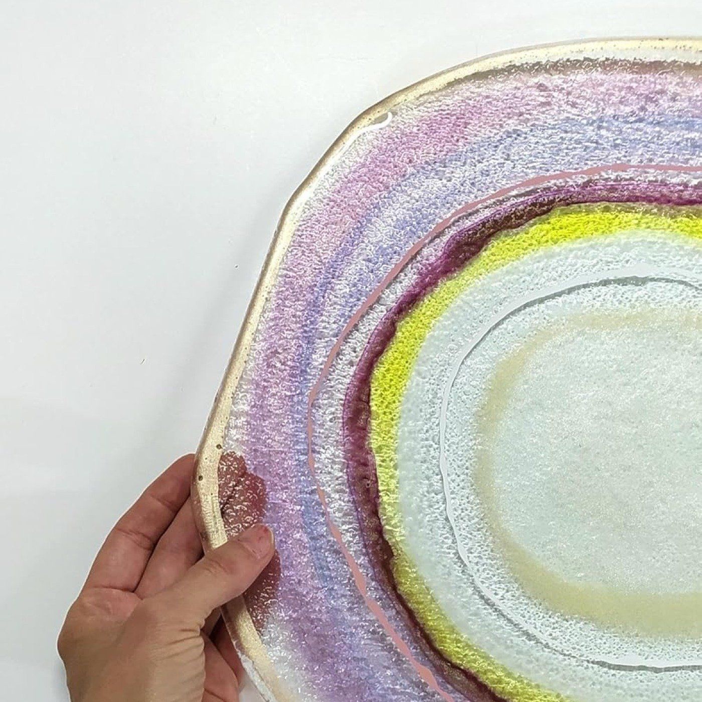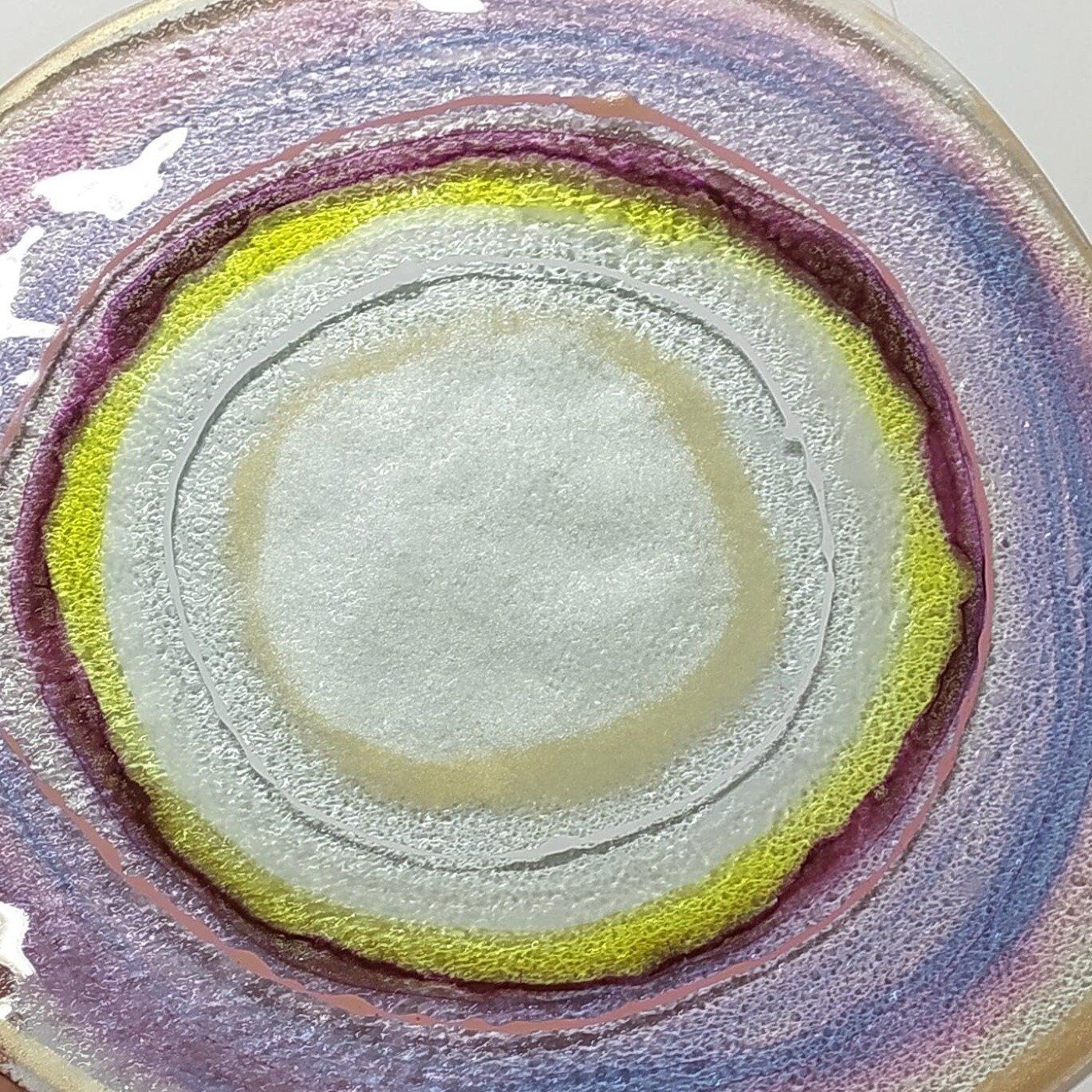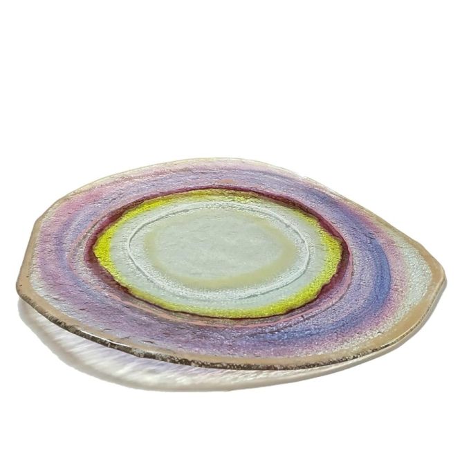 Centro de mesa de vidrio artesanal, pintado a mano con suaves tonos que se difuminan. Se inspira en los anillos concĂ©ntricos que se encuentran en algunos elementos de la naturaleza como el nĂĄcar o los troncos de los ĂĄrboles. Es transparente, por lo que necesita un fondo blanco o muy claro para poderse apreciar el degradado de colores. Pieza Ășnica firmada por la autora. Medidas: 38 x 41 x 2,5 cm.