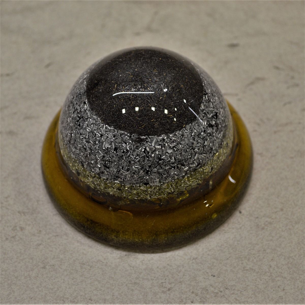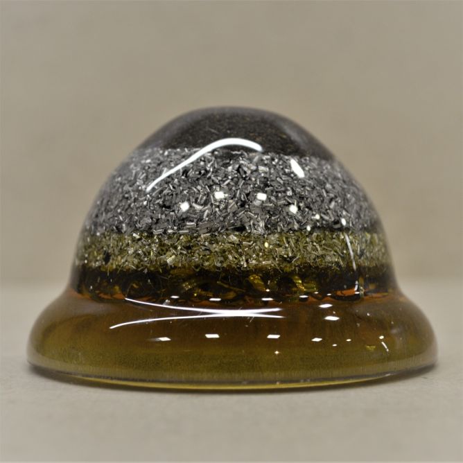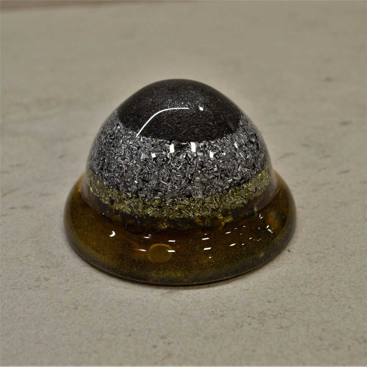 Este modelo de orgonita, está compuesto de resina de poliéster con virutas de metal (aluminio y acero) en una proporción al 50%, y en su interior un cuarzo y chips de cuarzo recogidos en la montaña del Montseny, activados durante 3 noches a la luz de la luna llena y programados debidamente.