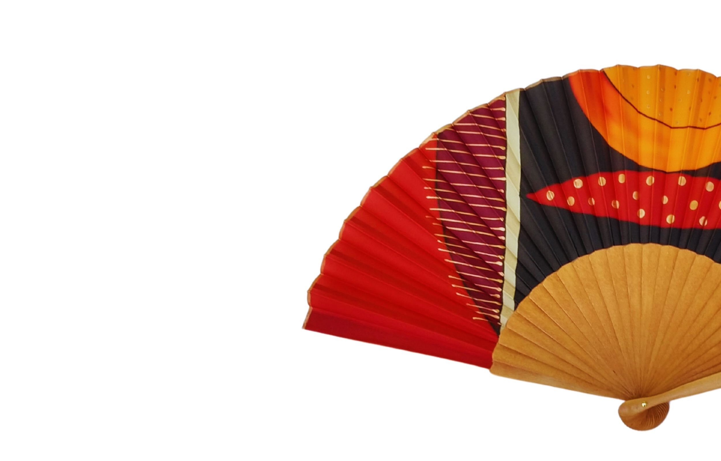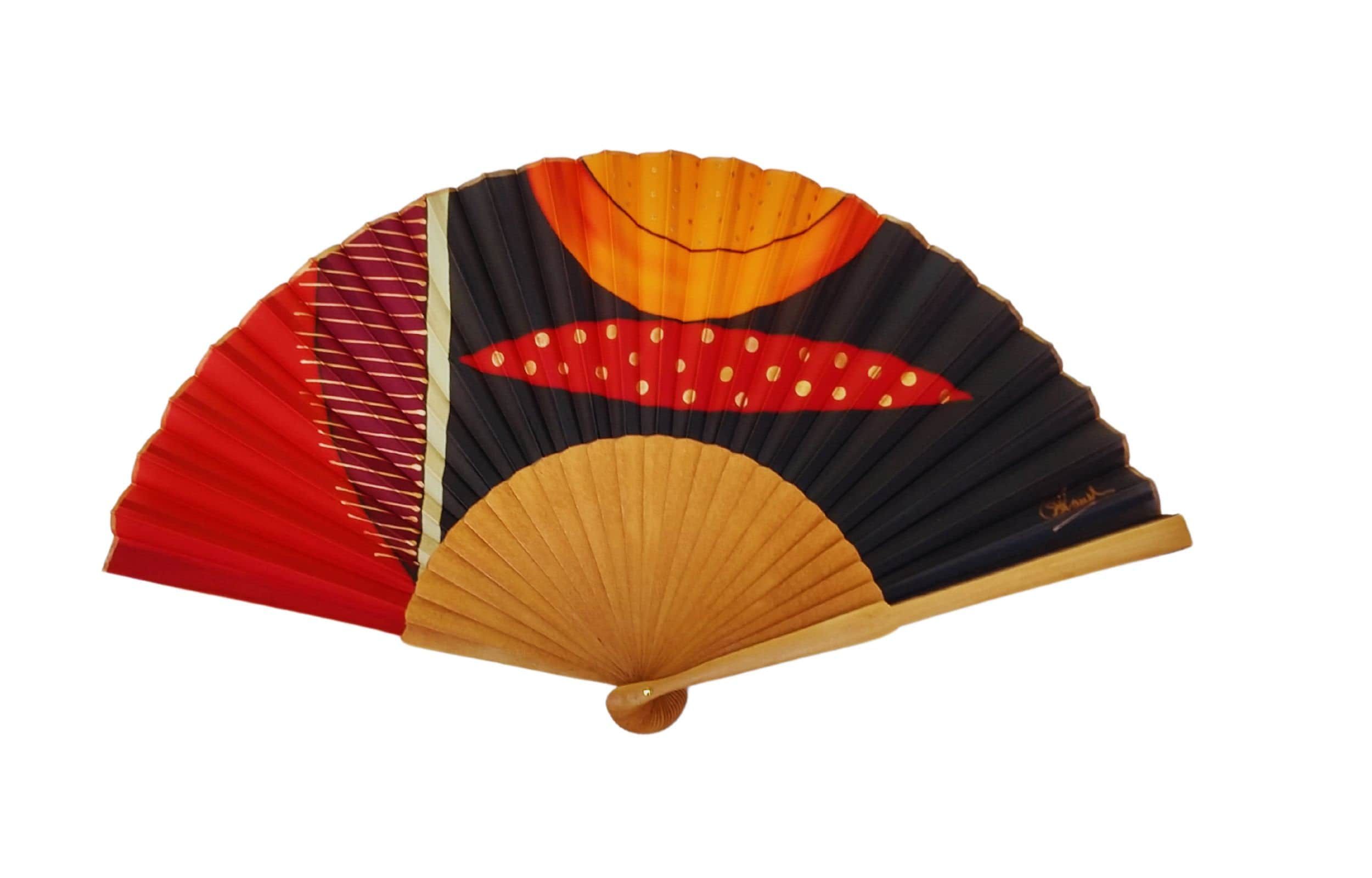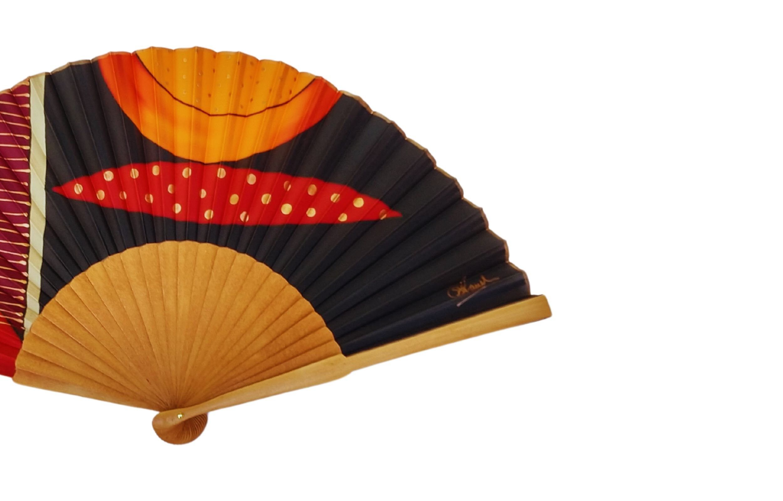 Adéntrate en el mundo del lujo y la elegancia moderna con este abanico de seda pintado a mano, que presenta un diseño geométrico audaz en negro, rojo y naranja con detalles dorados. Una fusión de artesanía tradicional española y arte contemporáneo, este abanico es una pieza de arte portátil que marca una declaración de moda impactante.