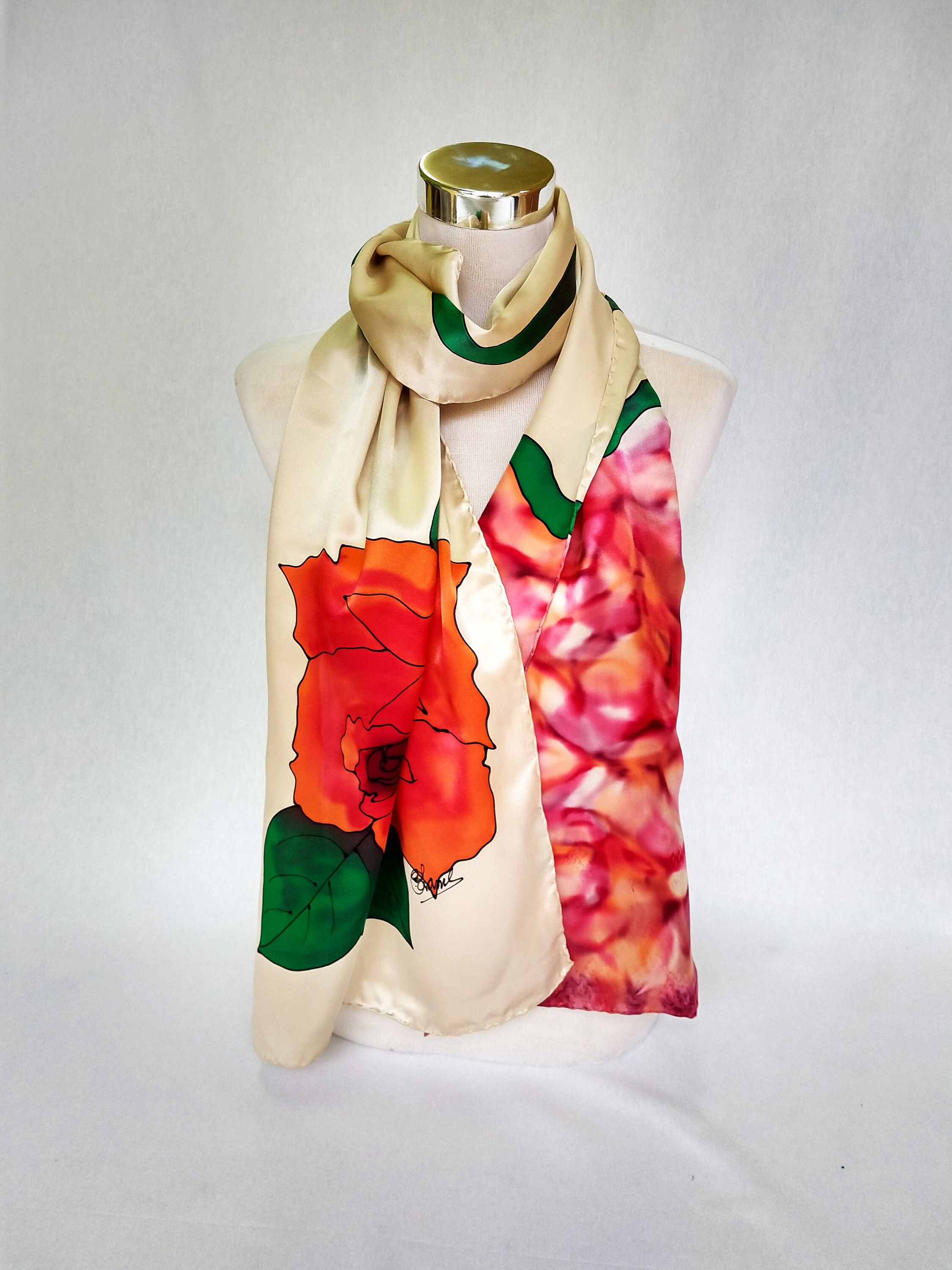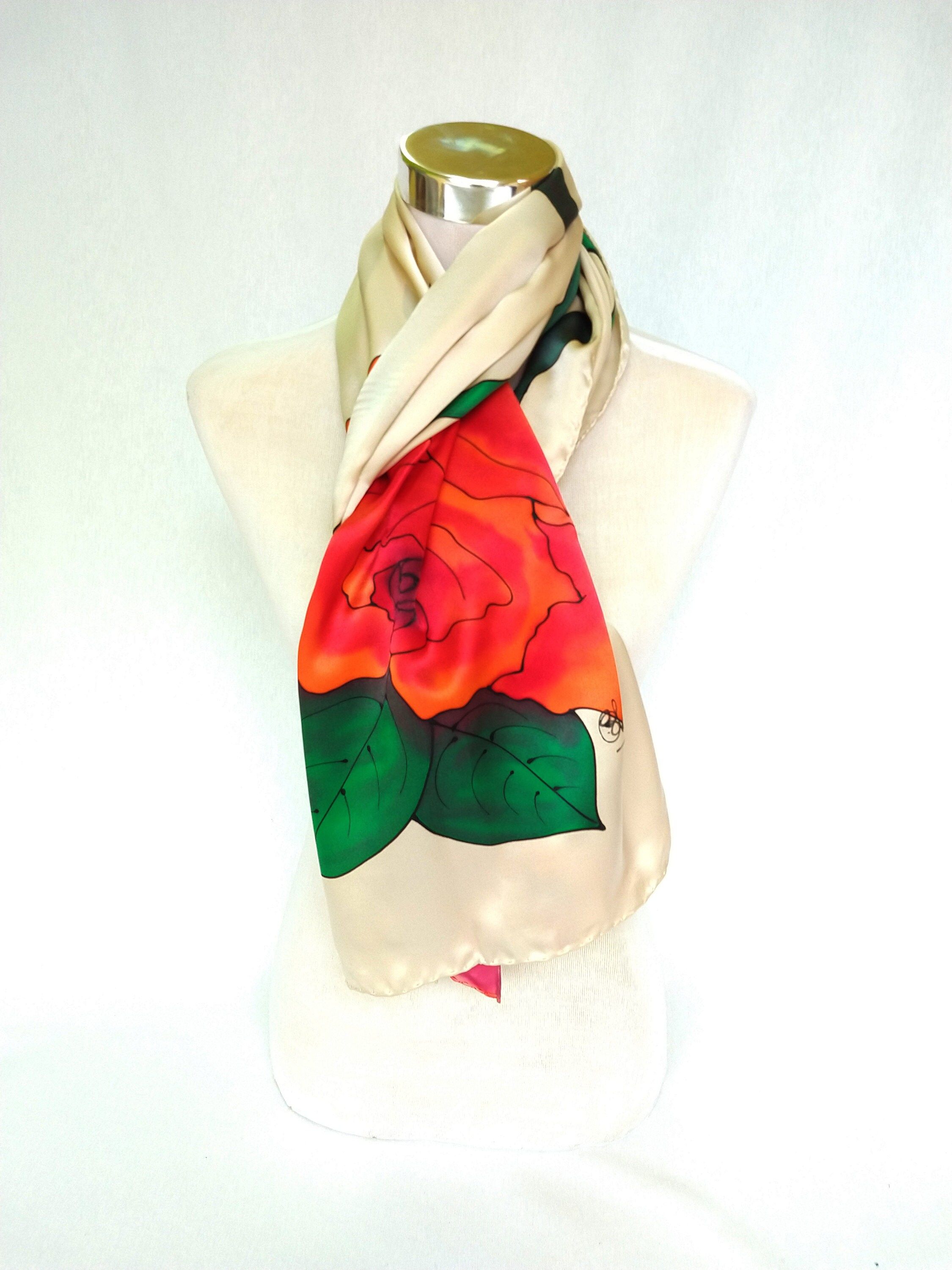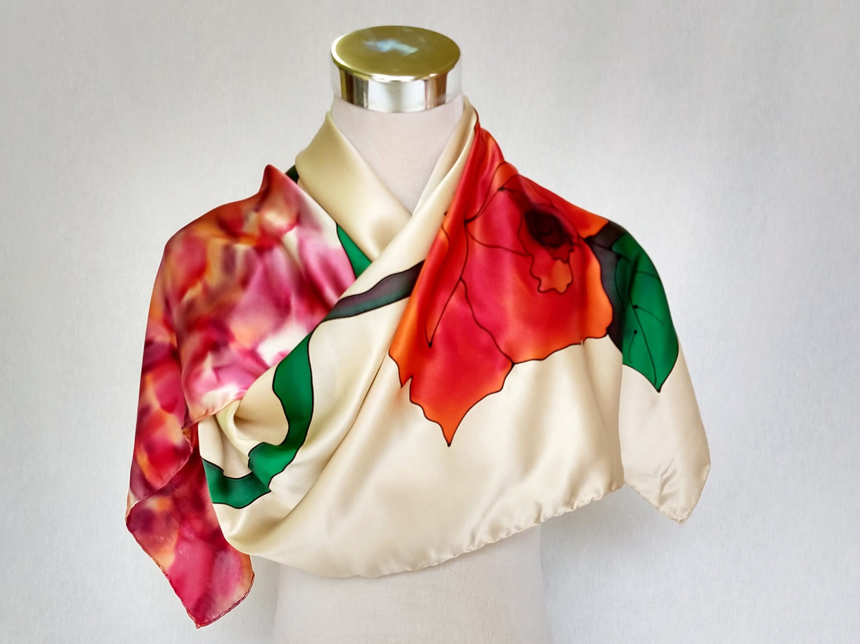 Elegante pañuelo de seda para bodas en color beige con un precioso estampado de flores rojas: ideal para mamás