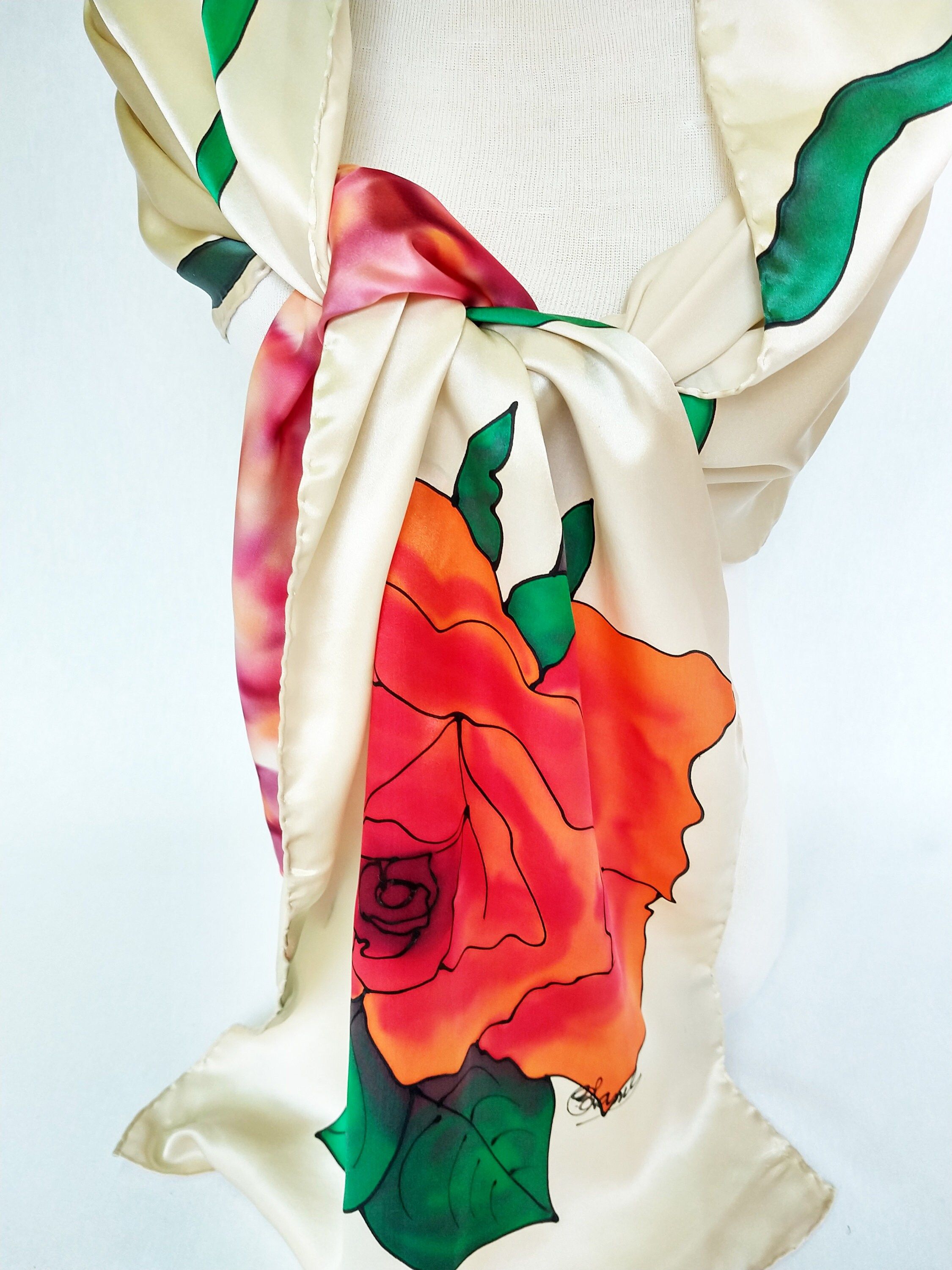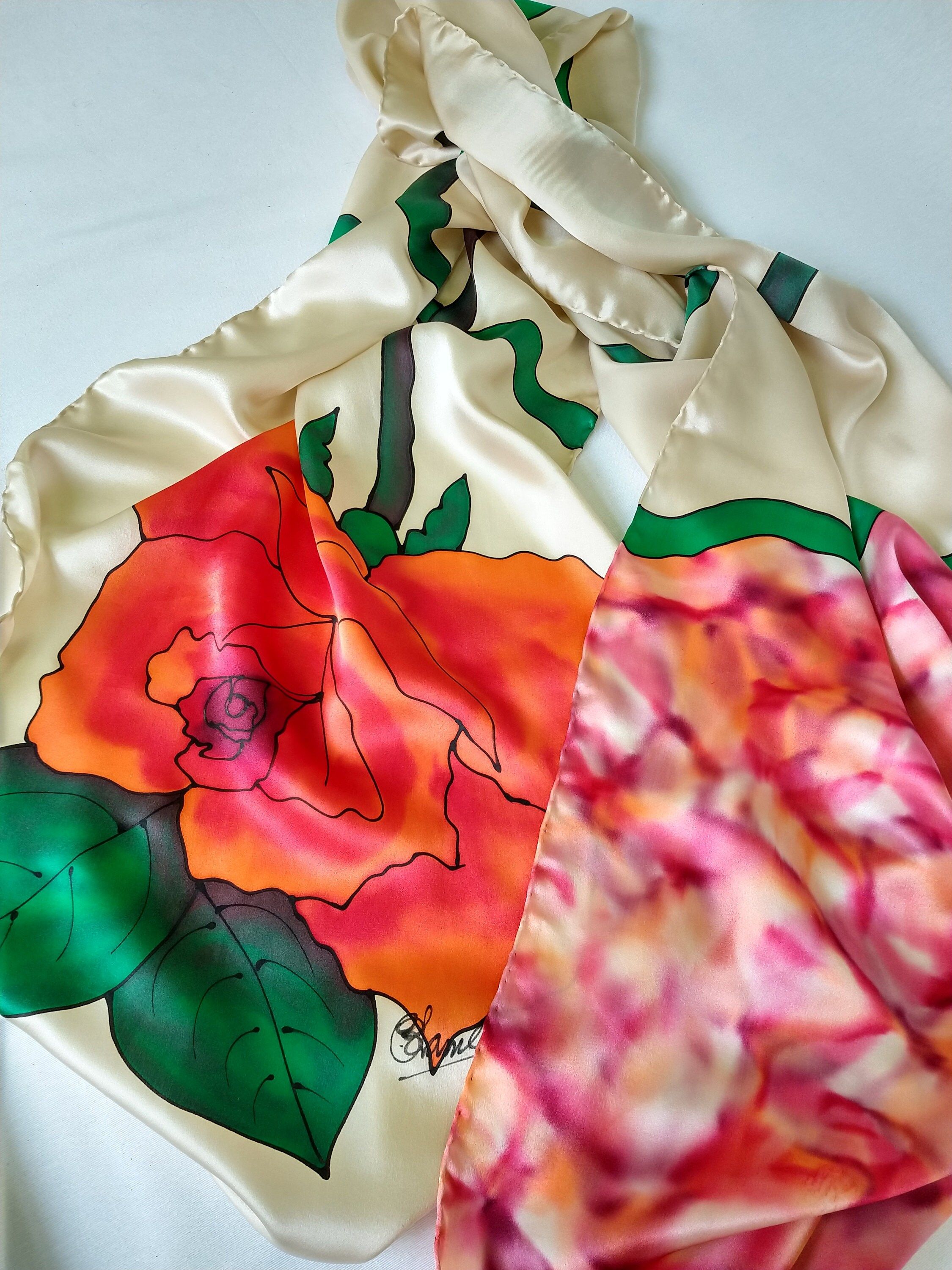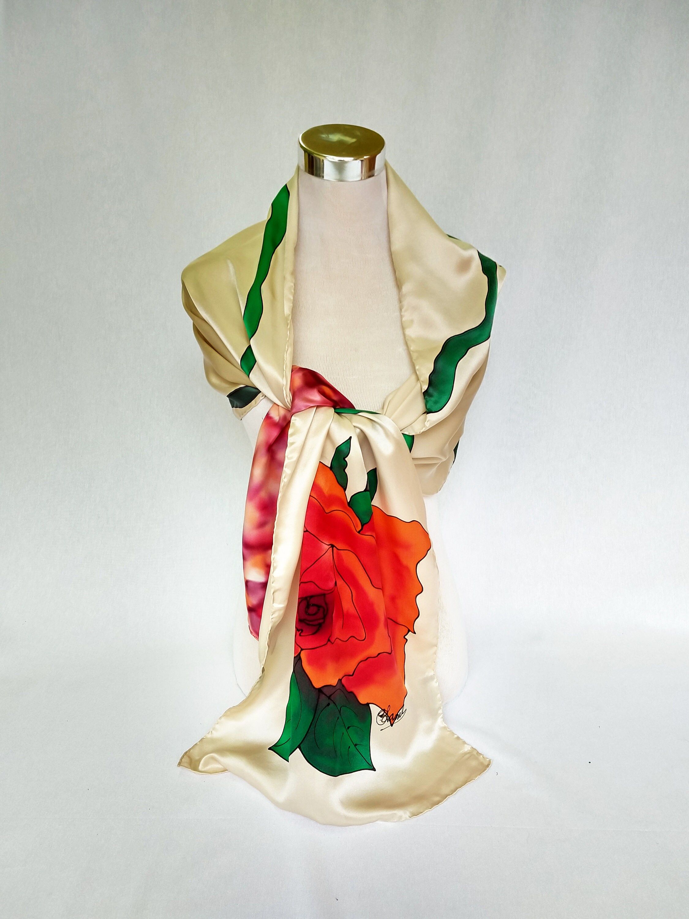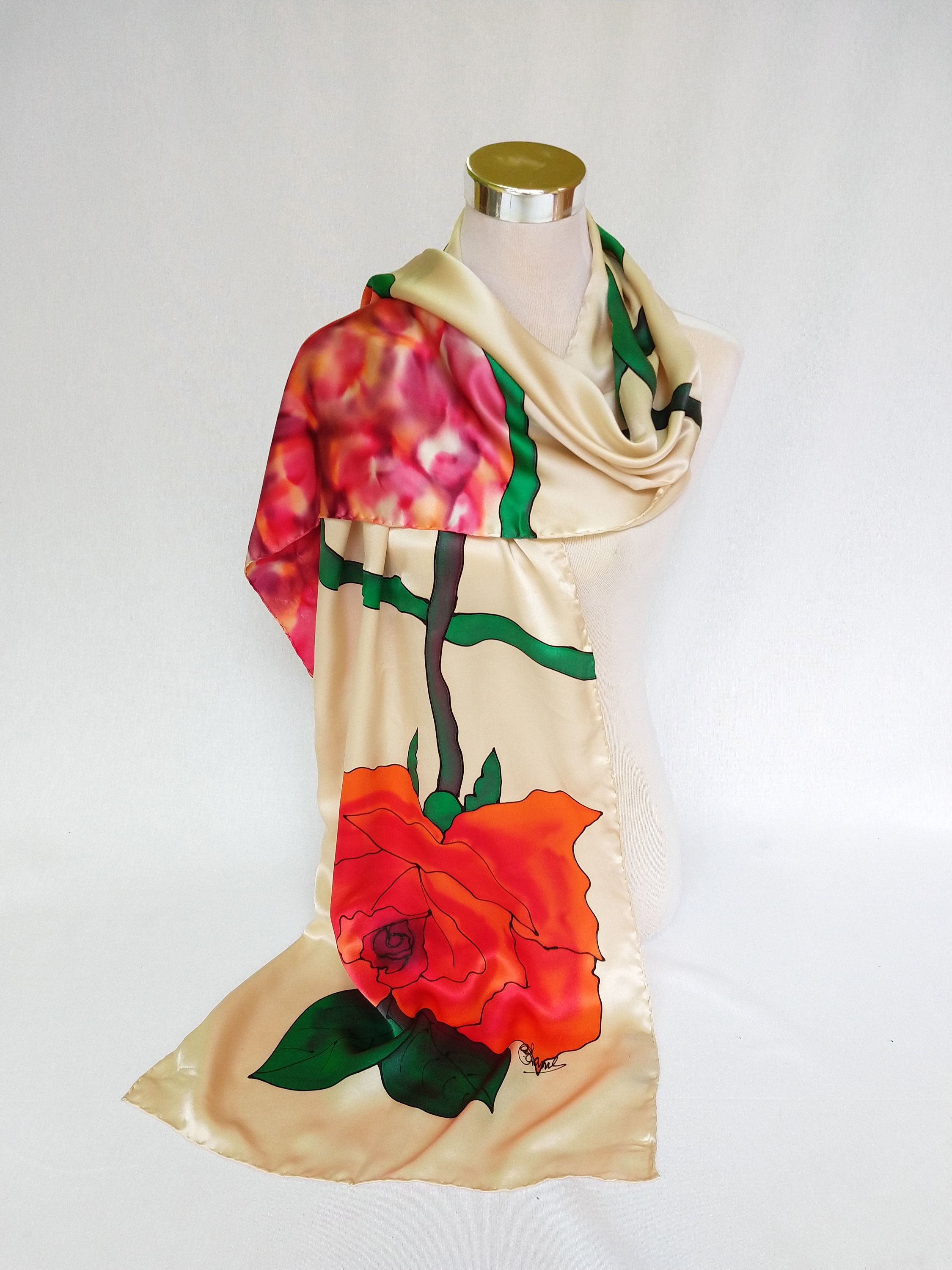 Elegante pañuelo de seda para bodas en color beige con un precioso estampado de flores rojas: ideal para mamás