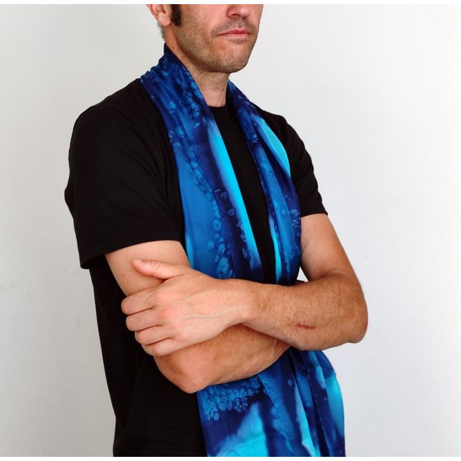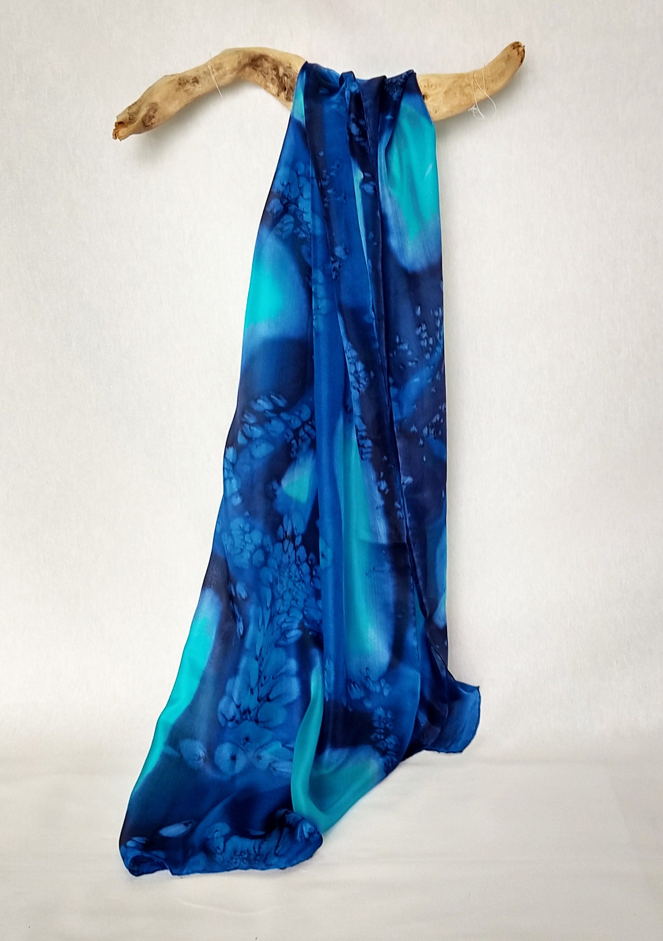 Bufanda de seda Deep Ocean – Chal de gasa azul pintado a mano – Chal hipoalergénico de lujo de 180 x 45 cm