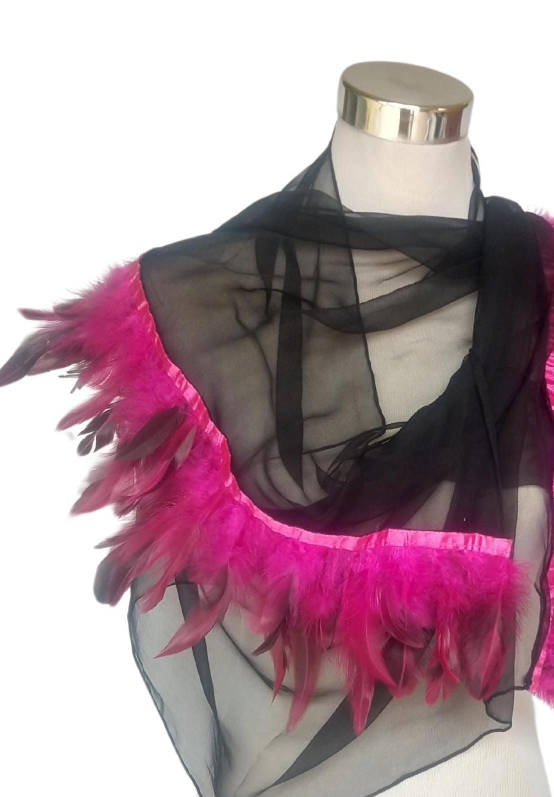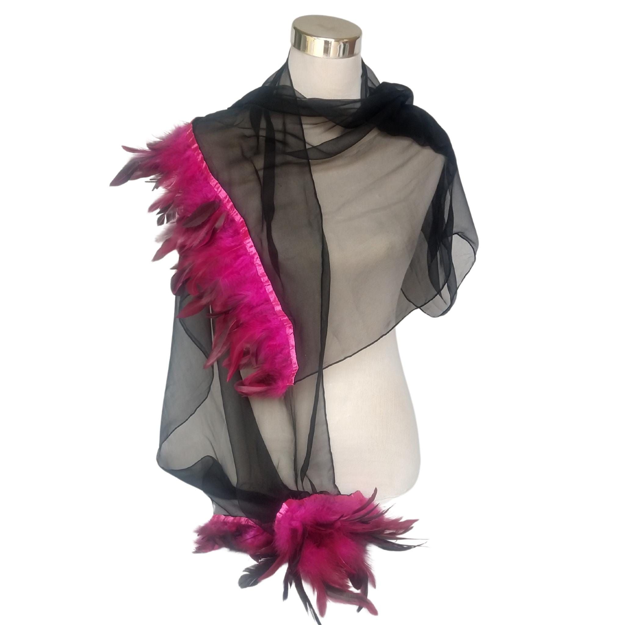 Chal de gasa de seda negra: ribete de plumas fucsias, elegante envoltura