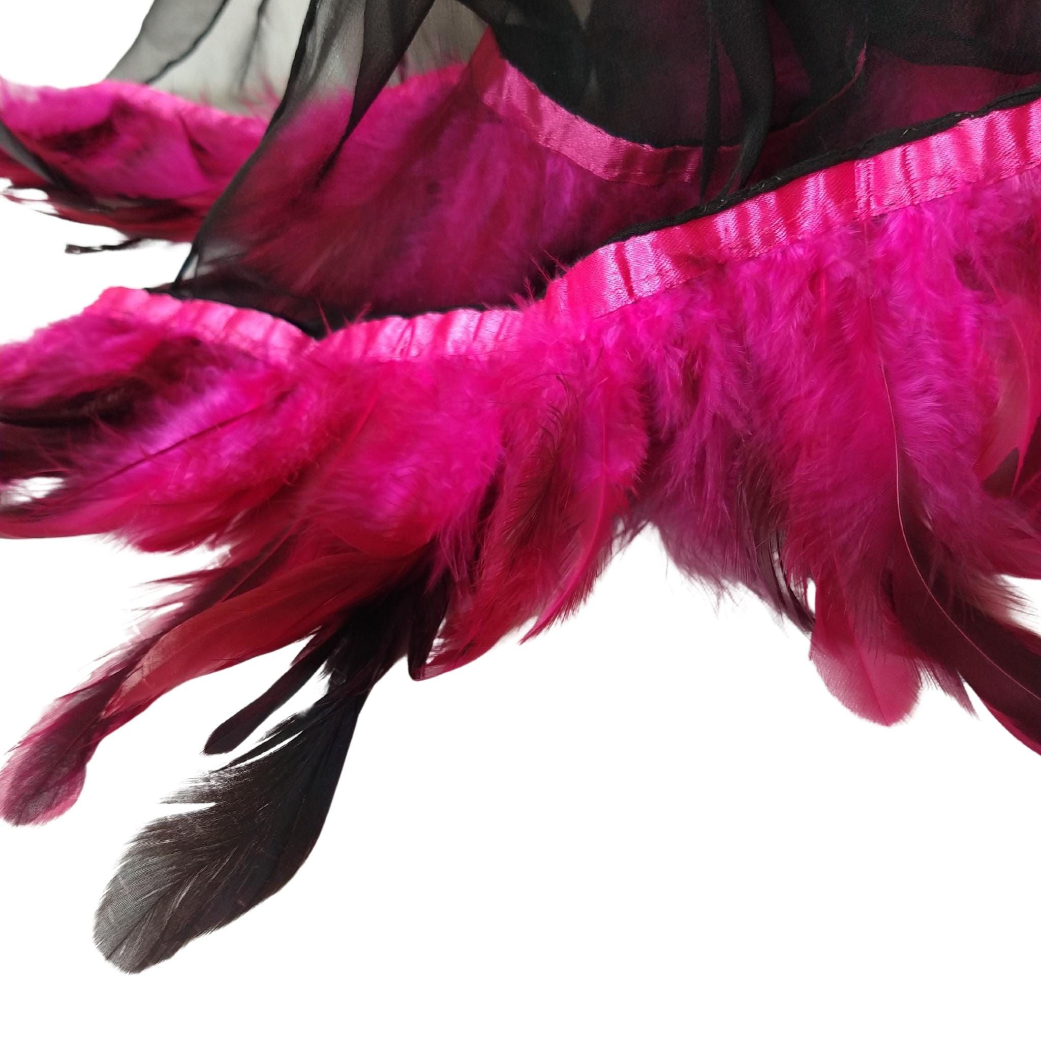 Luce una entrada espectacular con este chal de gasa de seda negra hecho a mano, adornado con llamativas plumas fucsia para un acabado dramático y elegante. Ligero, transparente e increíblemente chic, esta pieza única es perfecta para bodas, eventos formales, cócteles o una velada romántica.