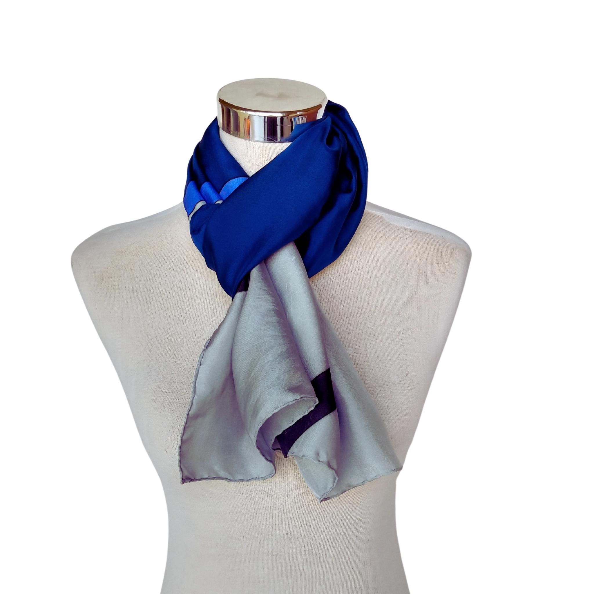 Adopte una sofisticación atemporal con este pañuelo de seda pintado a mano en serenos tonos azul marino y grises suaves. Diseñado para complementar estilos masculinos y femeninos, esta pieza irradia elegancia discreta y lujo discreto. Un accesorio versátil para cualquier temporada, combina a la perfección con ropa formal o añade un toque refinado a un atuendo informal.