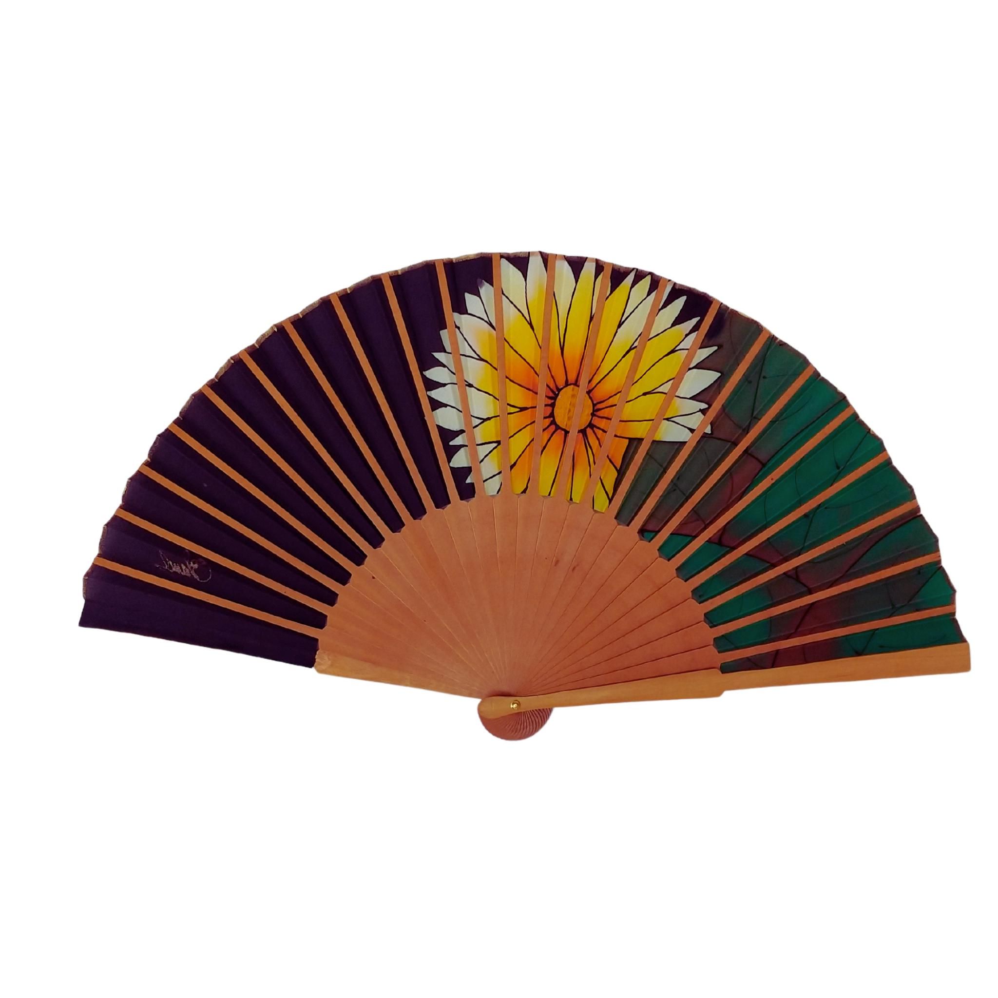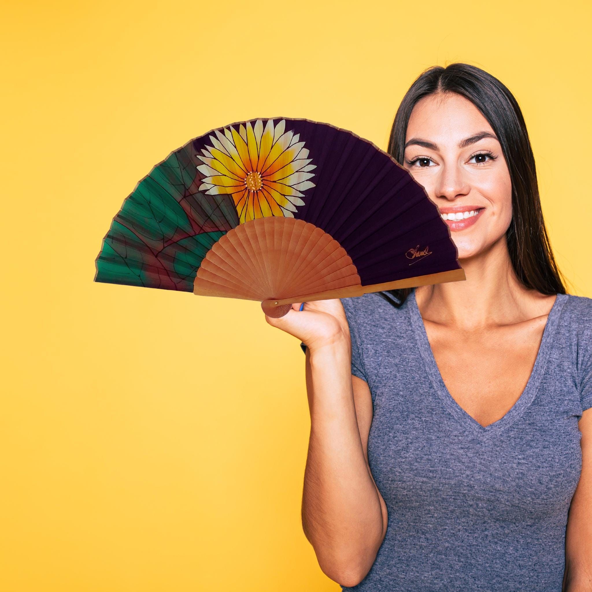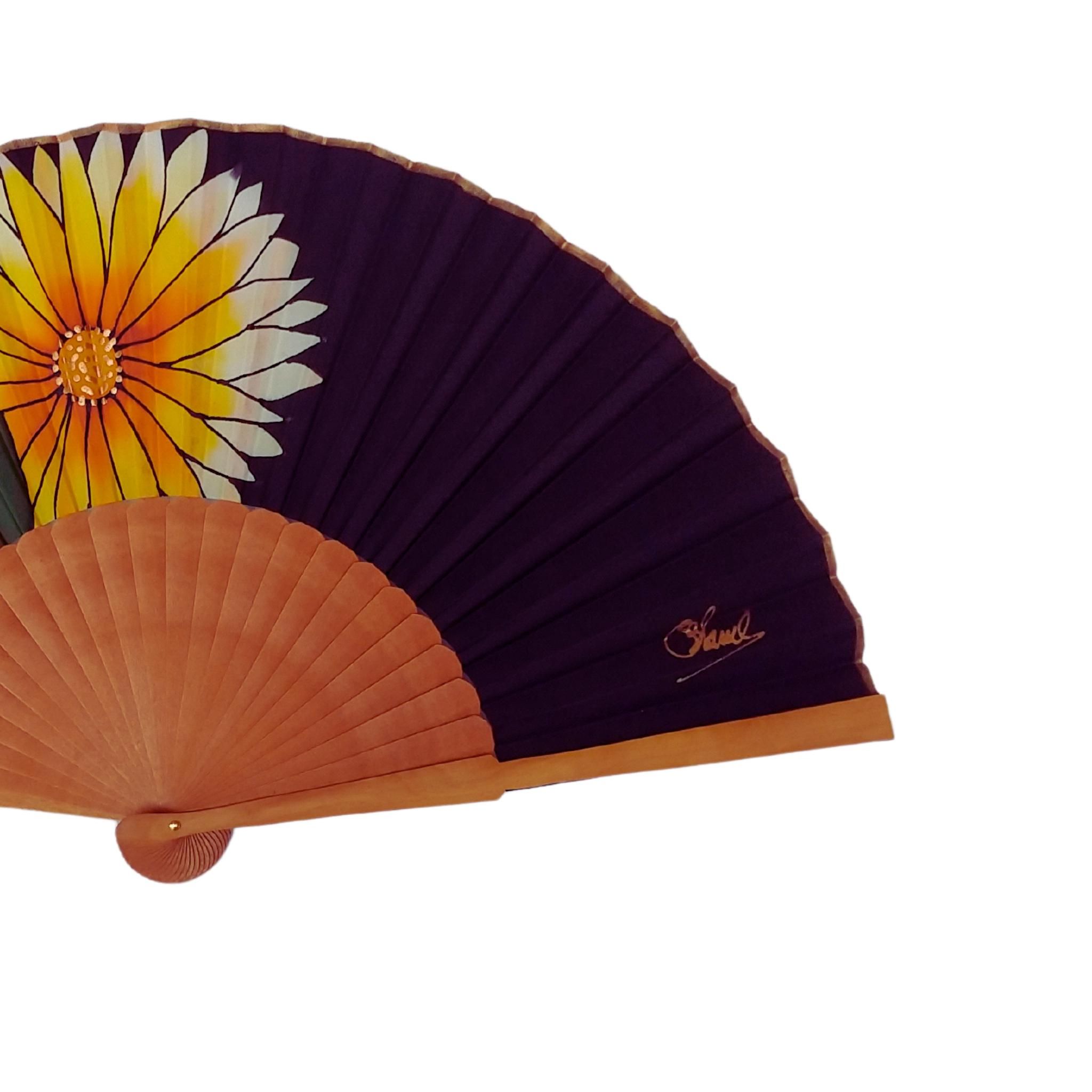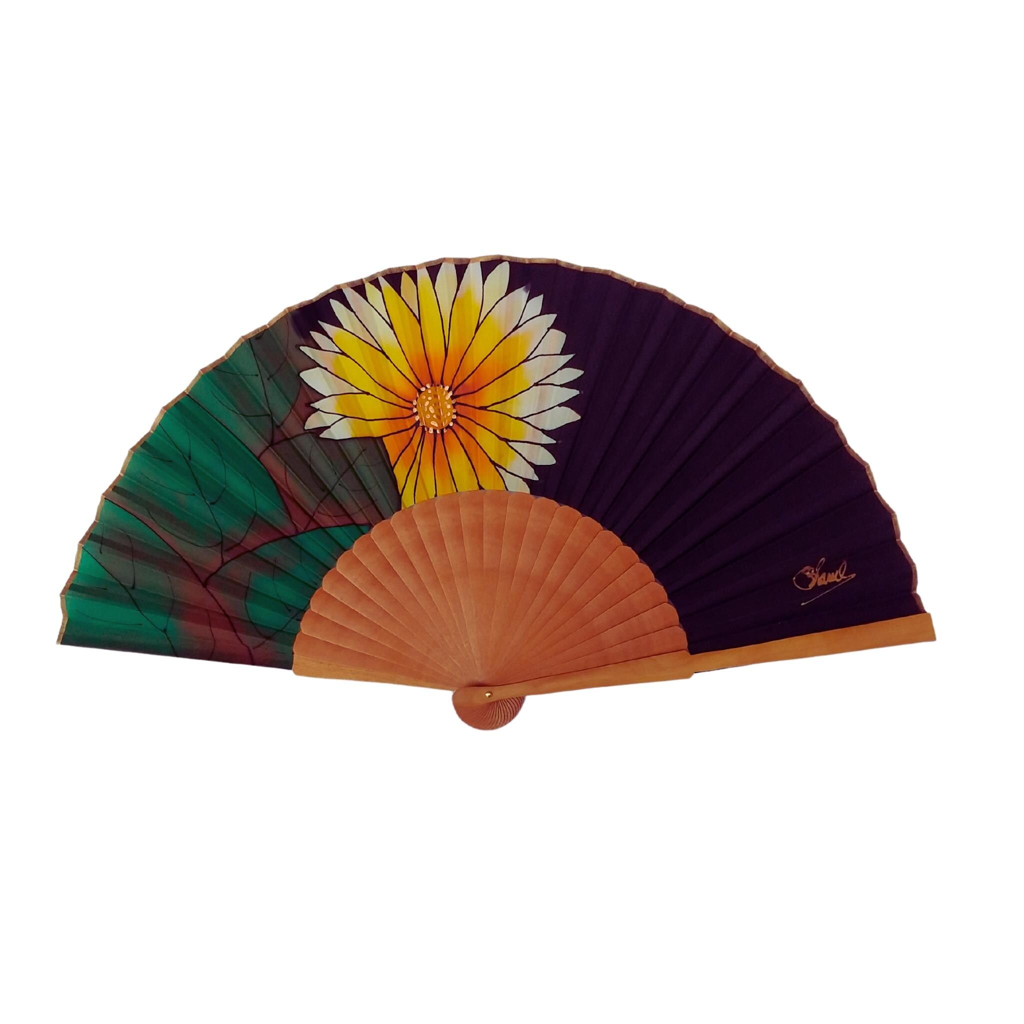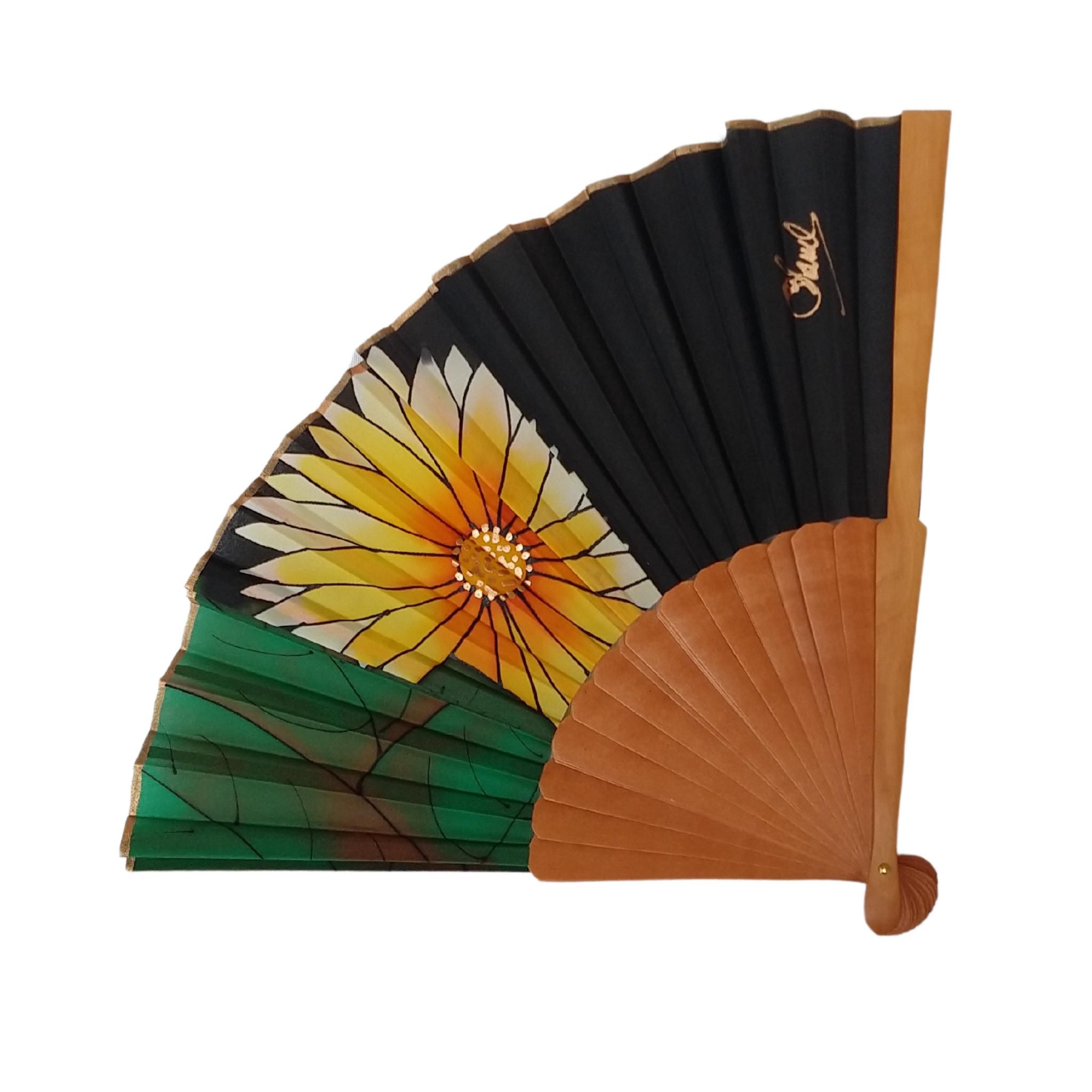 Disfrute de la elegancia de la naturaleza y la artesanía con este abanico de seda pintado a mano, que presenta una margarita floreciente sobre un fondo negro intenso. Los intrincados pétalos en tonos amarillo dorado y blanco, junto con las exuberantes hojas verdes, crean un contraste impactante, mientras que los delicados puntos dorados en el centro añaden un sutil toque de refinamiento.