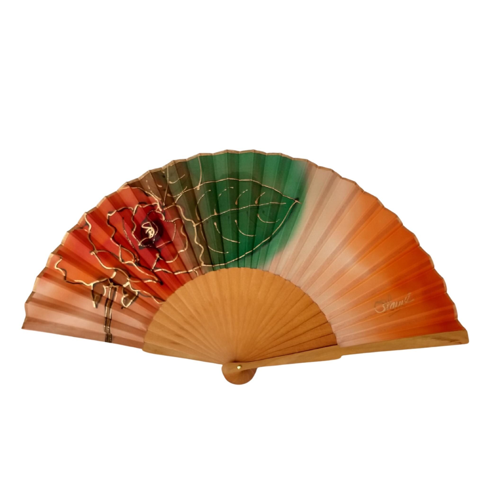 Cet impressionnant éventail en soie présente un dégradé exquis qui va de la terre cuite chaude au vert intense, reflétant la beauté de la nature. Une délicate rose peinte à la main avec des détails dorés ajoute une touche d'élégance, ce qui en fait un véritable chef-d'œuvre artisanal.