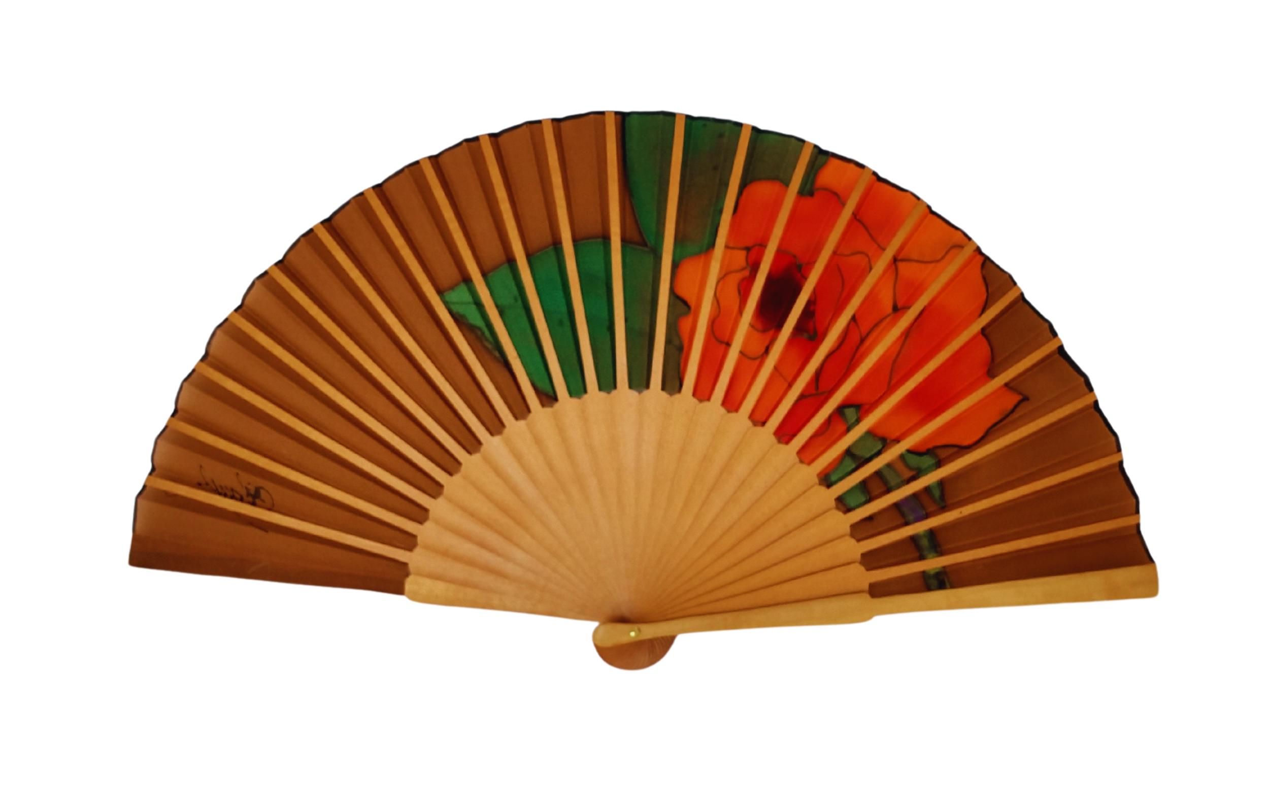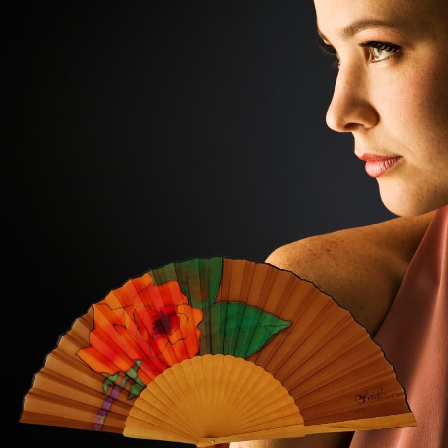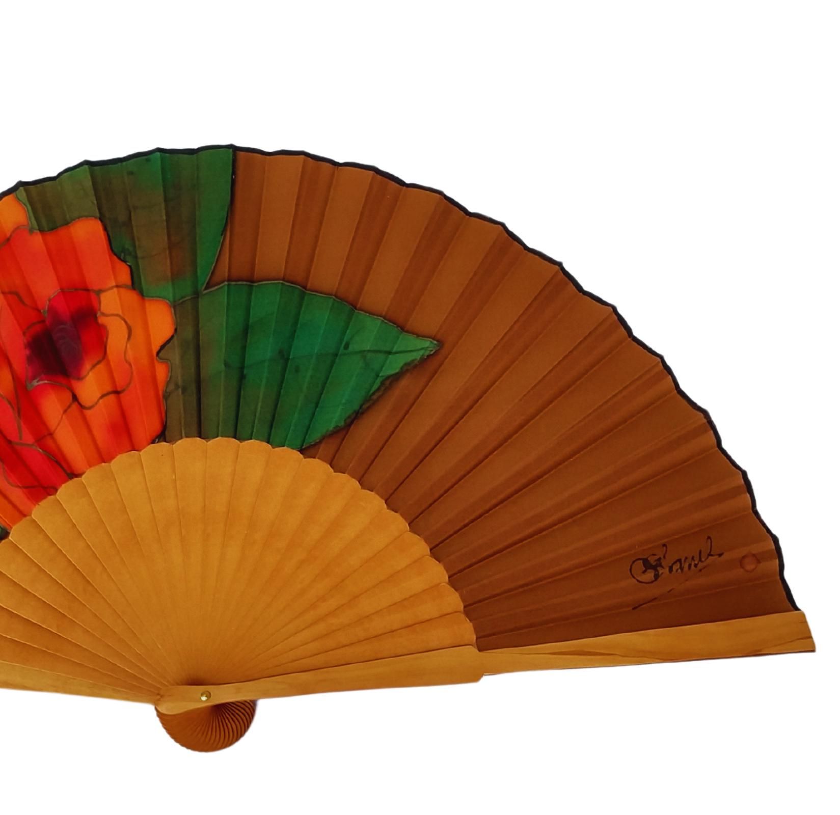 Abanico de seda pintado a mano: marrón tabaco, rosa roja, accesorio español