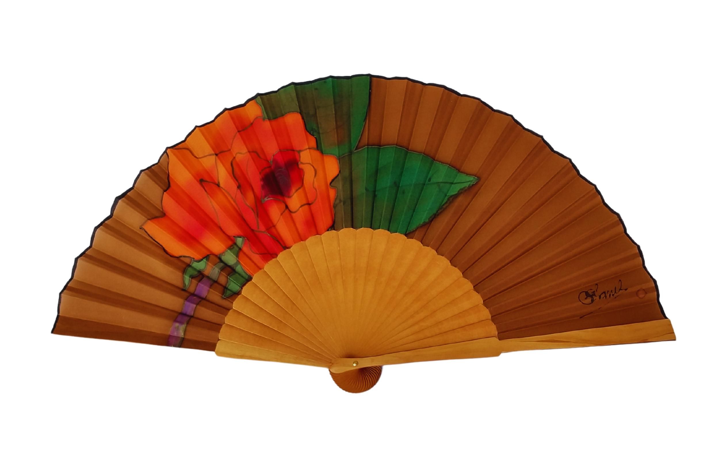 Este abanico de seda pintado a mano es un homenaje a la belleza natural y al estilo refinado. La seda de color marrón tabaco intenso crea un elegante fondo terroso para la rosa roja y naranja vibrante, creando un contraste impactante que irradia calidez y sofisticación.