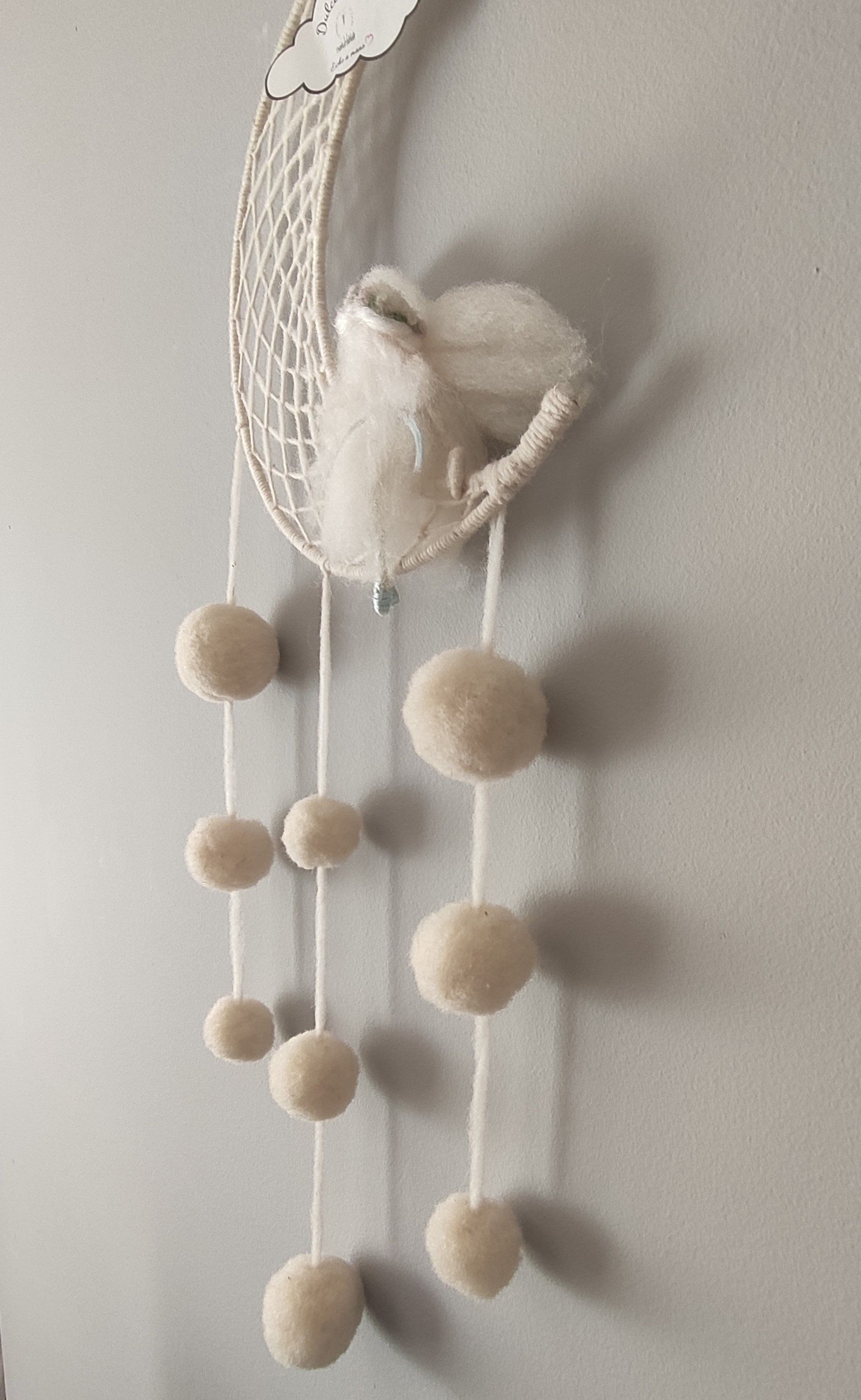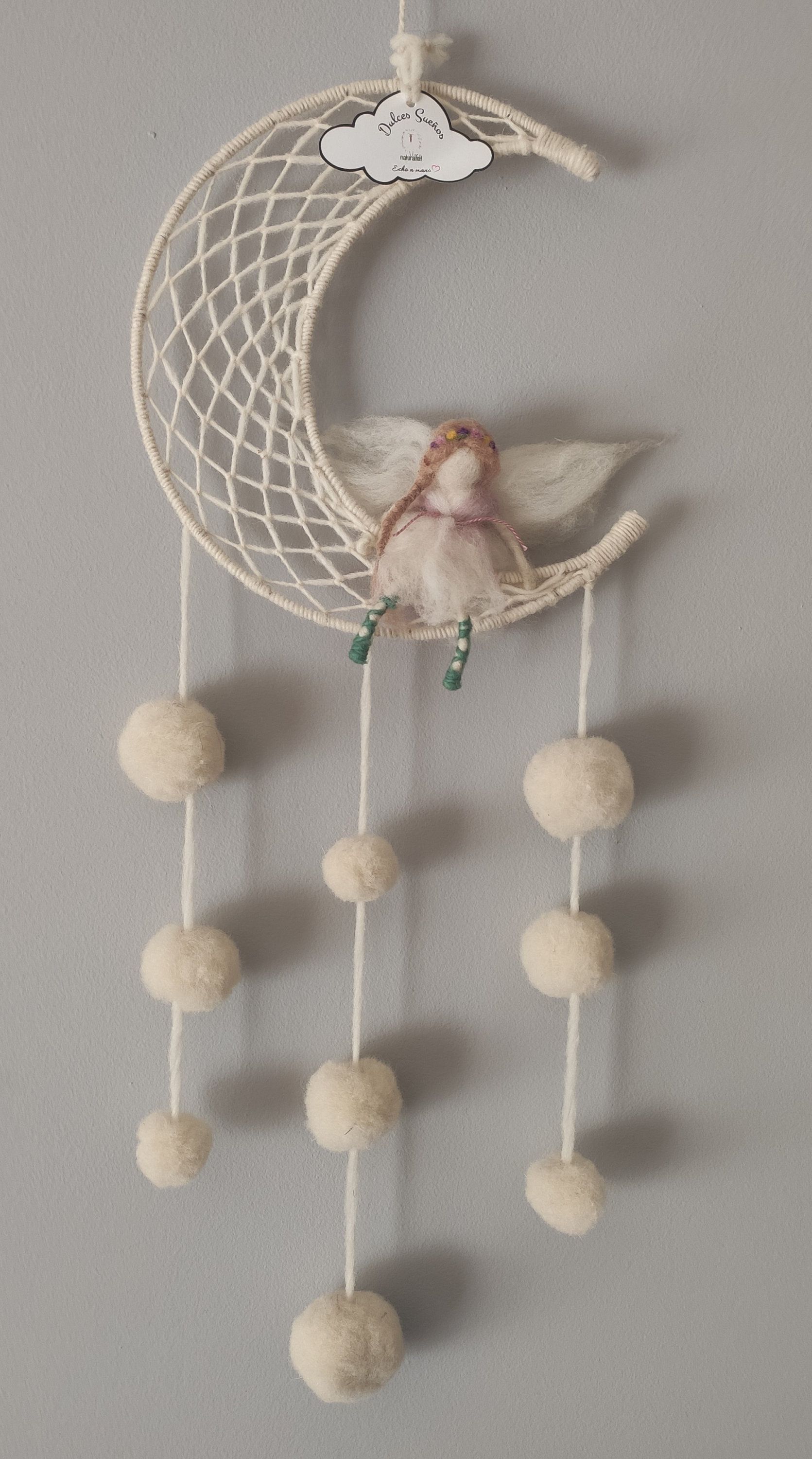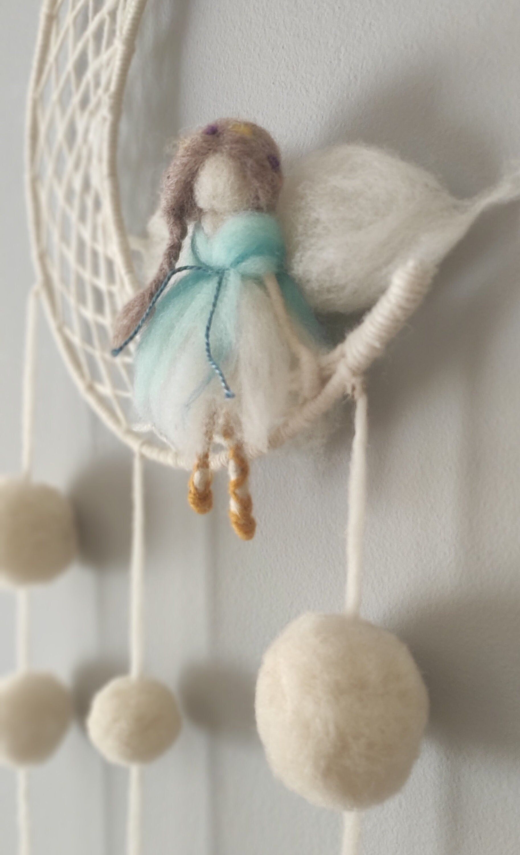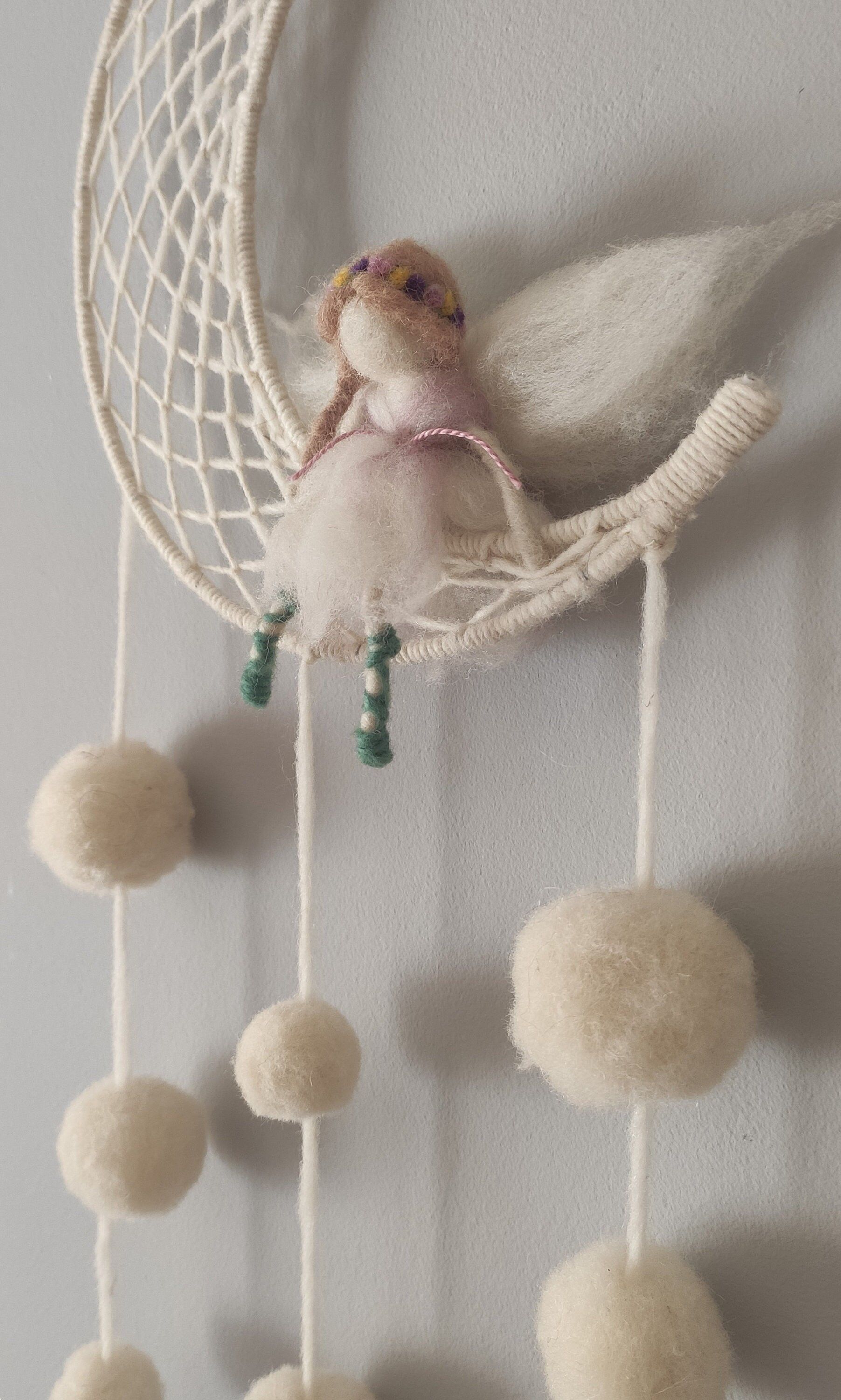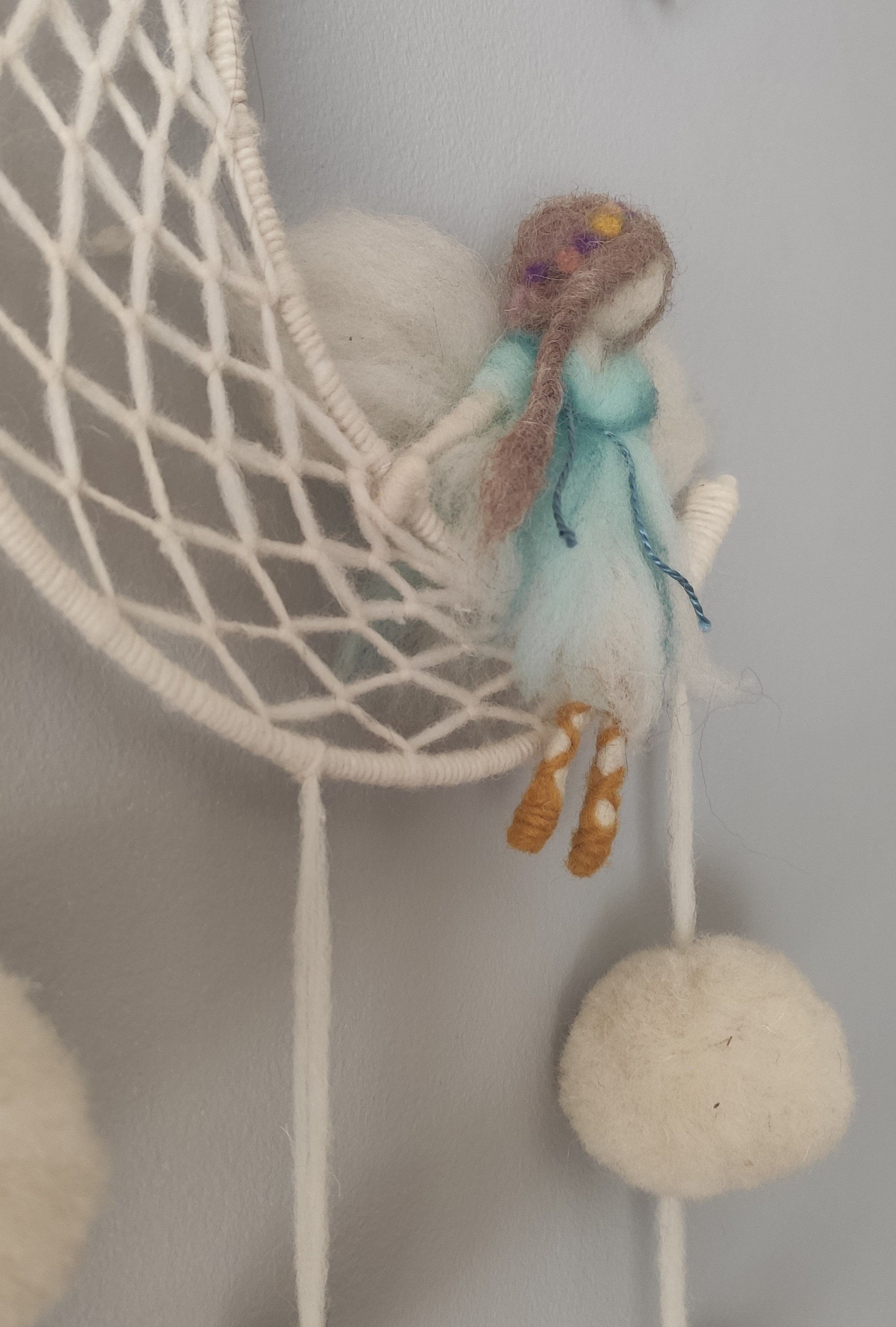 El Hada de los sueño . esta hecha en lana virgen blanca , con detalles en la vestimenta y el cabello con lana teñida con tintes vegetales