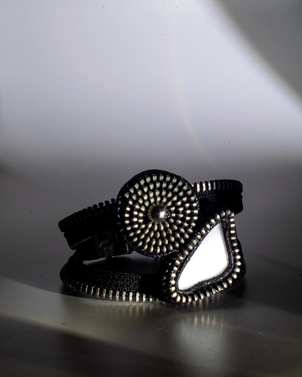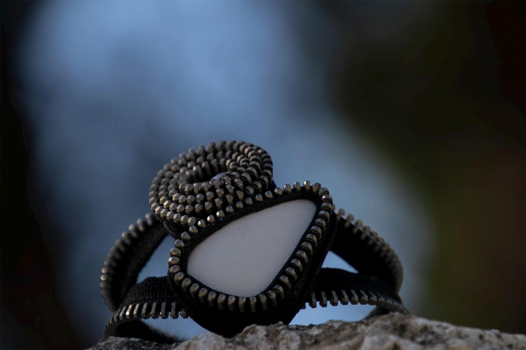 Pulsera hecha con cremallera y ceramica reciclada blanca , esta compuestramde un triangulo de ceramica rodeado de cremallera y na espiral de cremallera que forman la pieza unica.