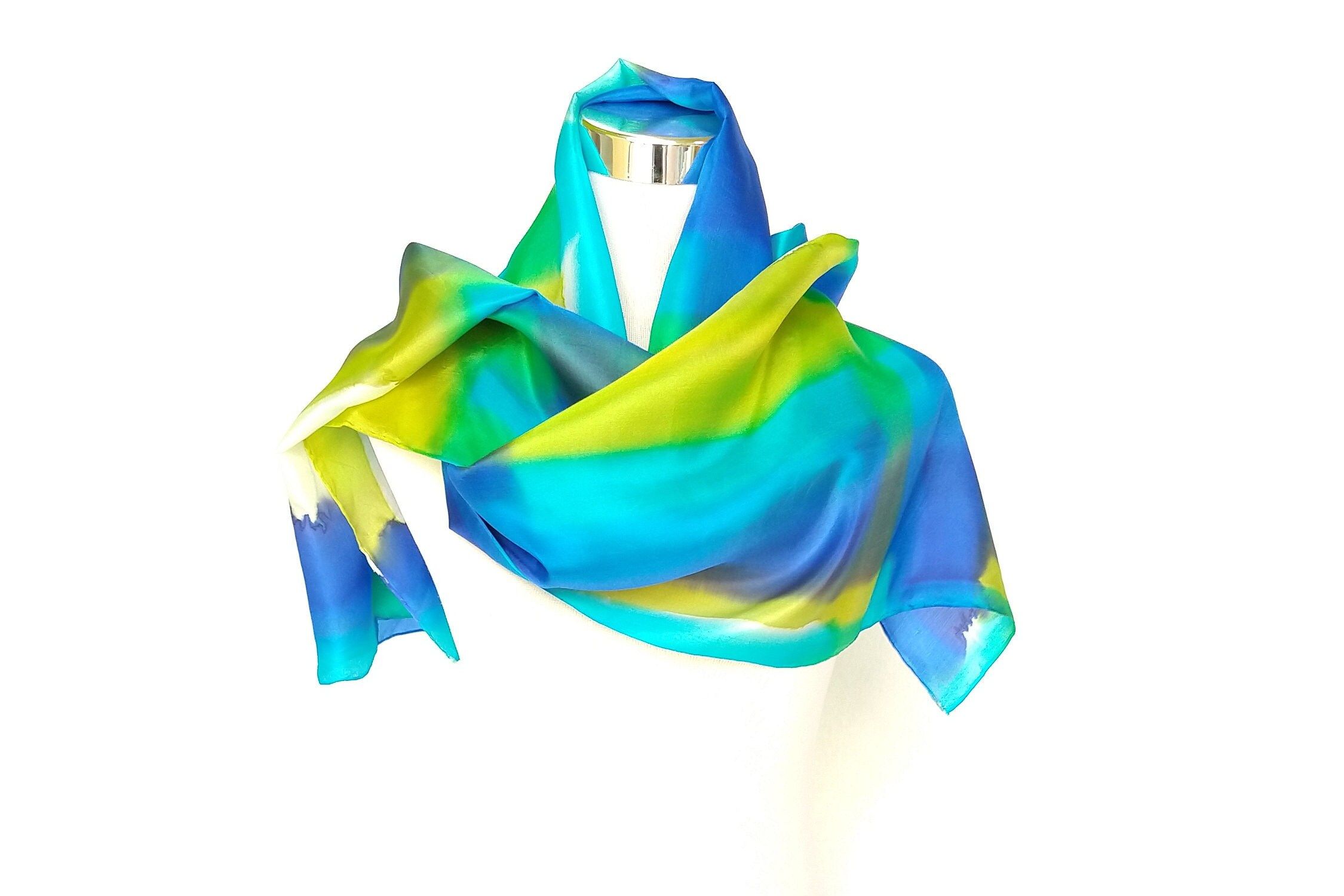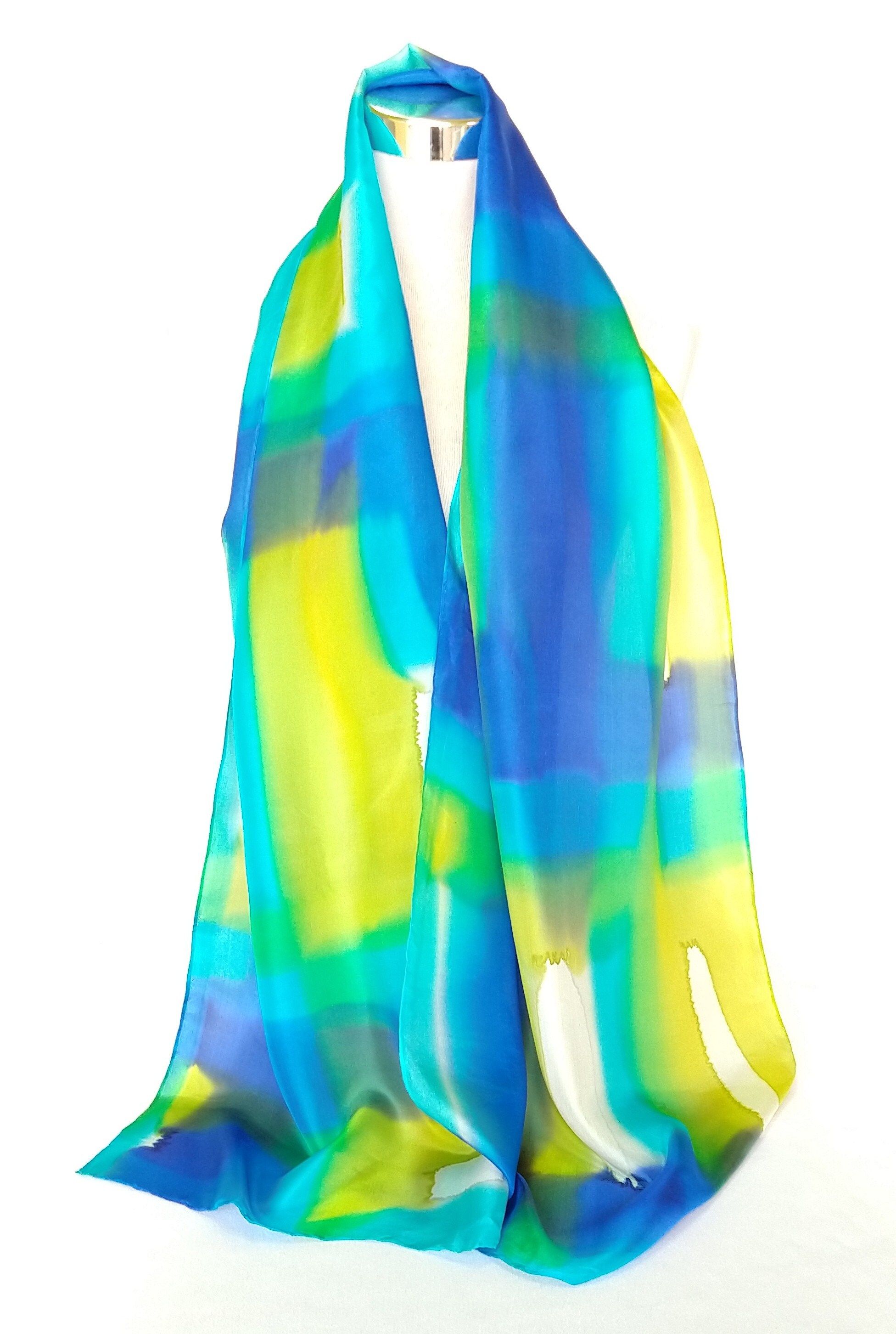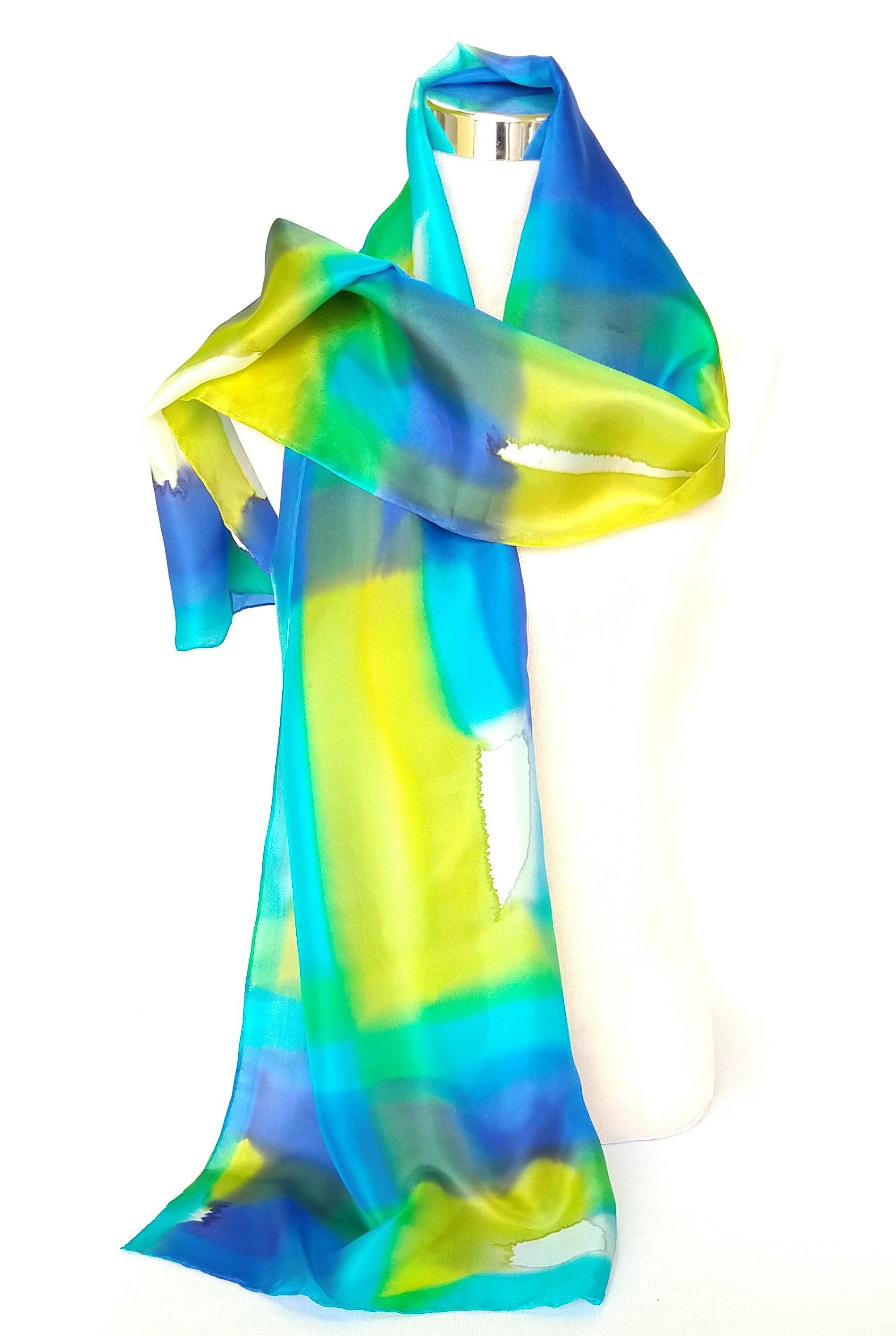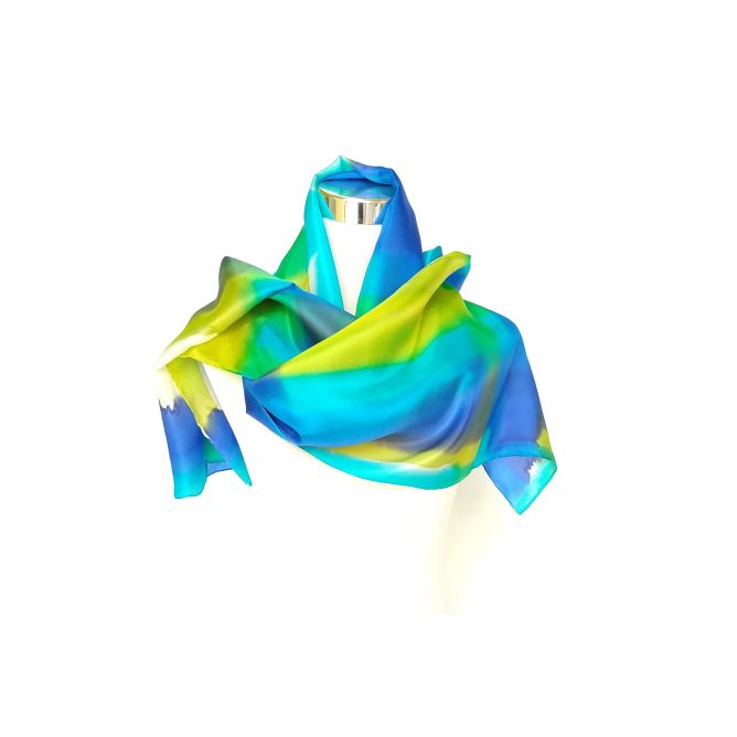 Gran bufanda de seda abstracta en azul y lima: elegante accesorio de moda para mujer, 45 x 183 cm