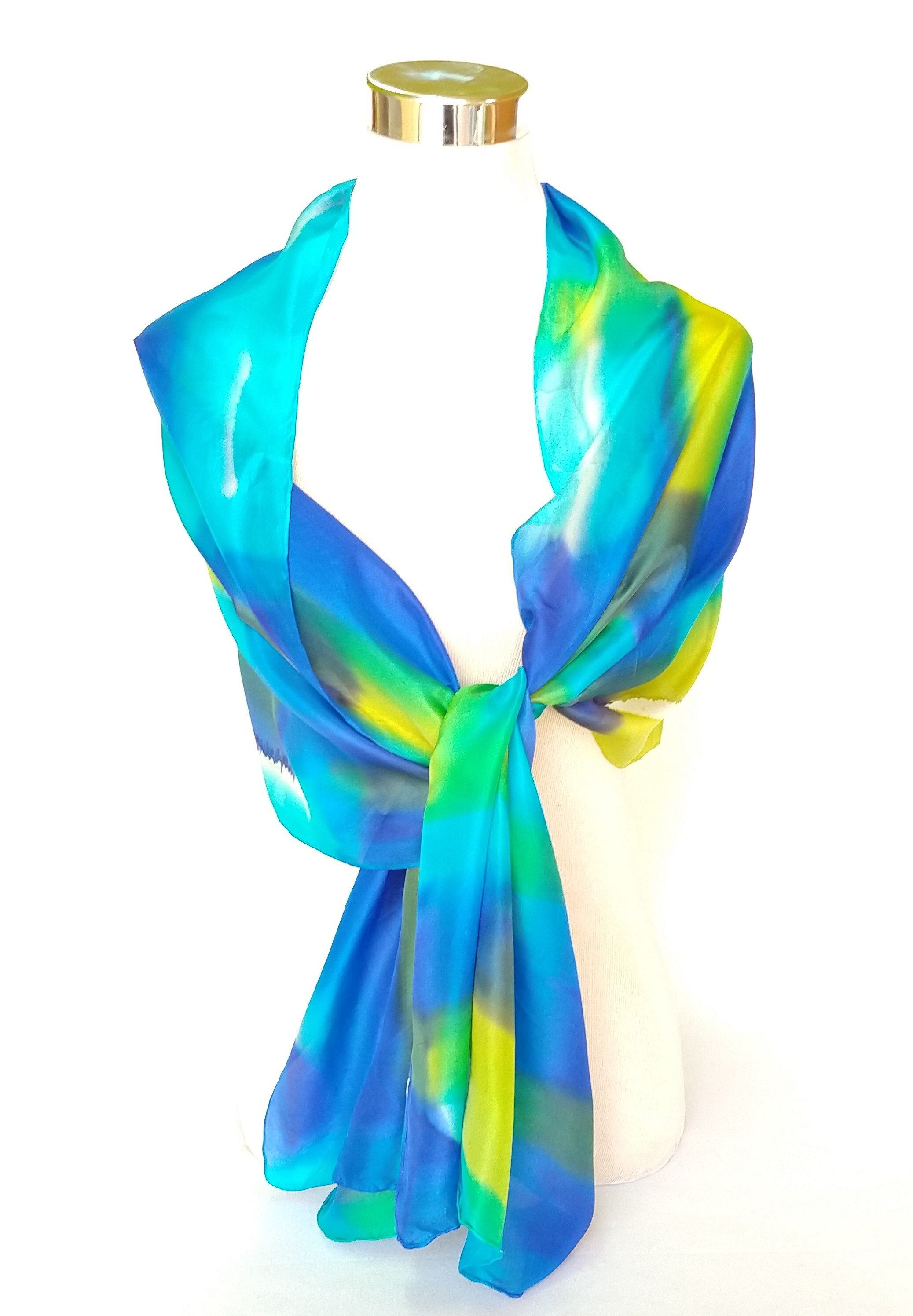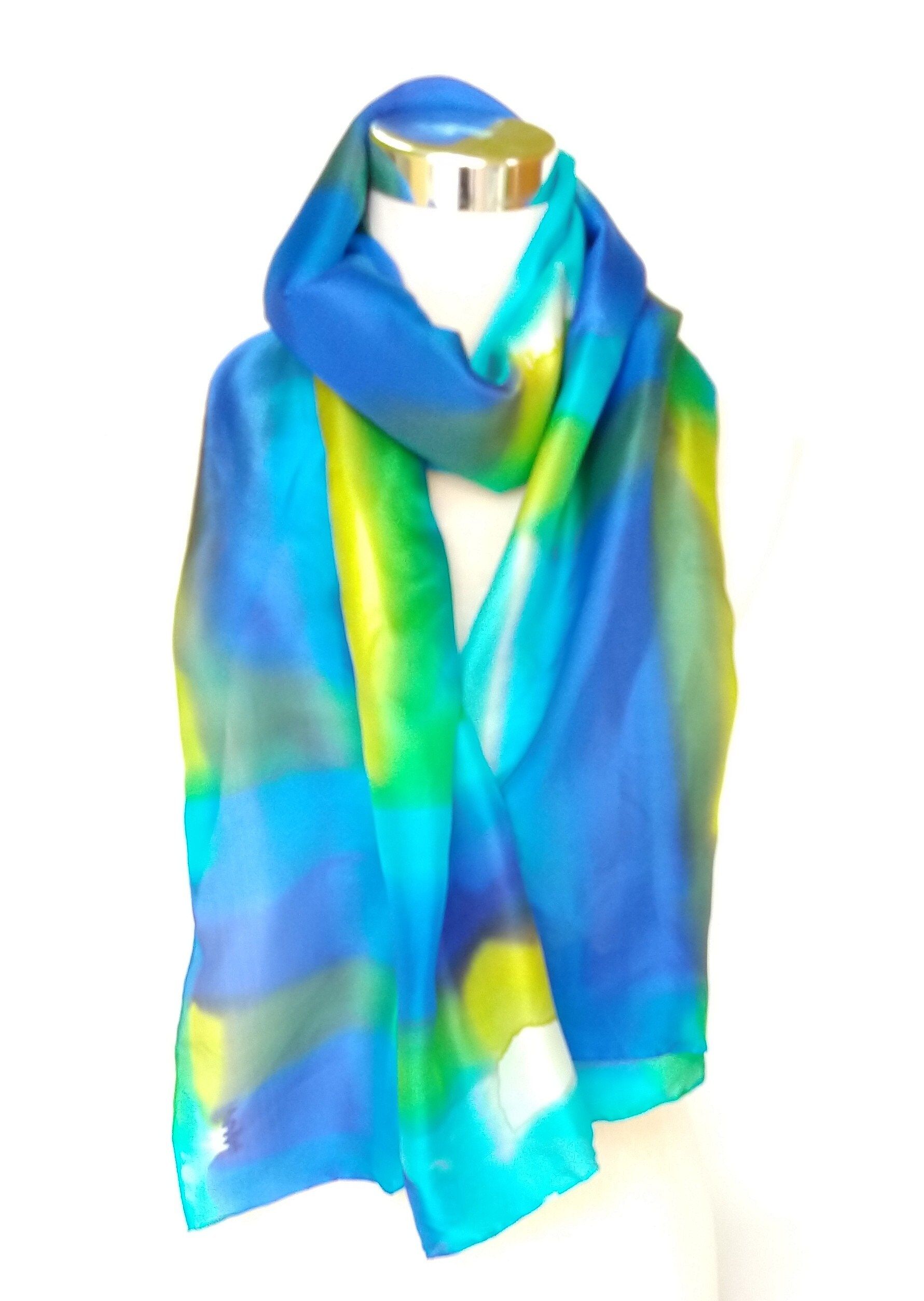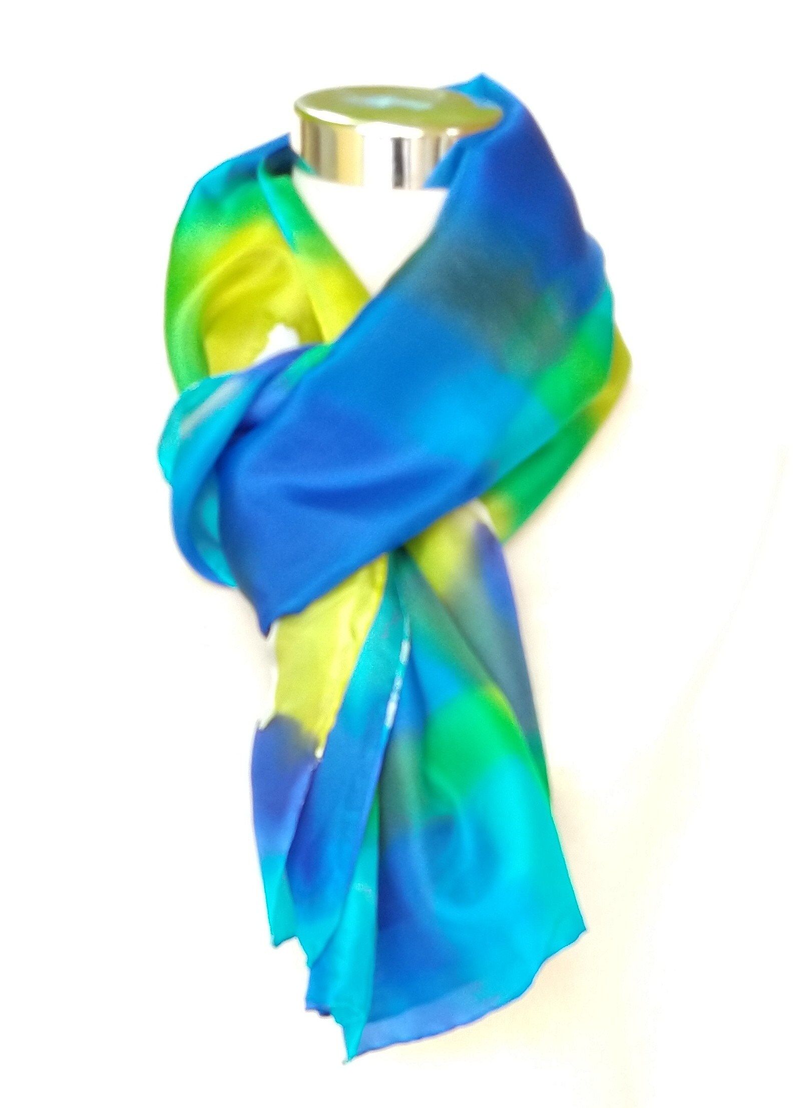 Gran bufanda de seda abstracta en azul y lima: elegante accesorio de moda para mujer, 45 x 183 cm
