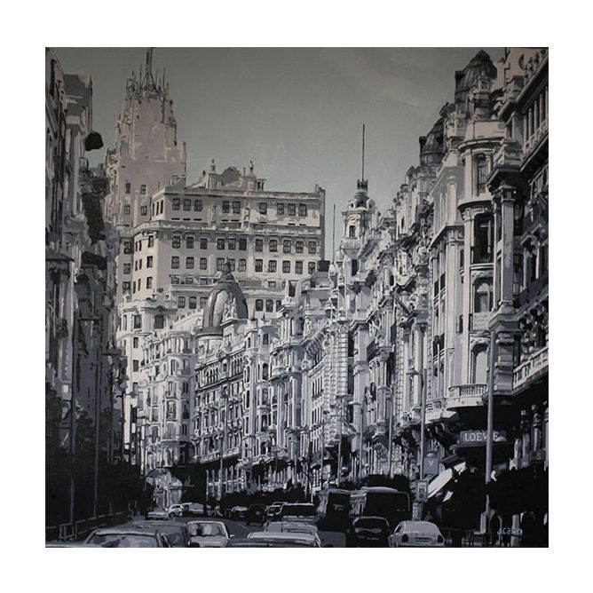 Esta impresionante pintura al óleo sobre tela, realizada por Javier Calvo, captura la esencia de la Gran Vía con una maestría que combina técnica y emoción. Cada pincelada refleja su profundo compromiso con los detalles: desde las luces que se desvanecen en el horizonte hasta la textura vibrante de las fachadas urbanas. Conocido por su capacidad para dotar de vida a los paisajes urbanos, Calvo crea piezas que trascienden lo decorativo y conectan con la identidad cultural de Madrid.