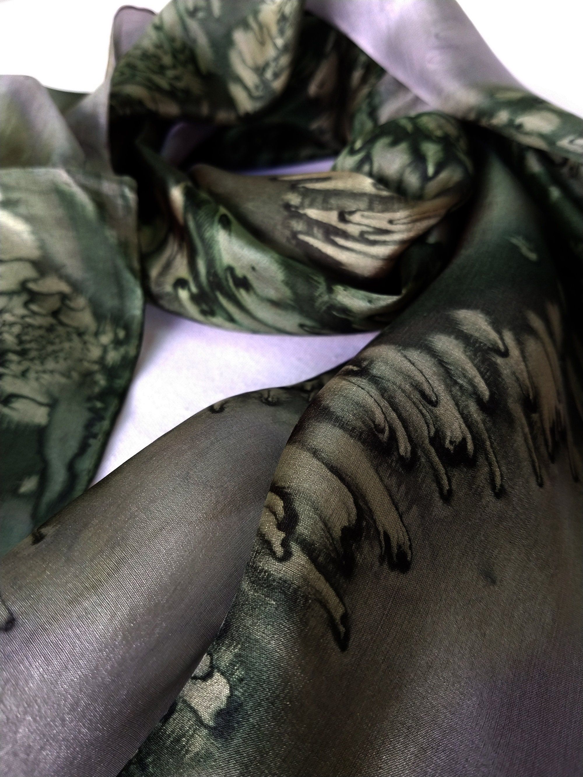 Impresionante bufanda de seda pintada a mano, verde oliva: regalo ideal para hombres: extragrande, elegante y única
