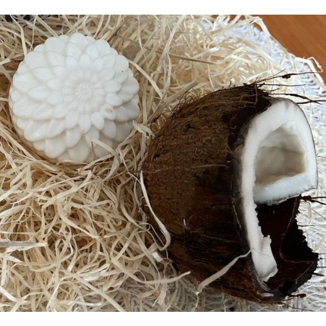 Base de jabón de glicerina opaca (Ingredients: Aqua (Water), Glycerin, Propylen Glycol, Sodium Laureth Sulfate, Sodium Stearate, Sorbitol, Sodium Laurate, Sodium Chloride, Sodium Thiosulfate, Etidronic Acid, CI 77891) y/o base de jabón de glicerina translúcida (Ingredients: Glycerin, Aqua, Sorbitol, Stearic Acid, Dipropylene Glycol, Sodium Coco Sulfate, Lauric Acid, Sodium Thiosulfate, Coco Glucoside, Sodium Chloride, Etidronic Acid), coco en polvo, aceite de coco y aroma de coco.