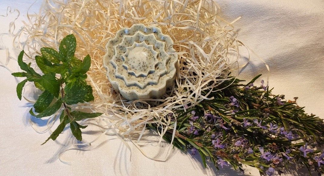 El Jabón de Glicerina con Menta y Romero refresca y ayuda a reparar y cicatrizar.