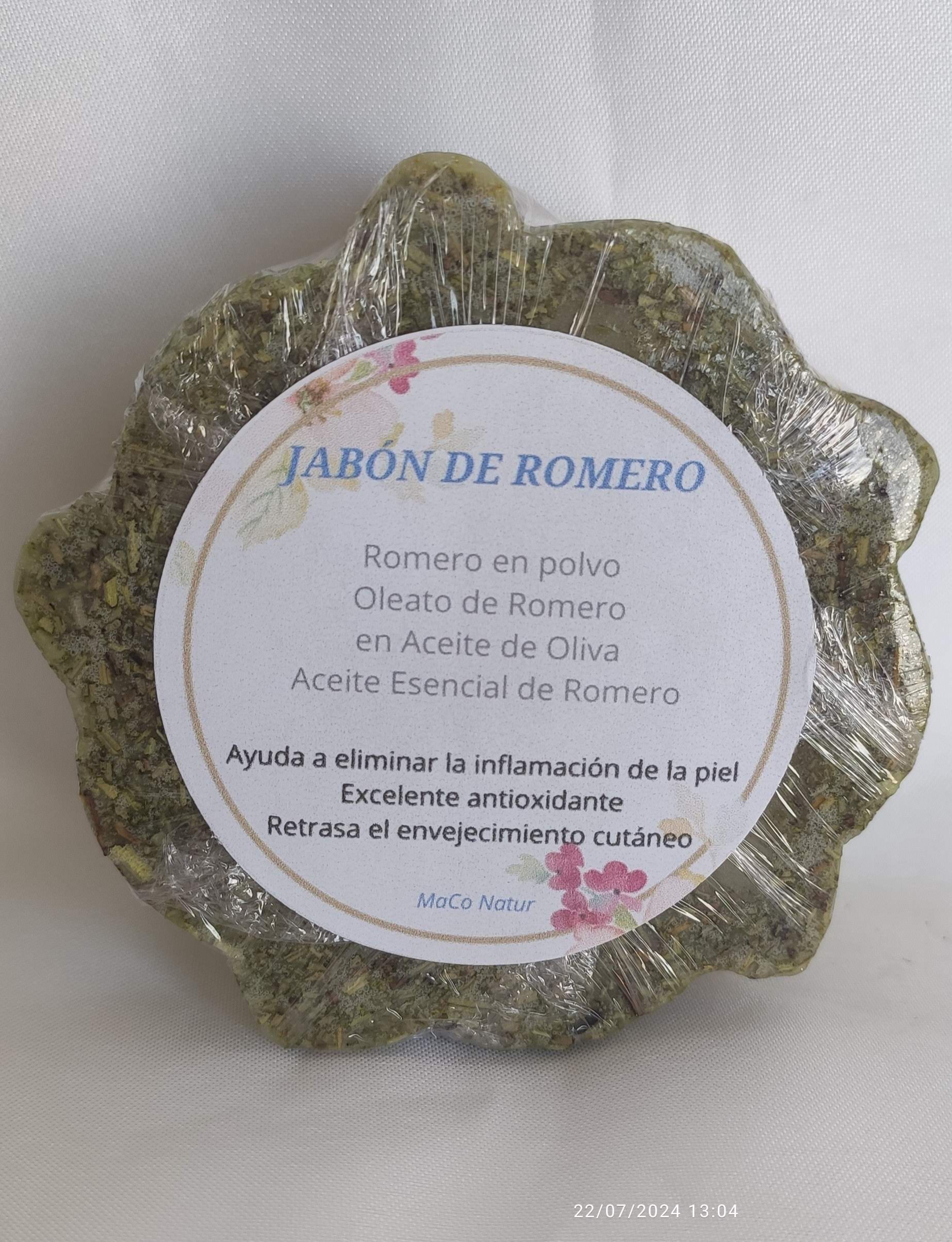 Base de jabón de glicerina opaca (Ingredients: Aqua (Water), Glycerin, Propylen Glycol, Sodium Laureth Sulfate, Sodium Stearate, Sorbitol, Sodium Laurate, Sodium Chloride, Sodium Thiosulfate, Etidronic Acid, CI 77891) y/o base de jabón de glicerina translúcida (Ingredients: Glycerin, Aqua, Sorbitol, Stearic Acid, Dipropylene Glycol, Sodium Coco Sulfate, Lauric Acid, Sodium Thiosulfate, Coco Glucoside, Sodium Chloride, Etidronic Acid), romero en polvo, oleato de romero en aceite de oliva y aceite esencial de romero.