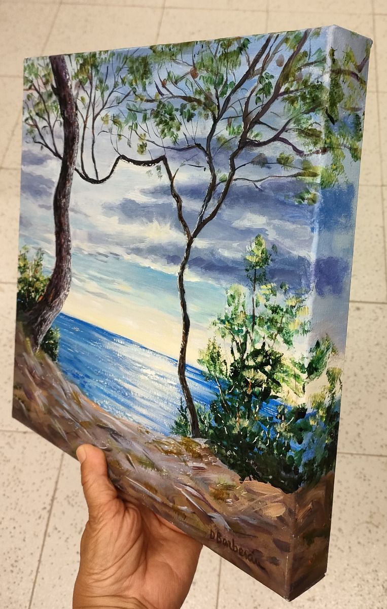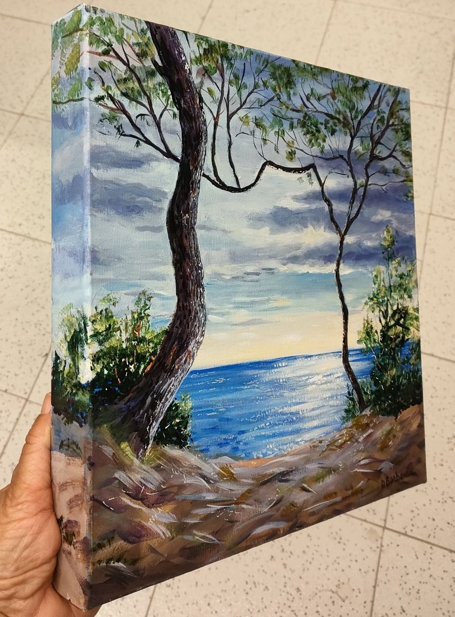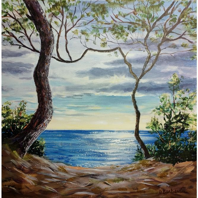 Desde el Bosc de la Marquesa en Tarragona, un espacio natural con pinos centenarios sobre suelo arenoso, un sendero nos lleva hasta un acantilado desde el que se divisa el mar Mediterráneo. El cielo es muy azul y en esta ocasión levemente nublado.