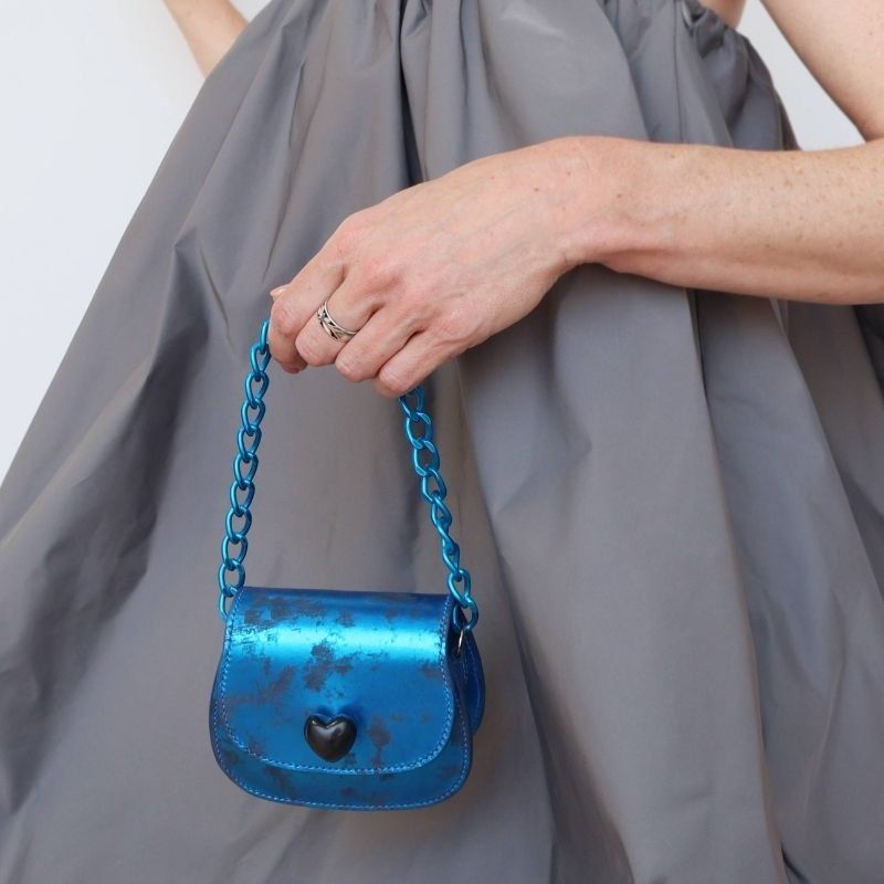 Colección Amore Lento: cinco bolsos iguales en forma y distintos sólo en color. Cuero metalizado trabajado a mano y un corazón realizado con la técnica de pulido por capas —capas apiladas, talladas, lijadas y bruñidas a mano—. Un talismán que refleja tu fuerza y tu ritmo.