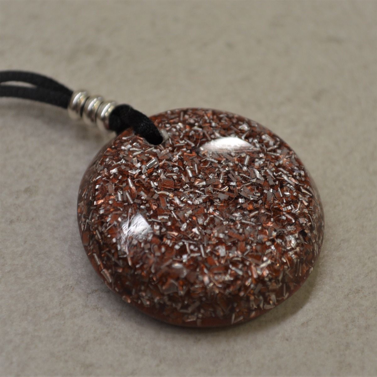 Este modelo de orgonita, es un modelo clásico, su composición es resina de poliéster con virutas de metal (aluminio) en una proporción al 50%, y en su interior un cuarzo y chips de cuarzo recogidos en la montaña del Montseny, debidamente activados durante 3 noches a la luz de la luna llena y programados debidamente.