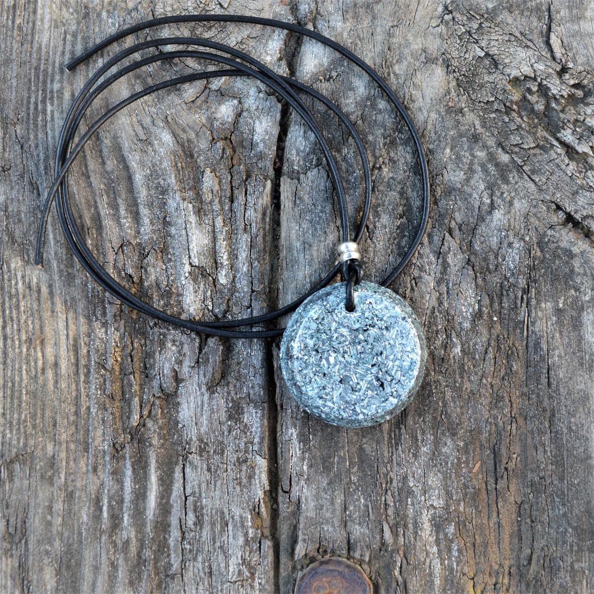Lleva un cordón de cuero natural ajustable en altura de color negro, los abalorios son de plata.