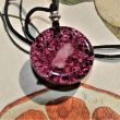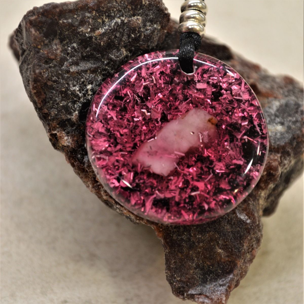 Este modelo de orgonita colgante, es un modelo clásico, su composición es resina de poliéster, con virutas de metal (aluminio) en una proporción al 50%, chips de Shungita y un cuarzo en su interior. Color rosa fucsia.