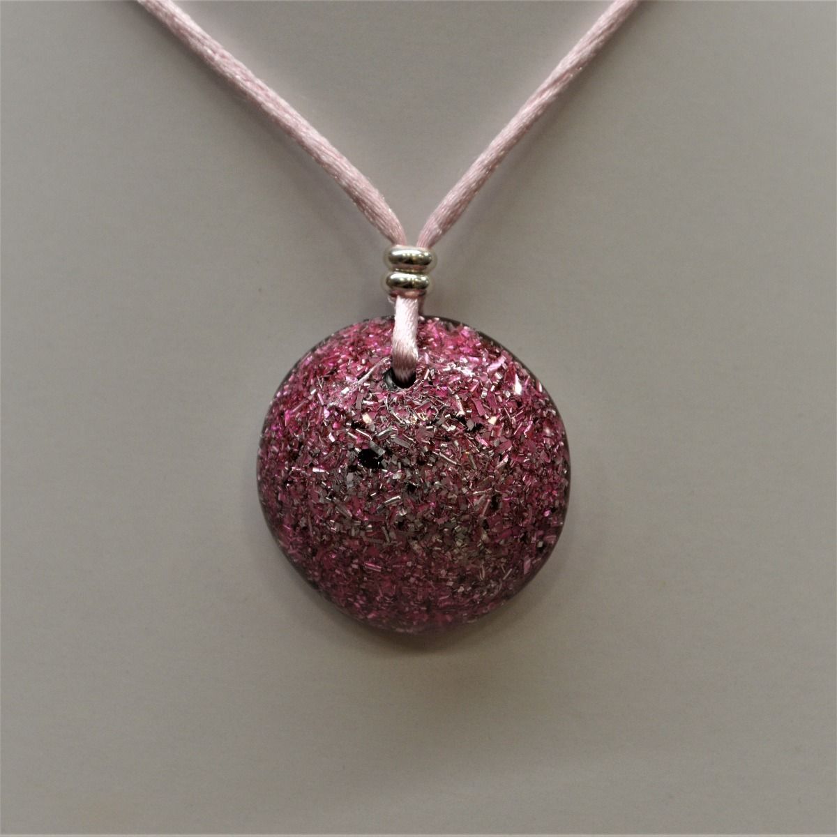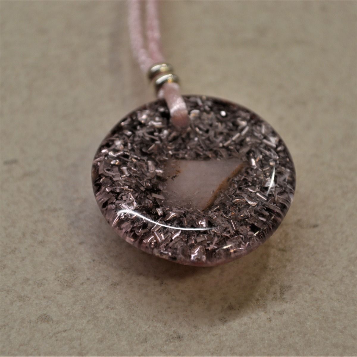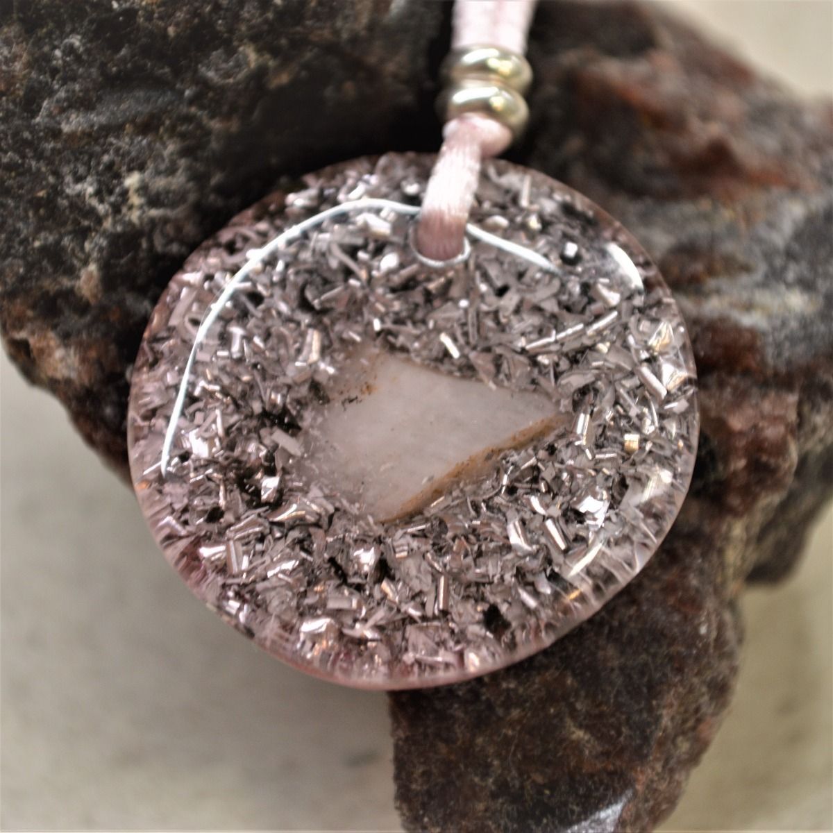 Este modelo de orgonita colgante, es un modelo clásico, su composición es resina de poliéster con virutas de metal (aluminio), en una proporción al 50%, y un cuarzo en su interior. Color rosa suave.