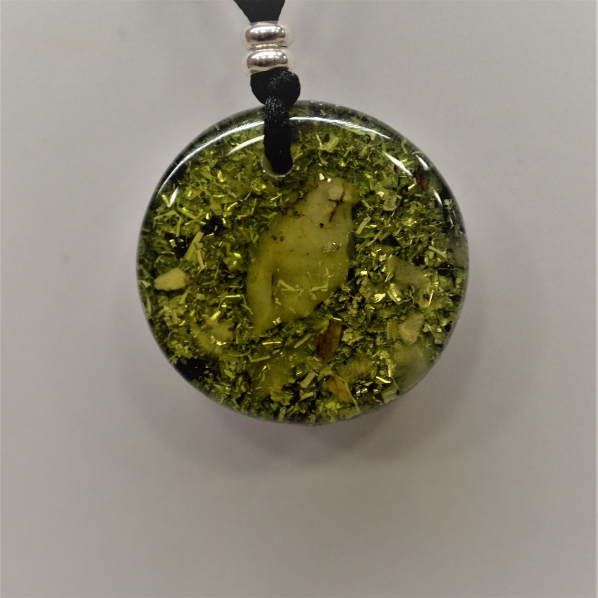 Este modelo de orgonita colgante, es un modelo clásico, su composición es resina de poliéster con virutas de metal (aluminio), en una proporción al 50%, y un cuarzo en su interior. Color verde pistacho.