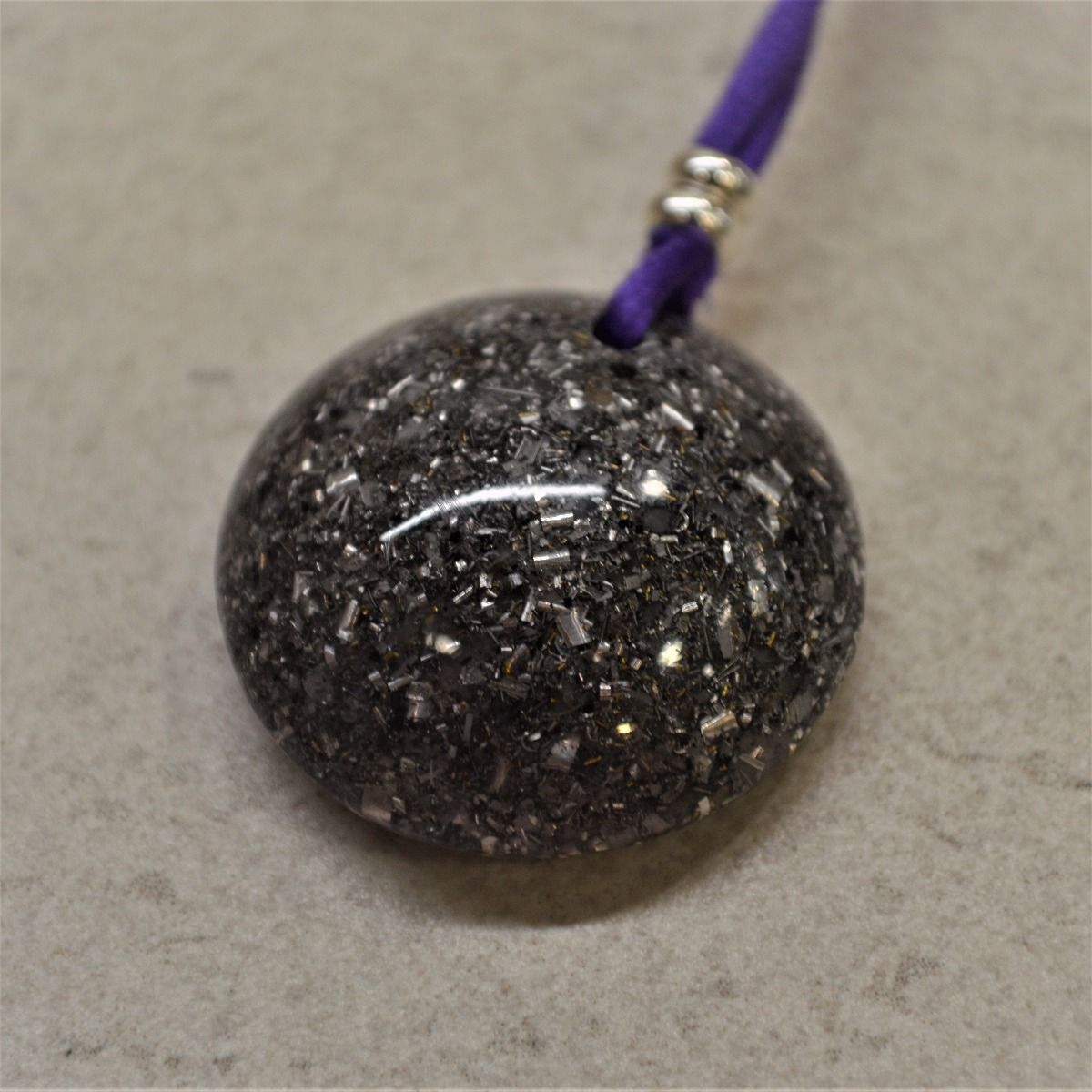 Este modelo de orgonita colgante, es un modelo clásico, su composición es resina de poliéster con virutas de metal (aluminio), en una proporción al 50%, y un cuarzo en su interior. Color violeta.