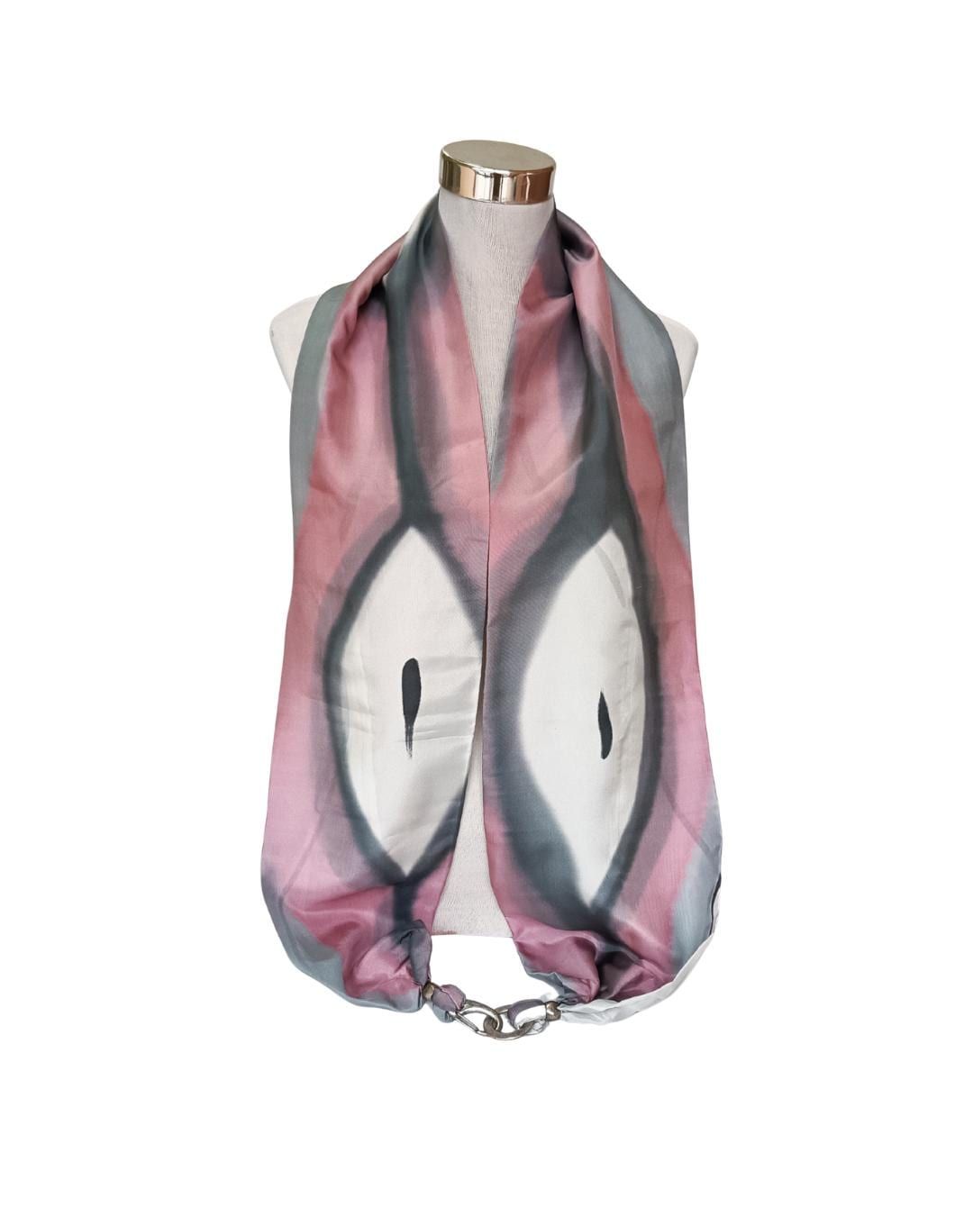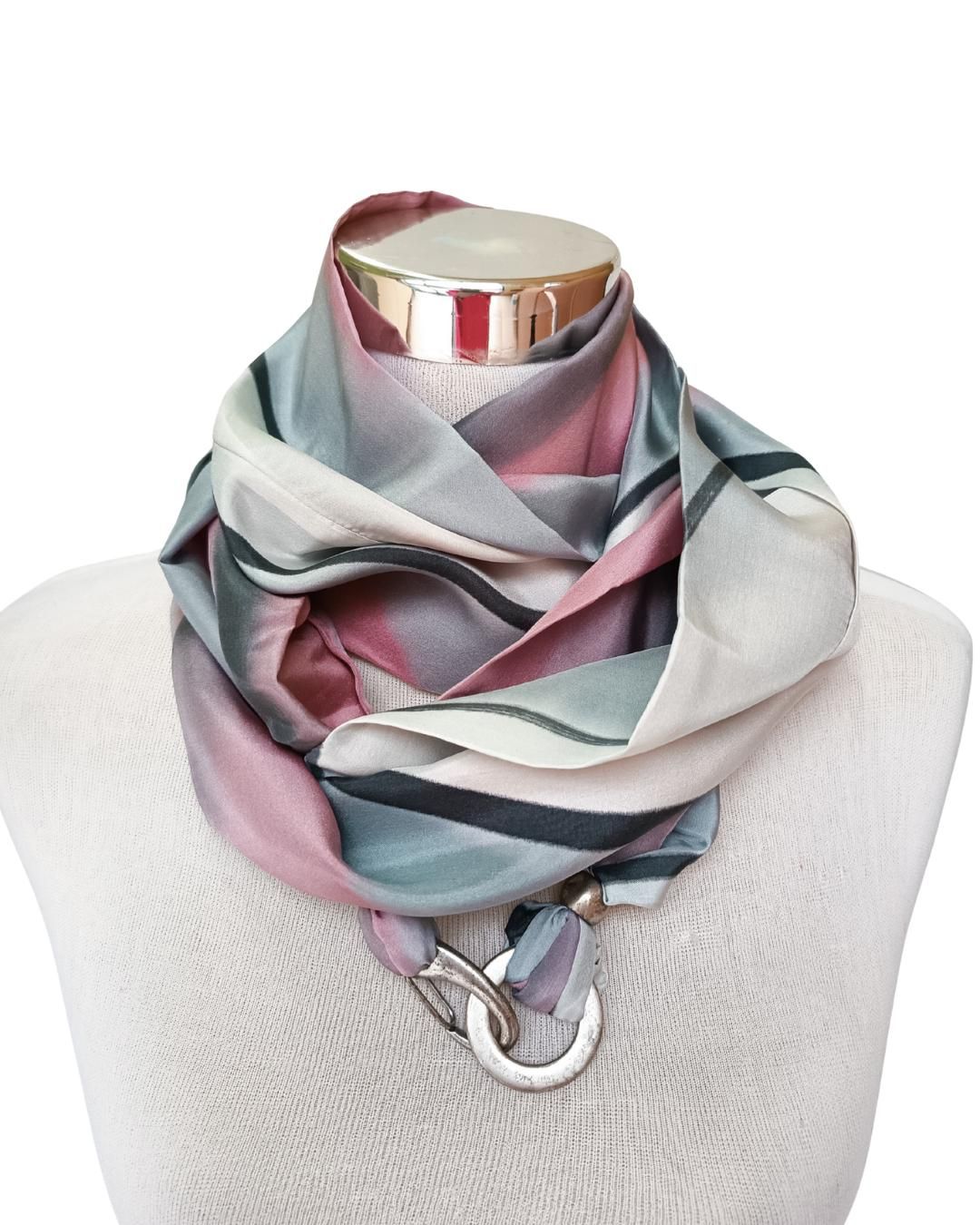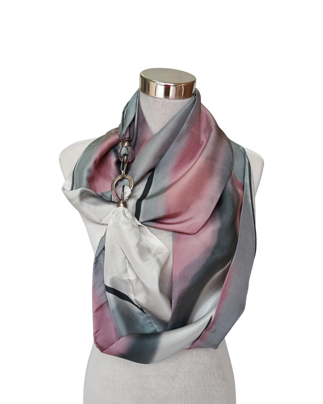 Pañuelo de seda Habotai pintado a mano, rosa, gris y blanco, cierre de broche.